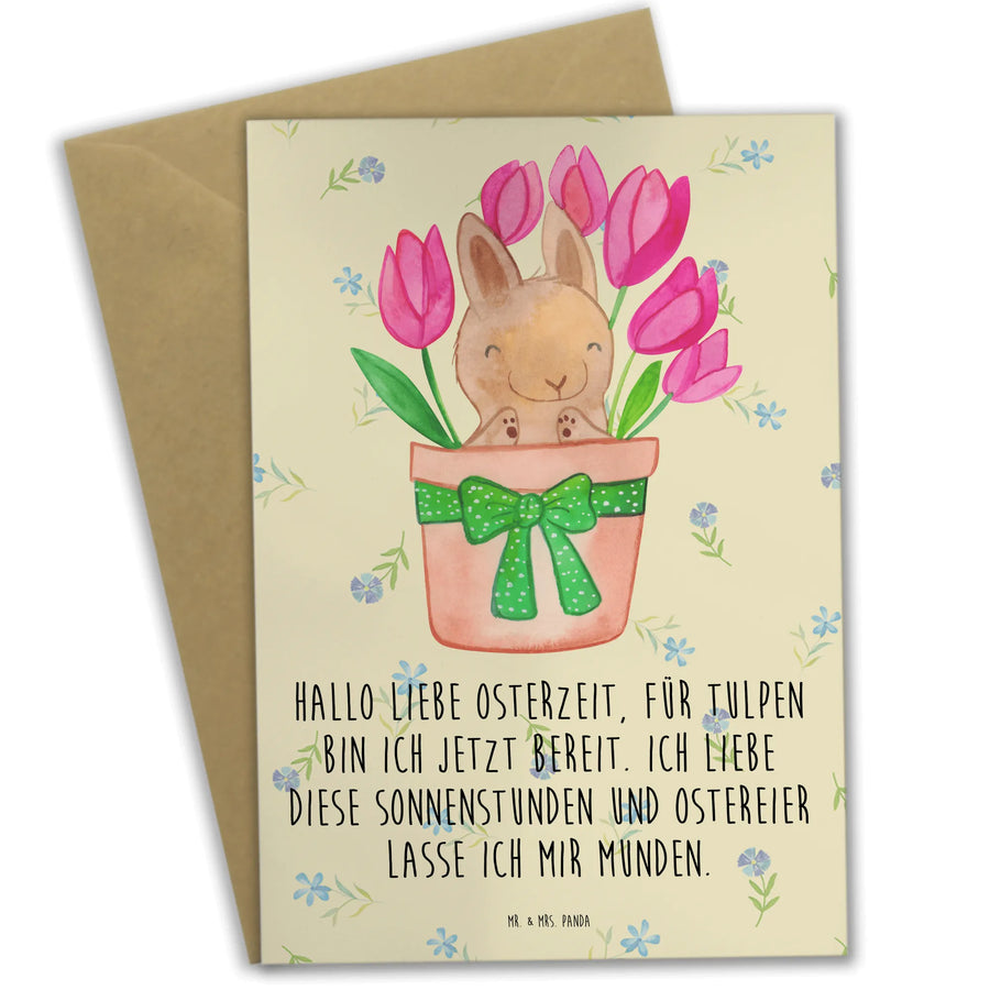 Mit dem liebenswerten Slogan "Hallo liebe Osterzeit, für Tulpen bin ich jetzt bereit. Ich liebe diese Sonnenstunden und Ostereier lasse ich mir munden." bringt die Karte das perfekte Ostergefühl direkt zu dir nach Hause. Sie wurde von Mrs. Panda mit viel Liebe und Leidenschaft handgezeichnet, und zeigt, wie viel Freude und Wärme Ostern mit sich bringt.