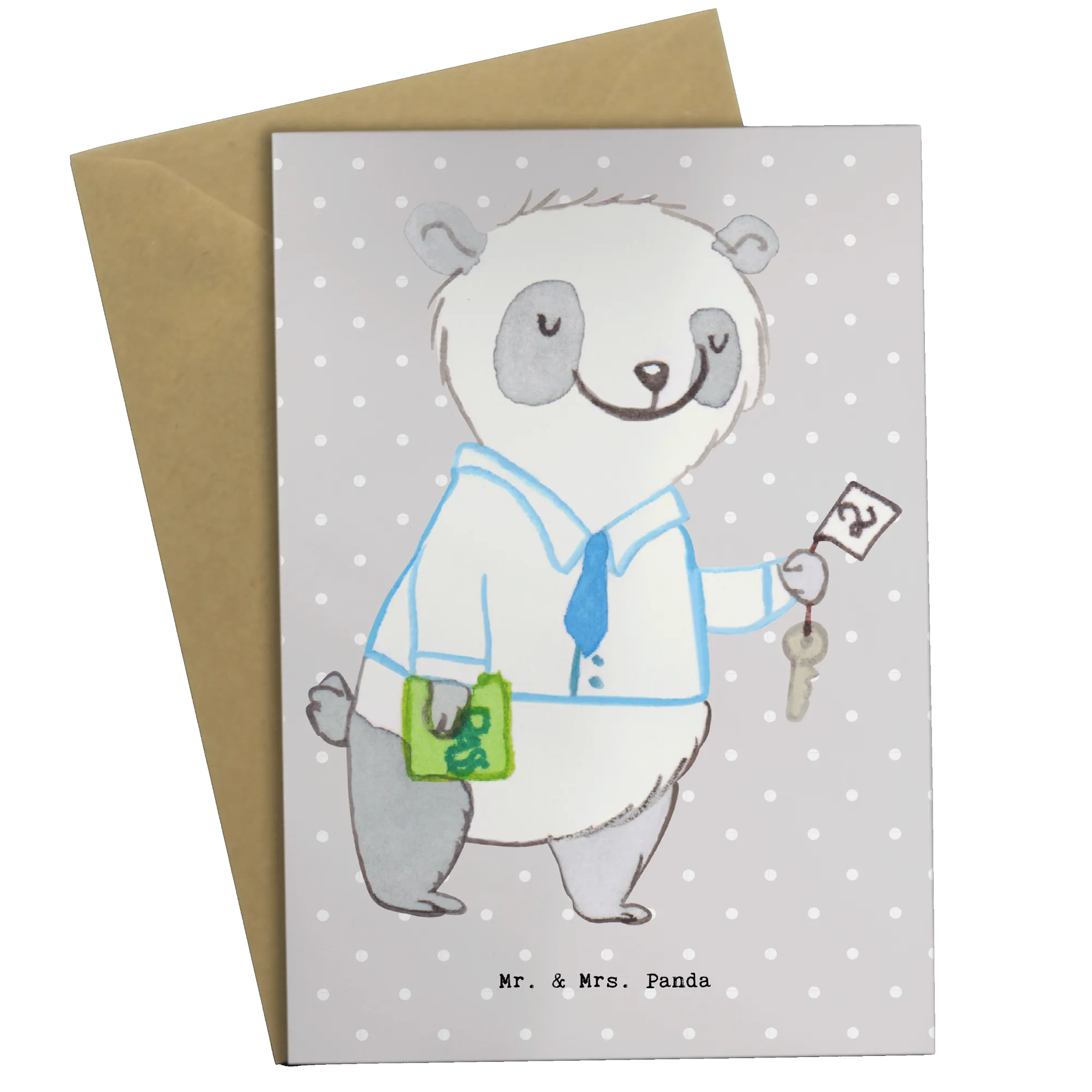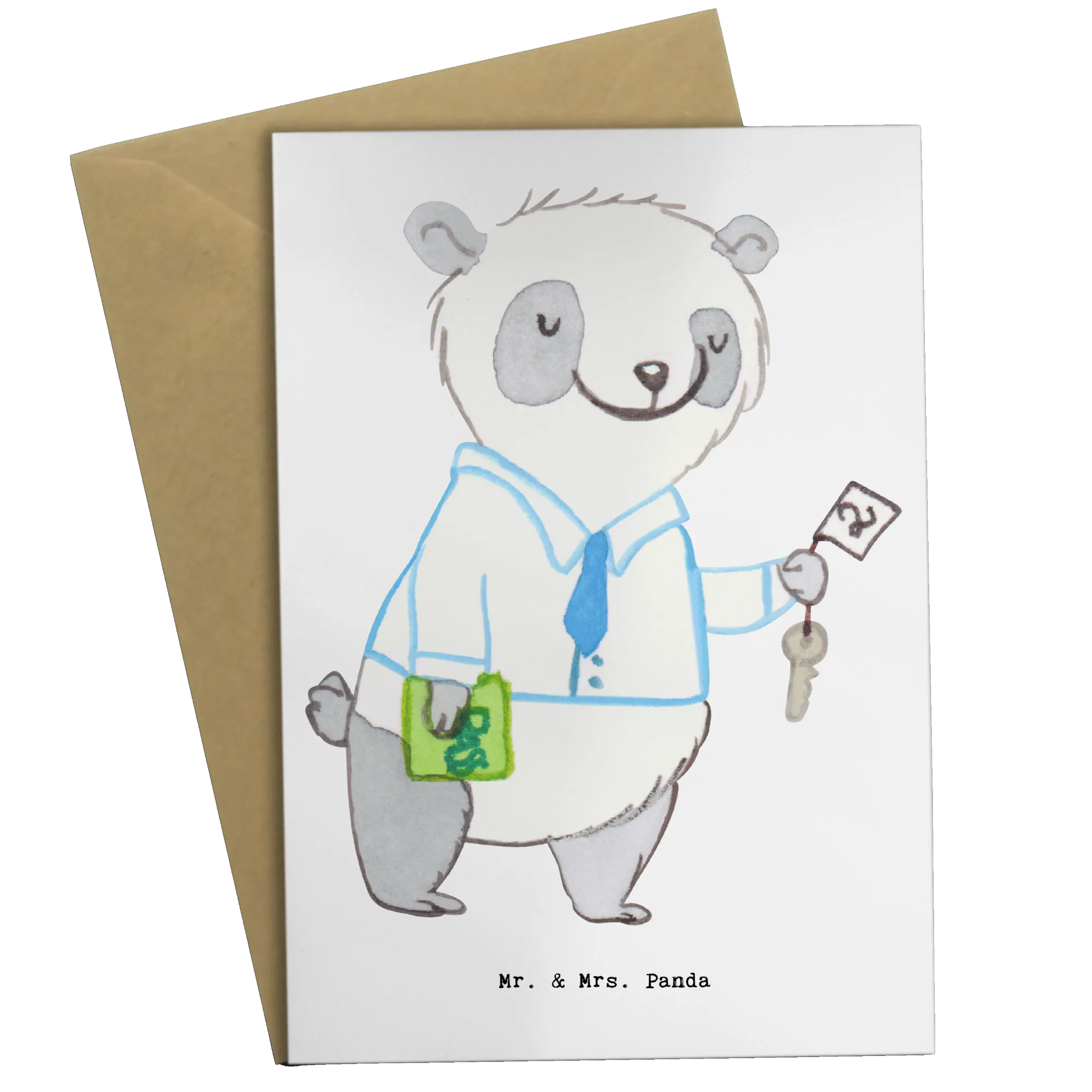 Die Grußkarte "Hotelkaufmann mit Herz" von Mr. & Mrs. Panda ist das perfekte Geschenk für jeden Hotelfachmann, Hotelier oder Mitarbeiter aus der Hotelbranche. Mit ihrem charmanten Design, das einen süßen Bären zeigt, der mit einem Telefon und frischen Handtüchern jongliert, bringt diese Karte ein Lächeln auf jedes Gesicht.