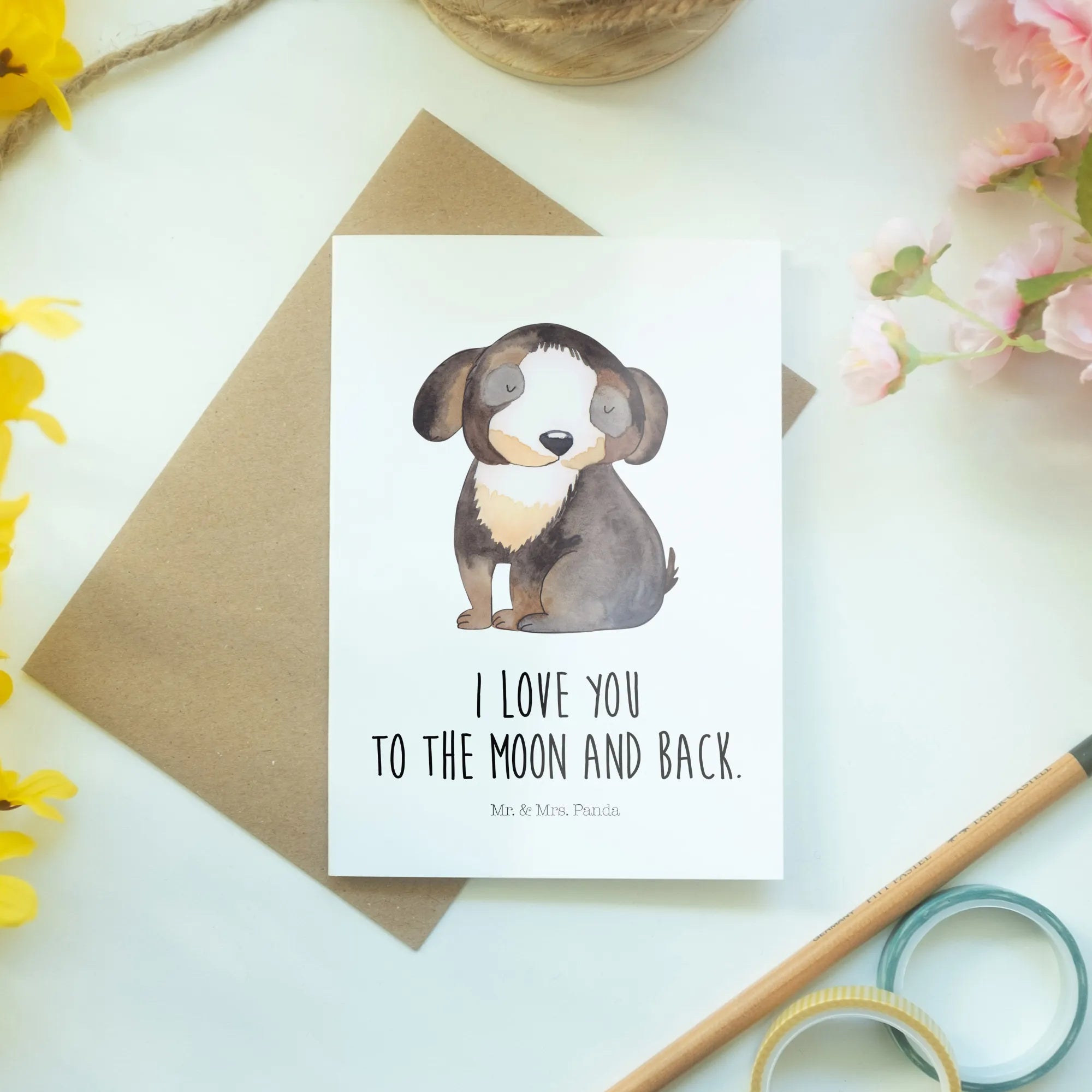 Die Hunde Kollektion von Mr. & Mrs. Panda wird mit viel Liebe gestaltet und enthält zahlreiche Produkte, die das Leben mit Hunden noch schöner machen. Die Grußkarte bietet sich perfekt an, wenn du einem Freund, der ein Haustier hat, eine Freude machen möchtest oder einfach nur deinen eigenen Hund mit einem kleinen Geschenk für seine bedingungslose Liebe zu danken.