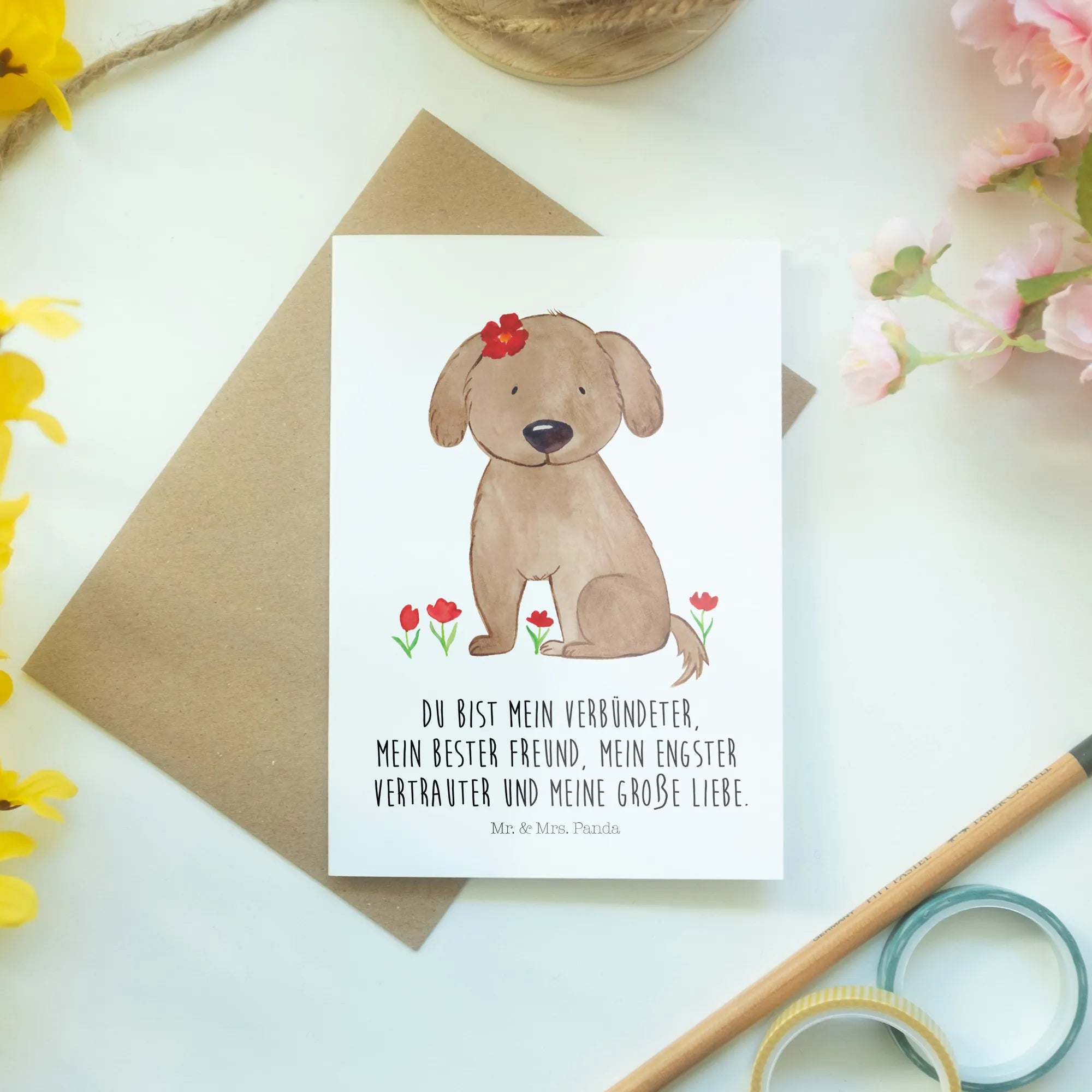 Die wunderschöne Grußkarte "Hund Hundedame" aus der Hunde Kollektion von Mr. & Mrs. Panda ist das perfekte Geschenk für alle Hundeliebhaber und Hundebesitzer! Diese Karte ist nicht nur ein einfacher Gruß, sondern eine liebevolle Botschaft, die die besondere Verbindung zwischen Mensch und Hund feiert. Mit dem süßen Motiv einer Hundedame, die eine Blume auf dem Kopf trägt, und dem zauberhaften Spruch: "Du bist mein Verbündeter, mein bester Freund, mein engster Vertrauter und meine große Liebe." wird jeder Gruß zu etwas ganz Besonderem.