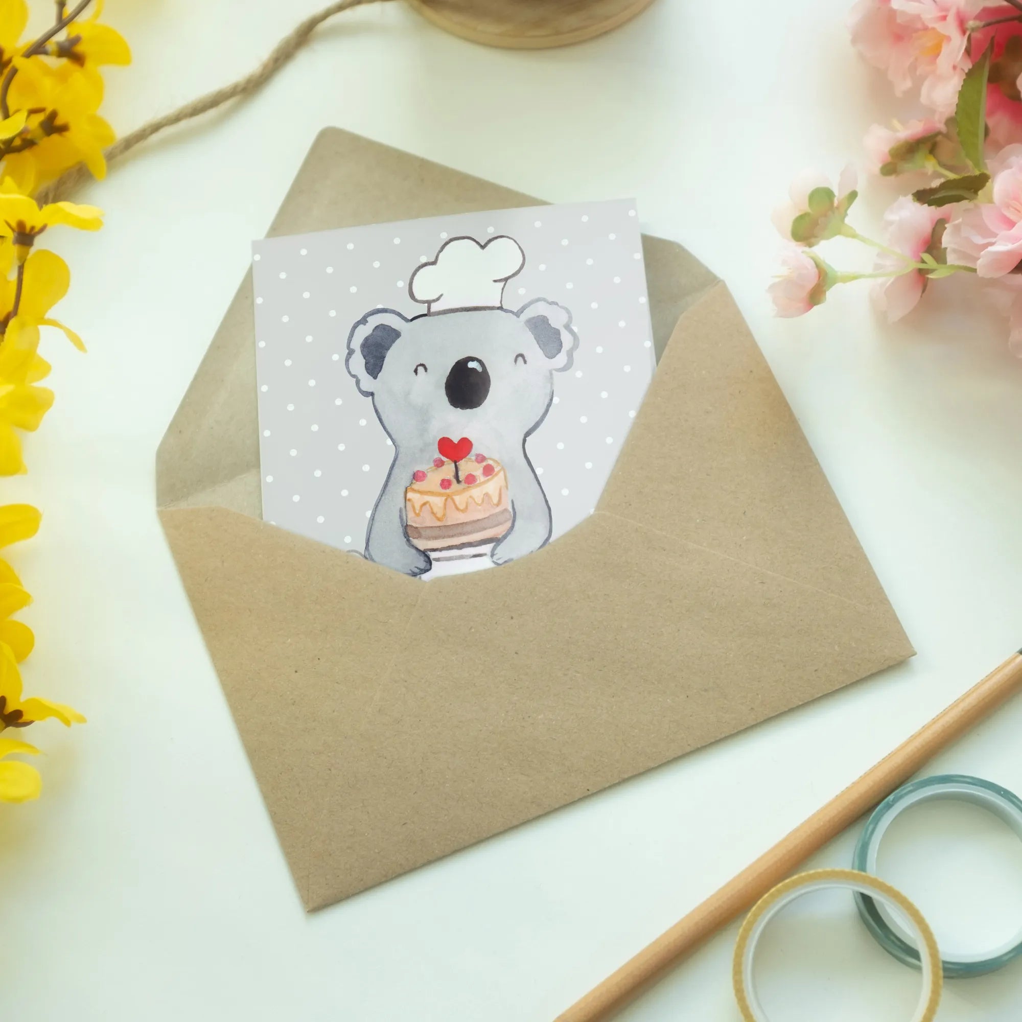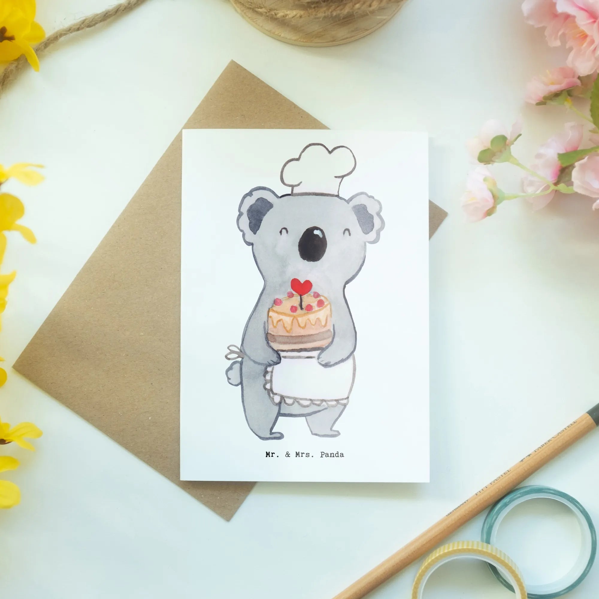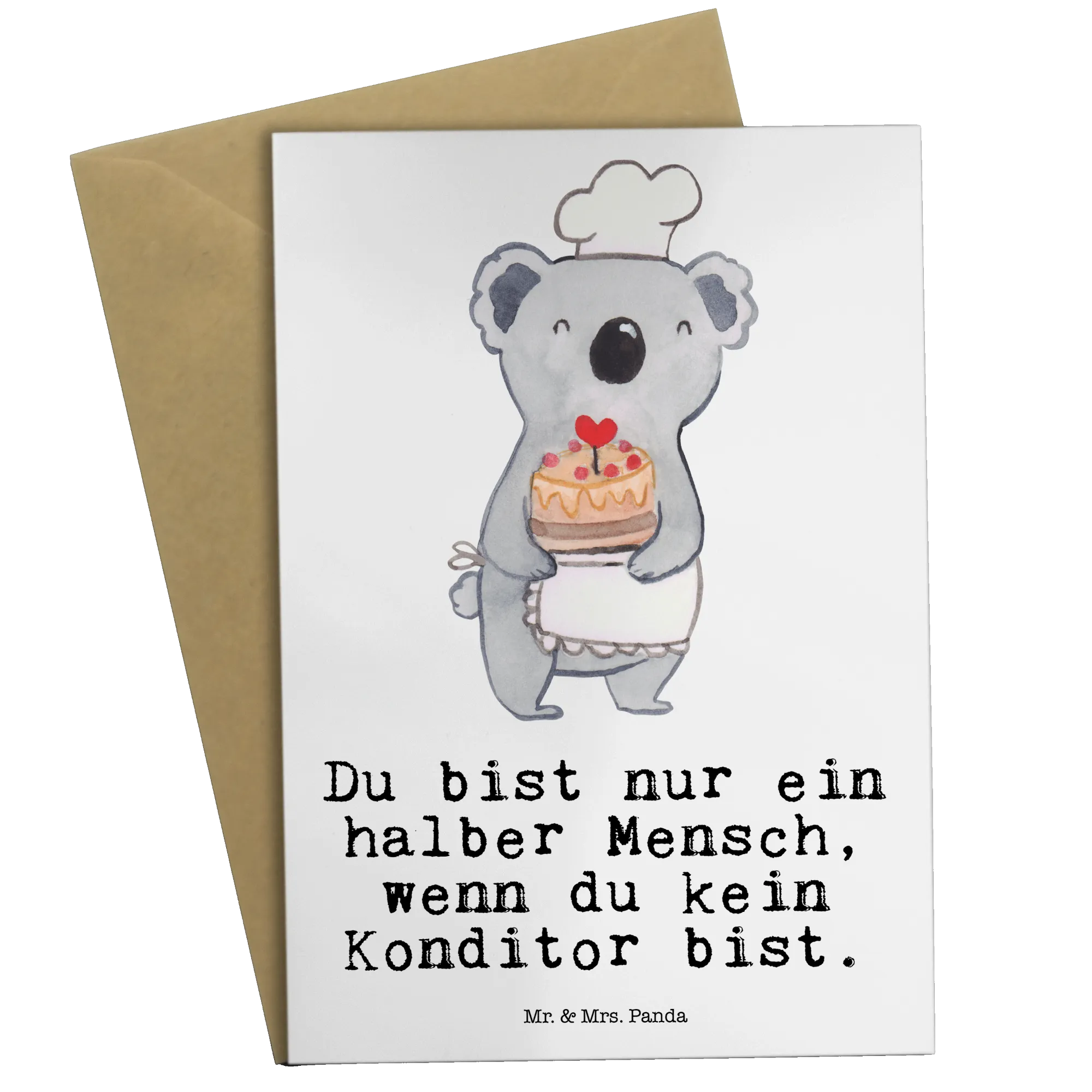 Die Grußkarte "Konditor mit Herz" von Mr. & Mrs. Panda ist das perfekte Geschenk für alle, die eine Leidenschaft für das Backen und die Patisserie haben. Diese Karte, mit ihrem süßen und liebevollen Design, zeigt einen stolzen Koala, der eine herrliche Torte hält.