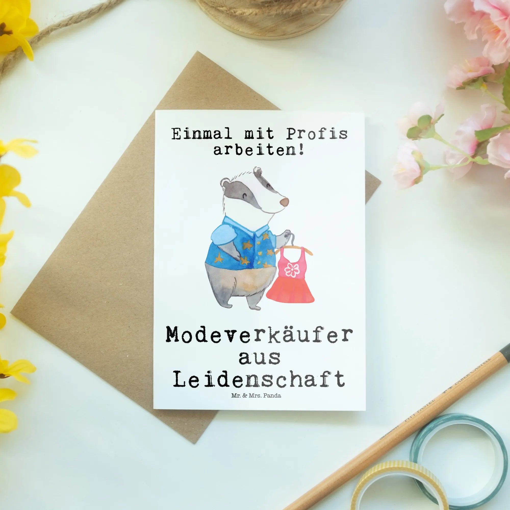 Entdecke die zauberhafte Grußkarte "Modeverkäufer aus Leidenschaft" von Mr. & Mrs. Panda – die perfekte Möglichkeit, deinen Stil und deine Leidenschaft für Mode auszudrücken!