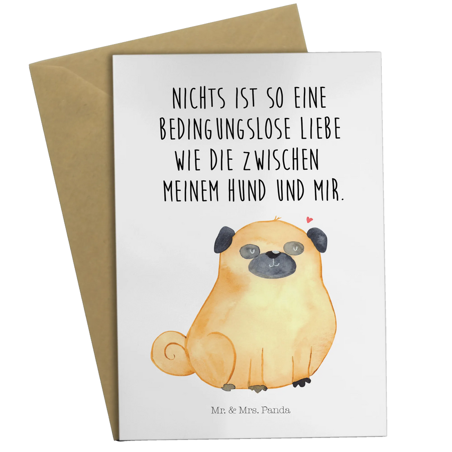 Wenn du die perfekte Grußkarte für einen tierlieben Menschen suchst, ist die wunderschöne Grußkarte mit dem süßen Mops-Motiv von Mr. & Mrs. Panda genau das Richtige! Diese einzigartige Klappkarte ist nicht nur ästhetisch ansprechend, sondern auch eine wunderschöne Möglichkeit, deine Wertschätzung und Liebe zu zeigen. Mit dem Spruch „Nichts ist so eine bedingungslose Liebe wie die zwischen meinem Hund und mir“ wird jeder Hundebesitzer sofort angesprochen.