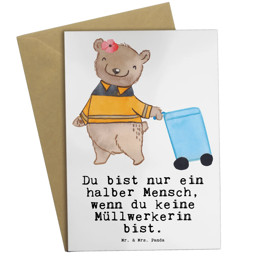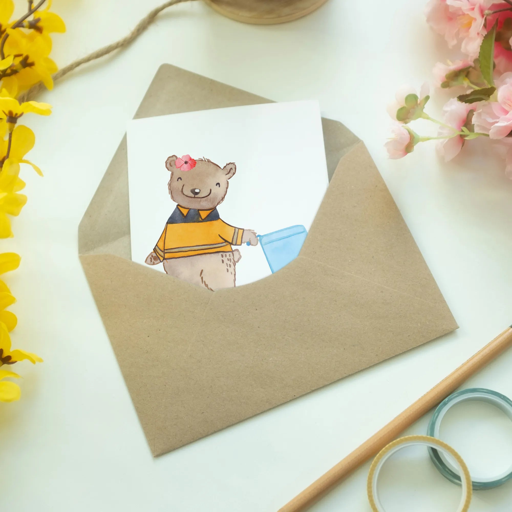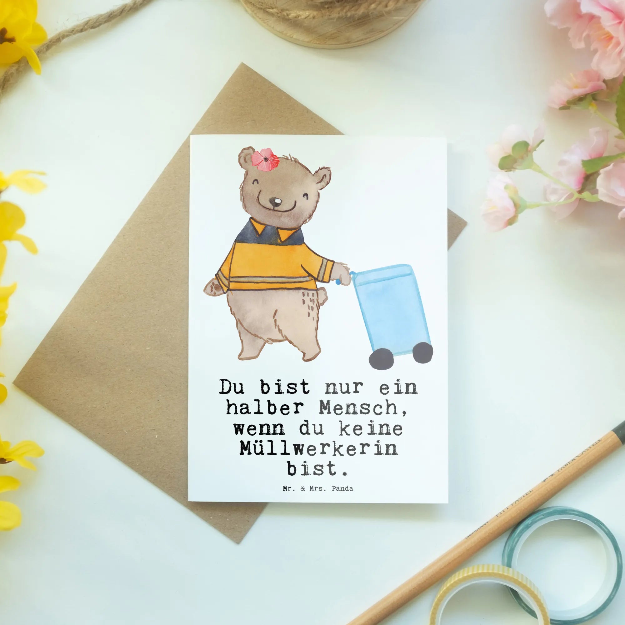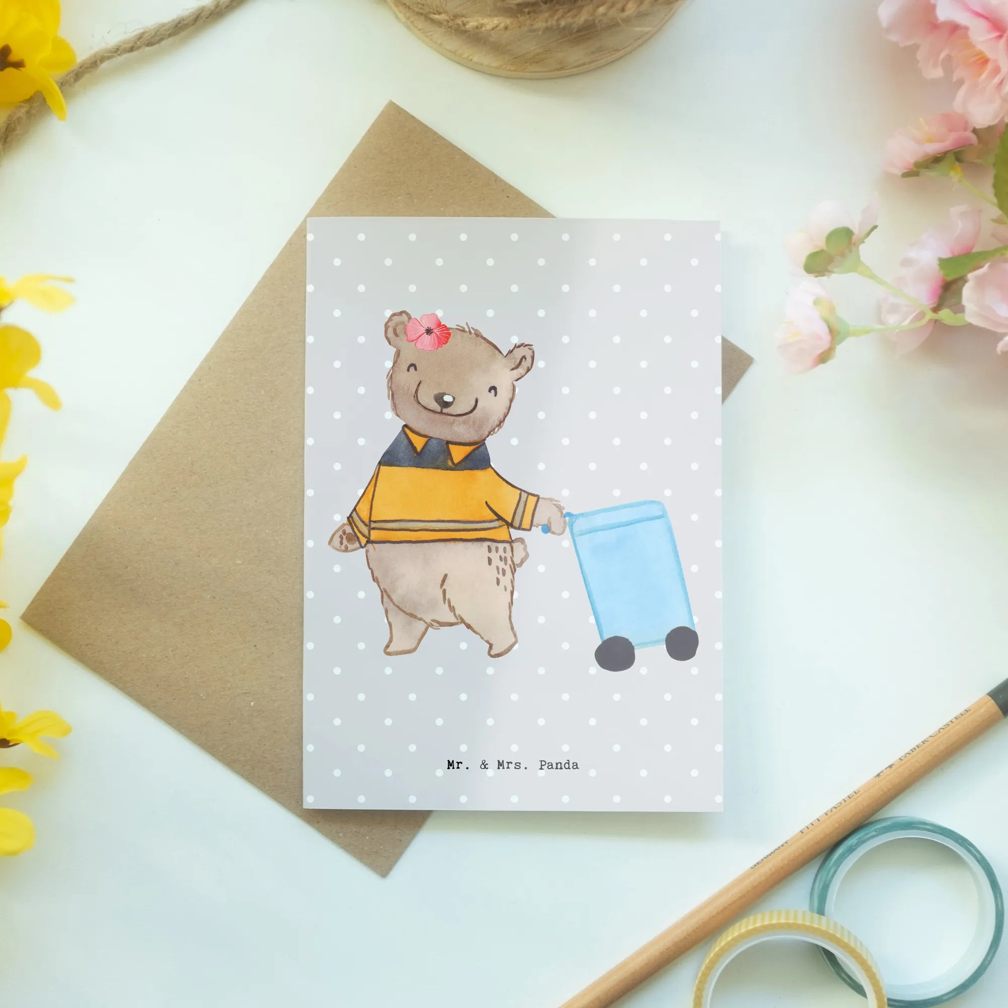Die Grußkarte "Müllwerkerin mit Herz" von Mr. & Mrs. Panda ist das perfekte Geschenk für alle, die in der Kreislauf- und Abfallwirtschaft tätig sind. Mit einem bunten und fröhlichen Design, das eine niedliche Bärendame zeigt, die eine Papiertonne hinter sich herzieht, bringt diese Karte ein Lächeln auf jedes Gesicht.