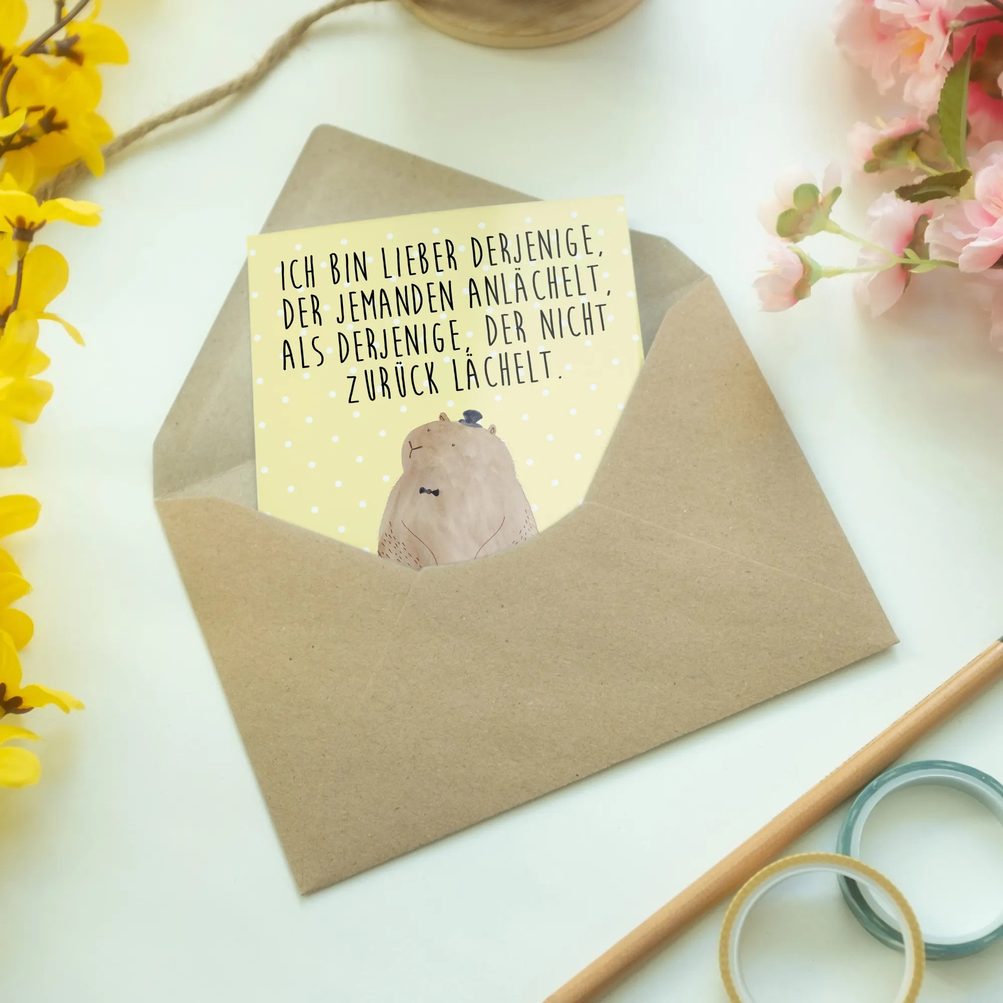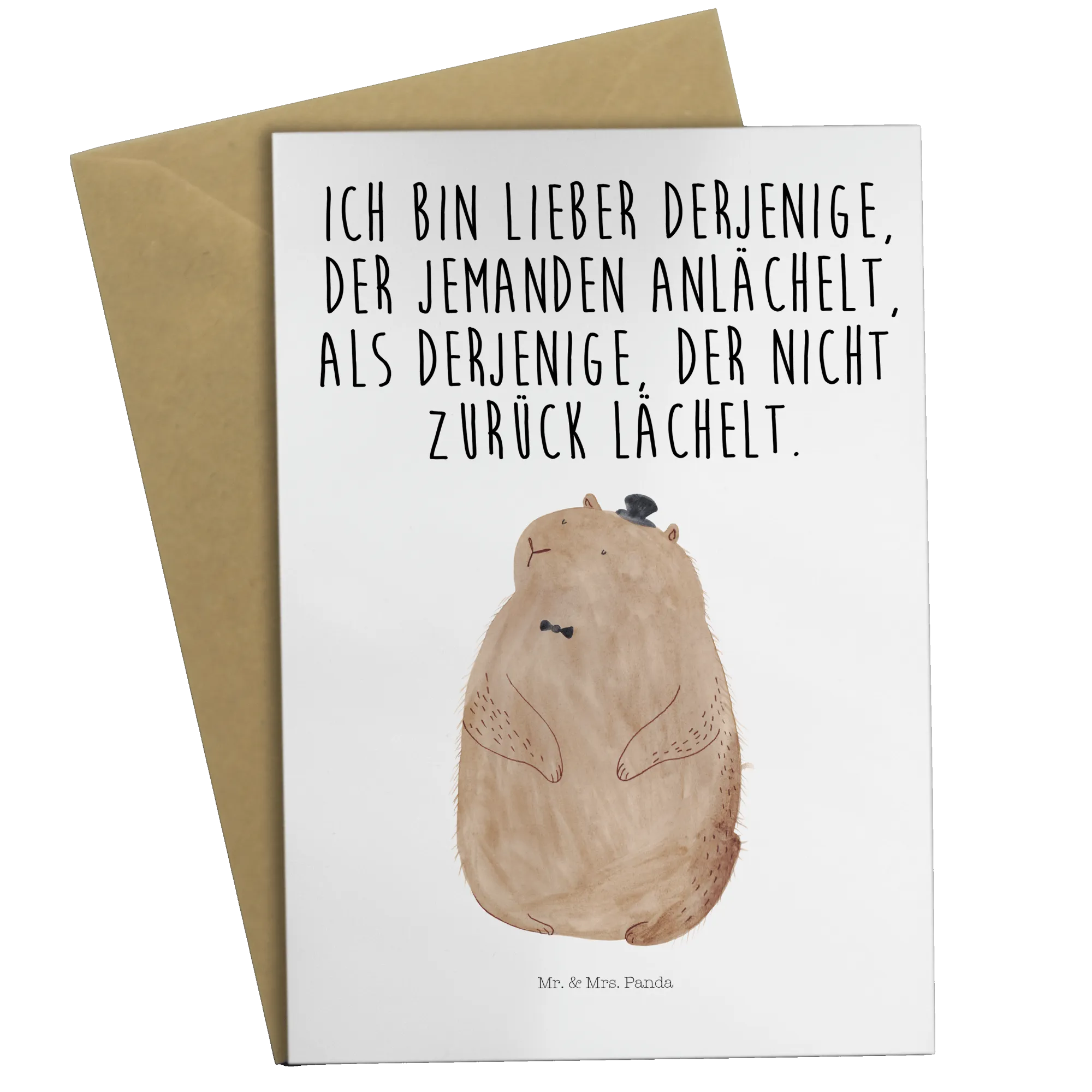Das zauberhafte Murmeltier, das mit einem kleinen Zylinder geschmückt ist, vermittelt eine Botschaft der Freundlichkeit und Fröhlichkeit. Der Spruch "Ich bin lieber derjenige, der jemanden anlächelt, als derjenige, der nicht zurück lächelt" ziert die Vorderseite der Karte und regt dazu an, Positivität in die Welt zu tragen.