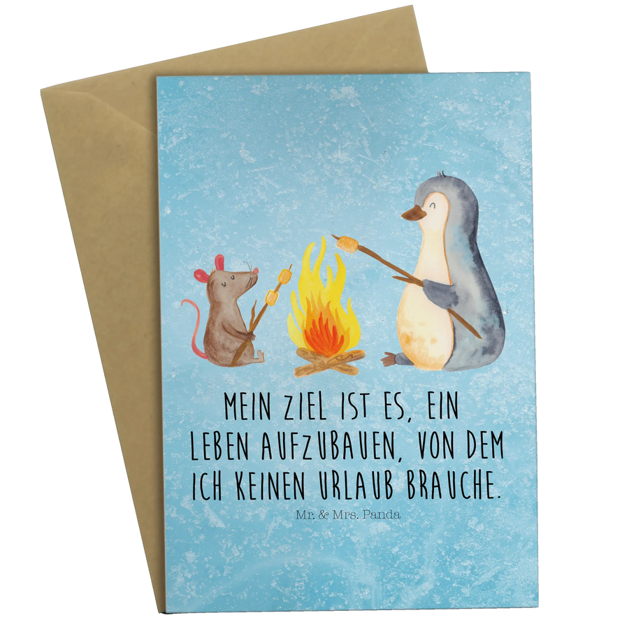 Entdecke die bezaubernde Grußkarte mit dem Motiv "Pinguin Lagerfeuer" aus unserer beliebten Pinguin-Kollektion von Mr. & Mrs. Panda!