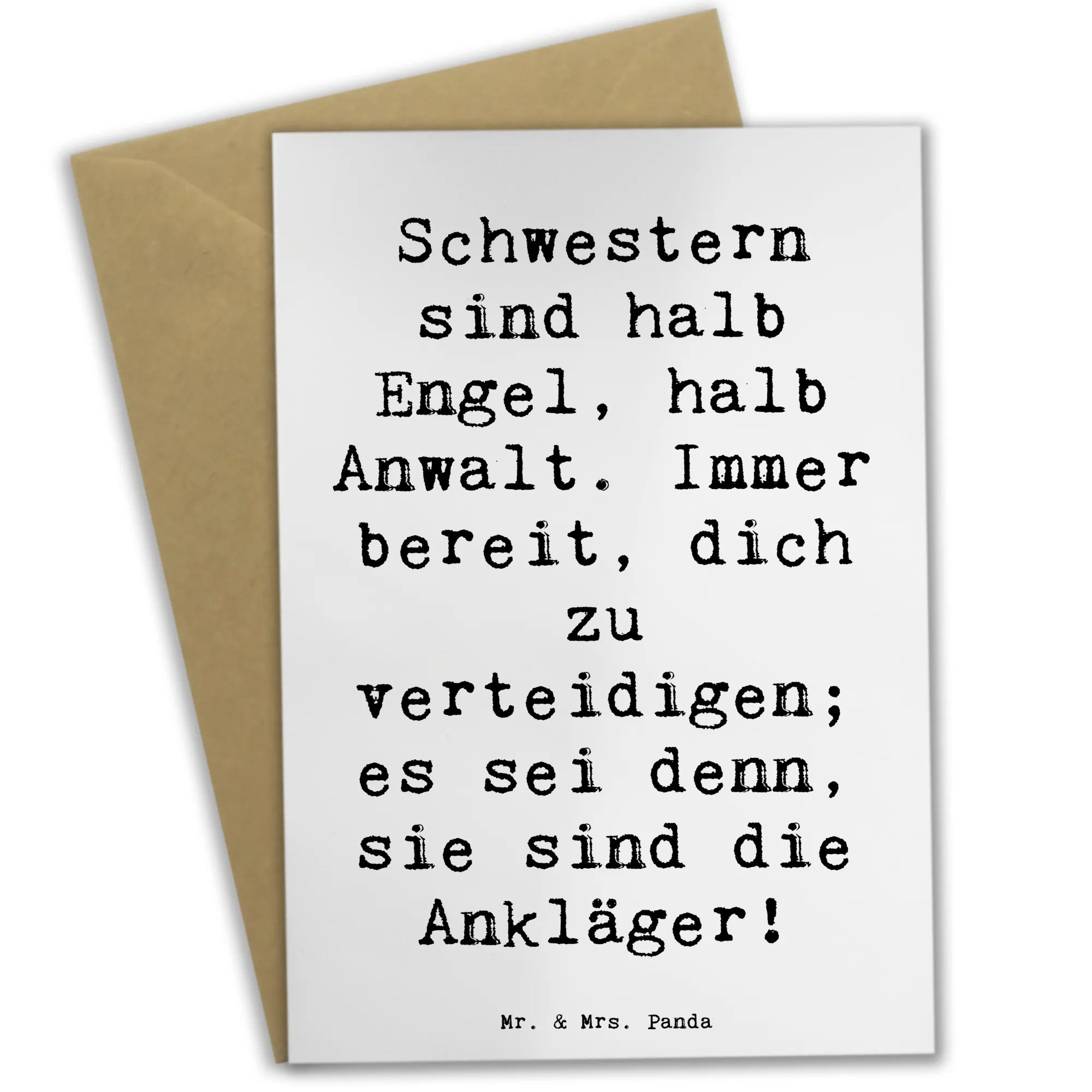 Eine Karte, die Herz und Humor verbindet: Diese Grußkarte von Mr. & Mrs. Panda ist die perfekte Wahl, wenn Du Deiner Schwester mit einem Lächeln eine große Freude machen möchtest. Auf der Vorderseite prangt der charmante Spruch: "Schwestern sind halb Engel, halb Anwalt. Immer bereit, dich zu verteidigen; es sei denn, sie sind die Ankläger!" – ein Satz, der die besondere Mischung aus Liebe, Loyalität und neckischem Streit treffend beschreibt.