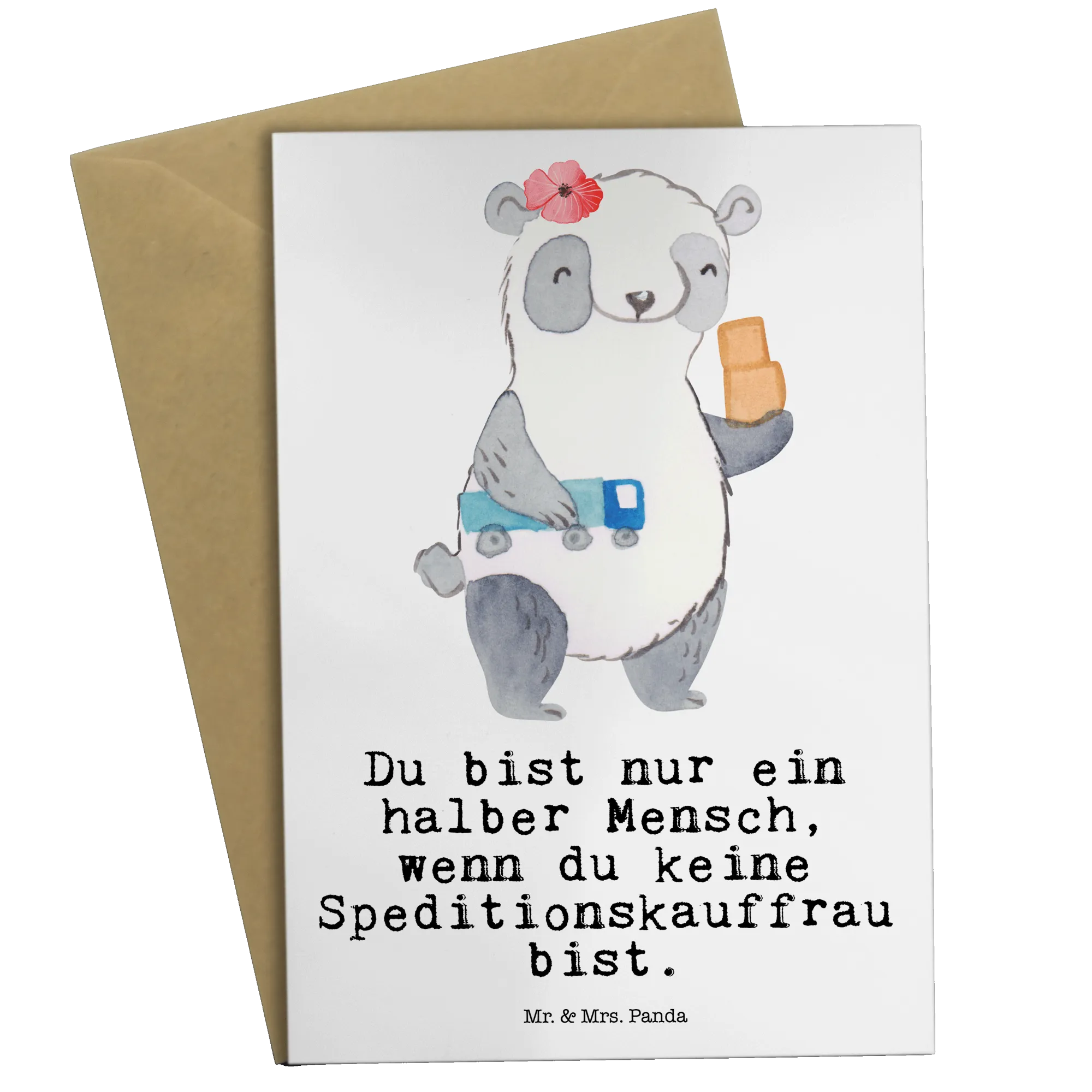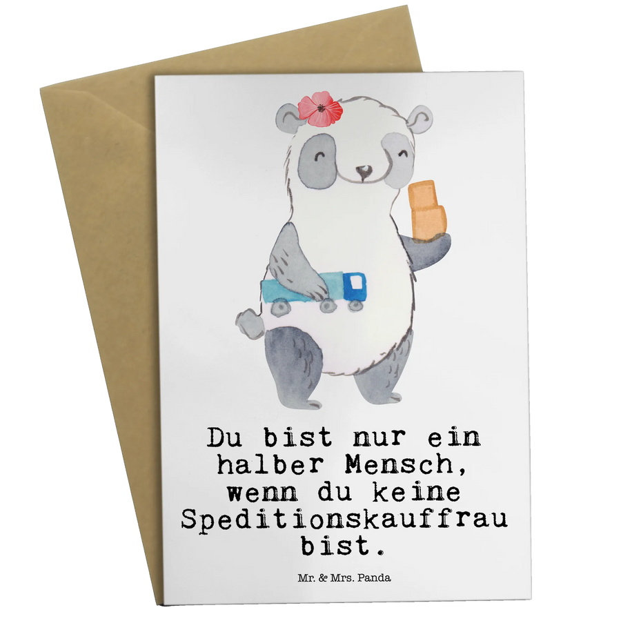 Die Grußkarte "Speditionskauffrau mit Herz" aus der kreativen Berufe Kollektion von Mr. & Mrs. Panda ist ein ganz besonderes Geschenk für alle, die diesen wunderbaren Beruf ausüben. Mit diesem liebevoll gestaltetem Motiv und dem spritzigen Slogan "Du bist nur ein halber Mensch, wenn du keine Speditionskauffrau bist" kannst du ganz besondere Grüße und Glückwünsche übermitteln.