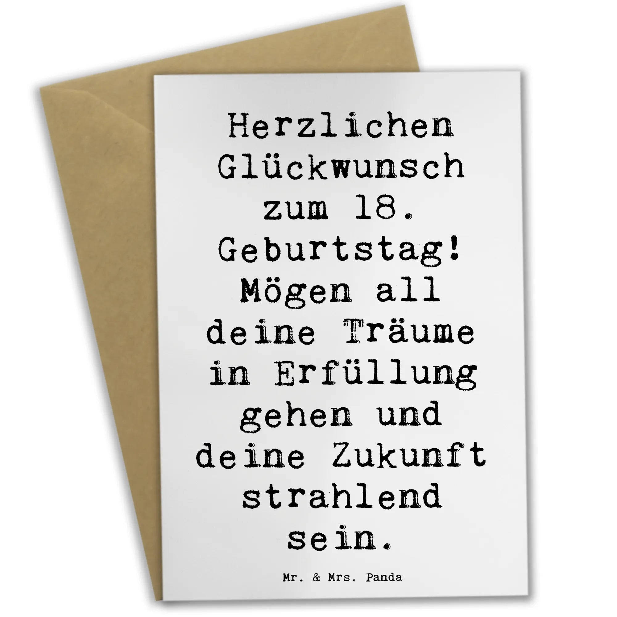 Du suchst nach dem perfekten Geschenk für einen ganz besonderen Anlass? Diese einzigartige Grußkarte von Mr. & Mrs. Panda ist genau das Richtige, um zum 18. Geburtstag zu gratulieren! Die Karte ist mit dem liebevollen Spruch "Herzlichen Glückwunsch zum 18. Geburtstag! Mögen all deine Träume in Erfüllung gehen und deine Zukunft strahlend sein." versehen und wird mit viel Liebe und einem süßen Design von uns gestaltet. Sie eignet sich hervorragend für Freunde, Verwandte und Kollegen, die ihren 18. Geburtstag feiern.
