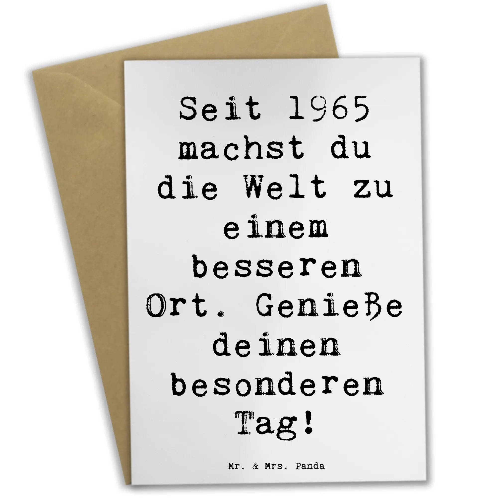 Entdecke die bezaubernde Grußkarte '1965 Geburtstag' von Mr. & Mrs. Panda – ein ideales Geschenk für all jene, die in diesem besonderen Jahr das Licht der Welt erblickt haben! Diese hochwertige Grußkarte ist ein wahres Unikat und eignet sich hervorragend, um Glückwünsche zu überbringen oder eine herzliche Einladung zu einem unvergesslichen Geburtstag zu gestalten. Das spezielle Motiv zeigt den liebevollen Spruch: 'Seit 1965 machst du die Welt zu einem besseren Ort. Genieße deinen besonderen Tag!' und verbreitet damit sofort gute Laune.