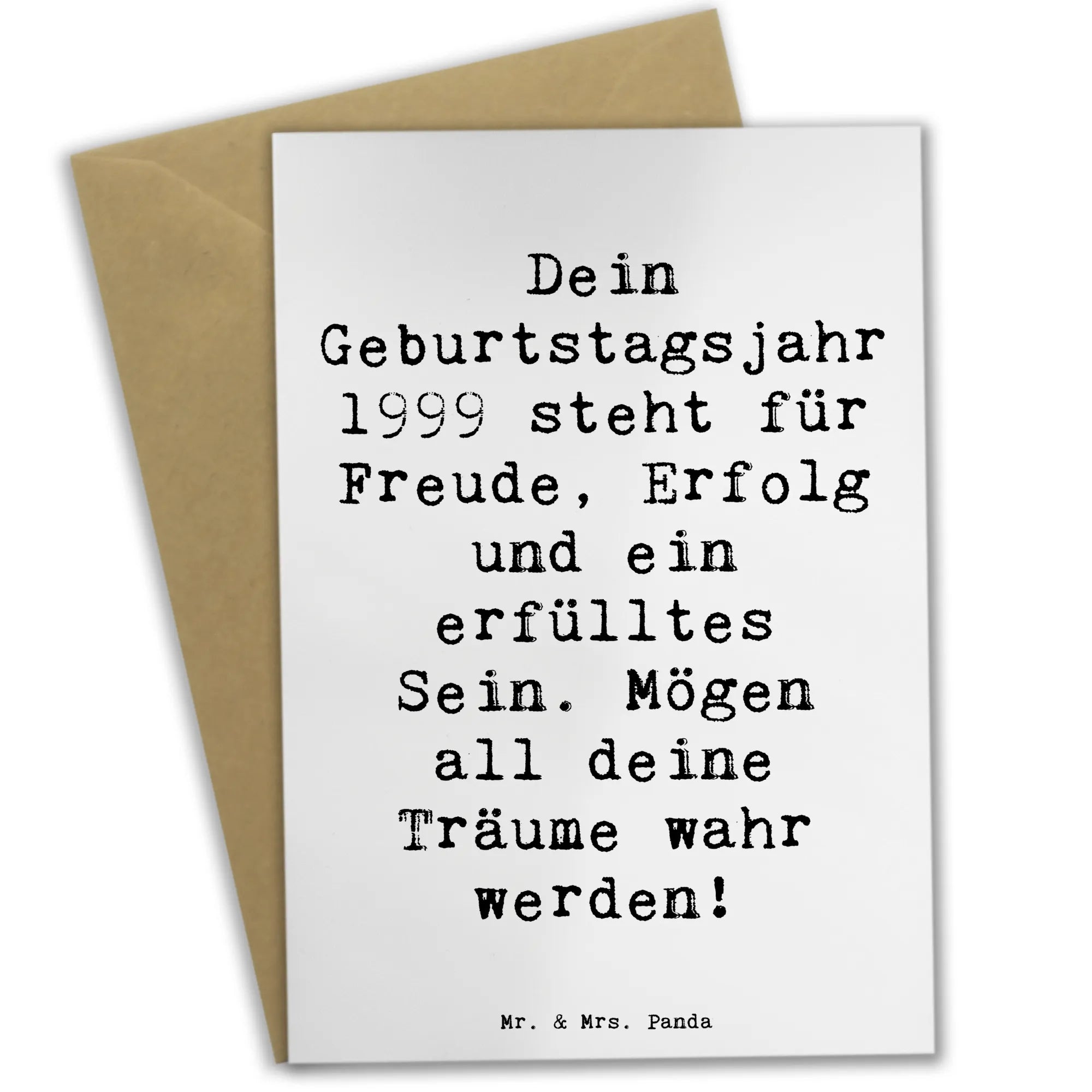 Die Grußkarte "Dein Geburtstagsjahr 1999" von Mr. & Mrs. Panda ist das perfekte Geschenk für alle, die ihren besonderen Tag mit Freude und einem Hauch von Nostalgie feiern möchten. Seit 1999 erleuchten die Menschen auf dieser Welt mit ihrer individuellen Strahlkraft, und diese Karte fängt genau dieses Gefühl ein. Bedruckt mit dem liebenswerten Spruch "Dein Geburtstagsjahr 1999 steht für Freude, Erfolg und ein erfülltes Sein. Mögen all deine Träume wahr werden!" ist sie ideal, um deine herzlichen Glückwünsche zu übermitteln oder einfach nur um die Bedeutung eines Geburtstags zu würdigen. Die detailverliebte Gestaltung zeigt, wie besonders das Jahr 1999 war und regt sicherlich schöne Erinnerungen an.