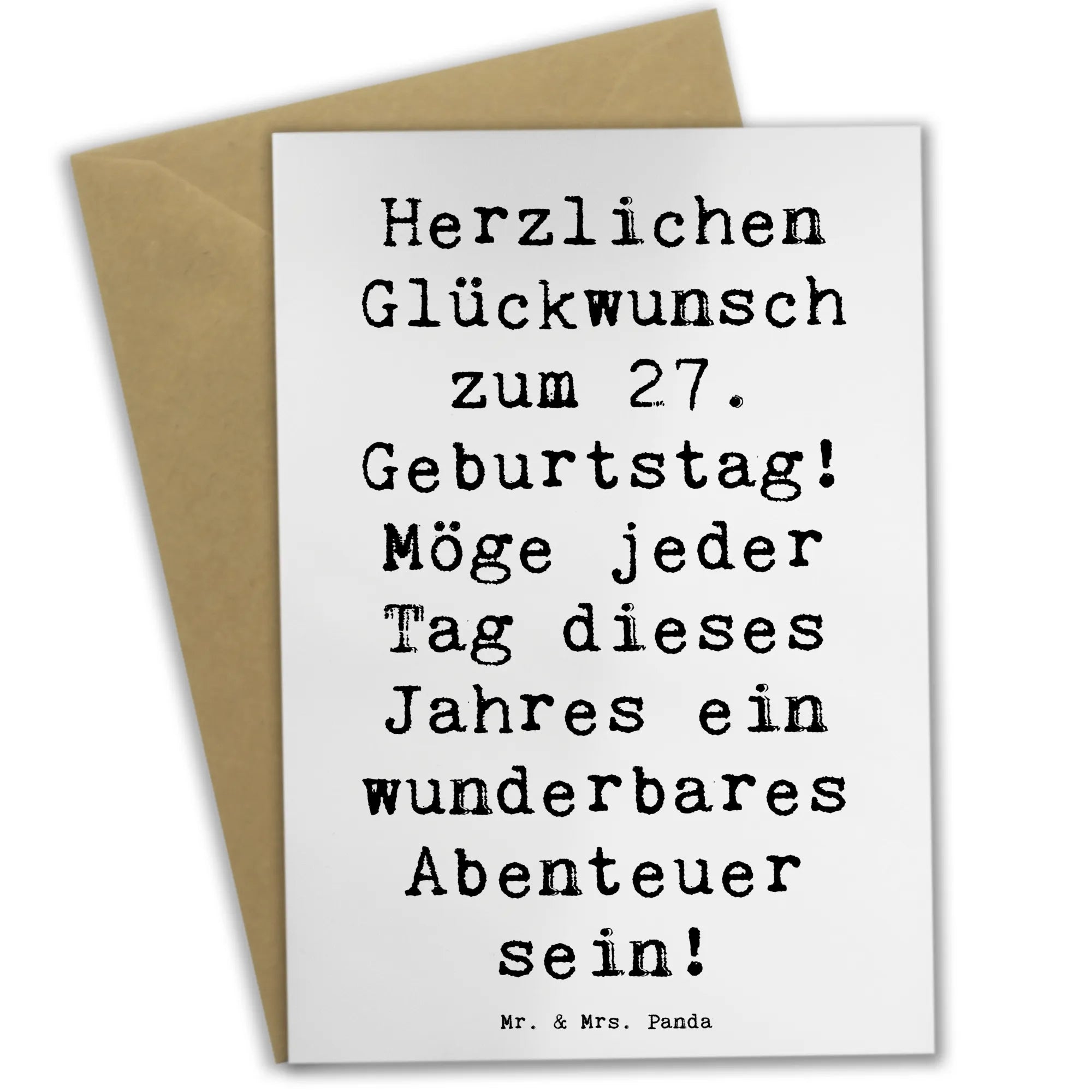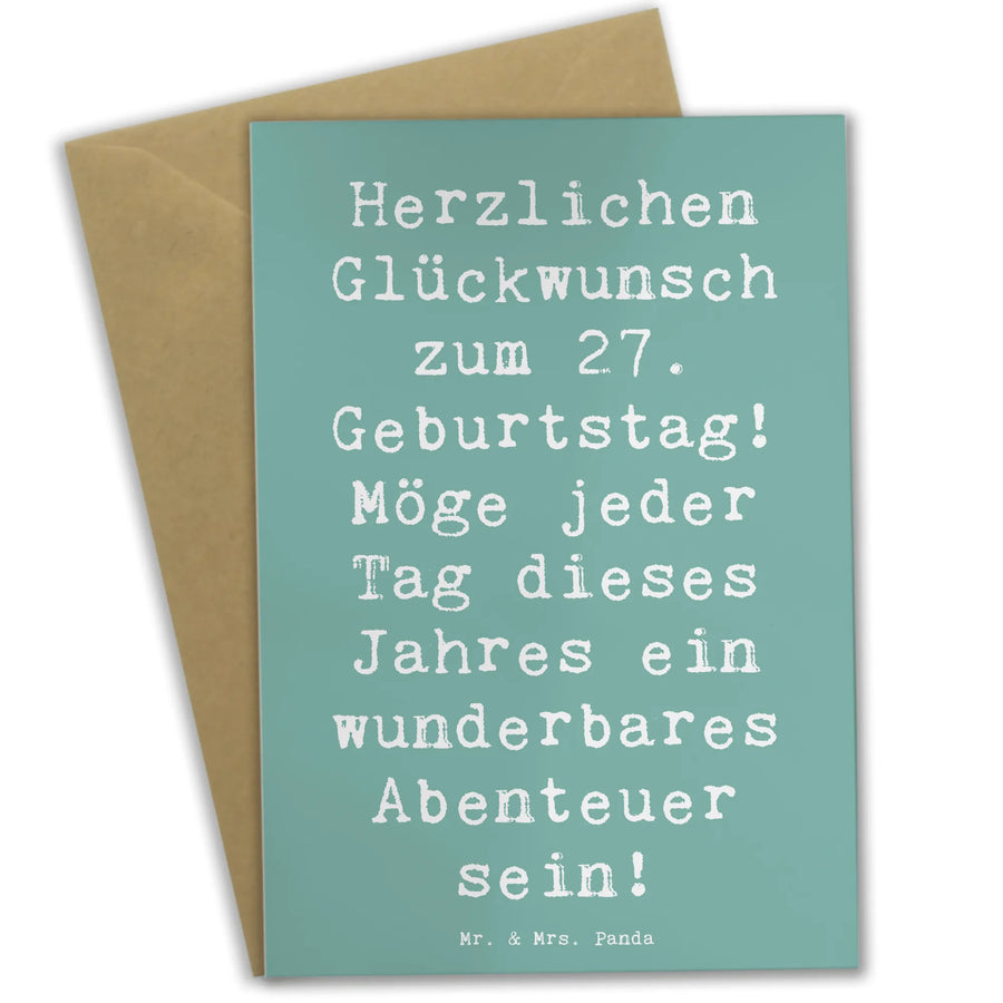 Die wunderschöne Grußkarte zum 27. Geburtstag von Mr. & Mrs. Panda ist das perfekte Geschenk, um einem ganz besonderen Menschen zu gratulieren! Diese liebevoll gestaltete Grußkarte gehört zur Kollektion „Geburtstag Alter“ und kommt bedruckt mit dem einladenden Spruch: "Herzlichen Glückwunsch zum 27. Geburtstag! Möge jeder Tag dieses Jahres ein wunderbares Abenteuer sein!".