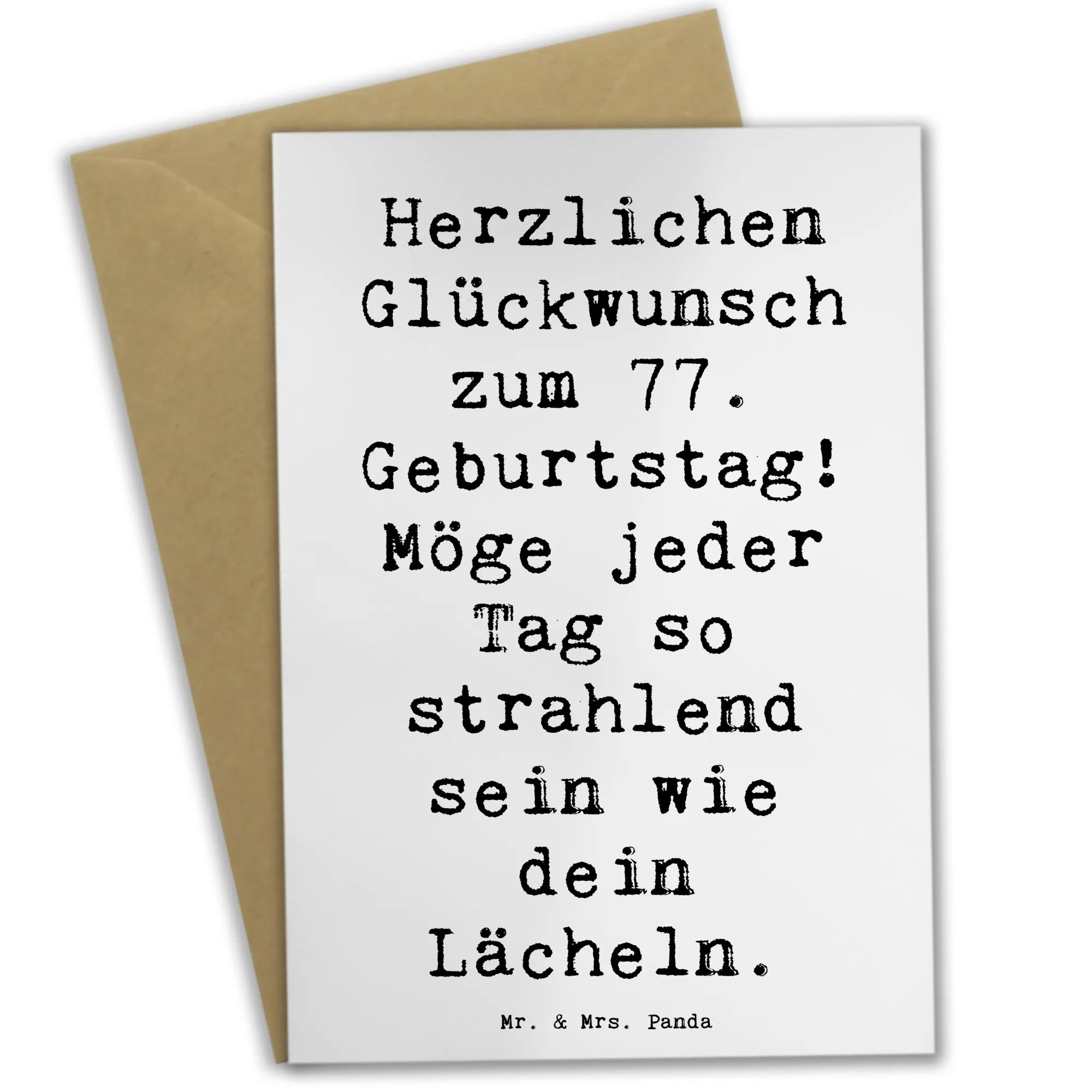 Eine wunderschöne und einzigartige Grußkarte von Mr. & Mrs. Panda zum 77. Geburtstag! Diese Karte ist das perfekte Geschenk für all diejenigen, die einen ganz besonderen Geburtstag feiern. Mit dem liebevollen Spruch "Herzlichen Glückwunsch zum 77. Geburtstag! Möge jeder Tag so strahlend sein wie dein Lächeln." bringt diese Karte Freude und Glück in das Leben des Beschenkten.
