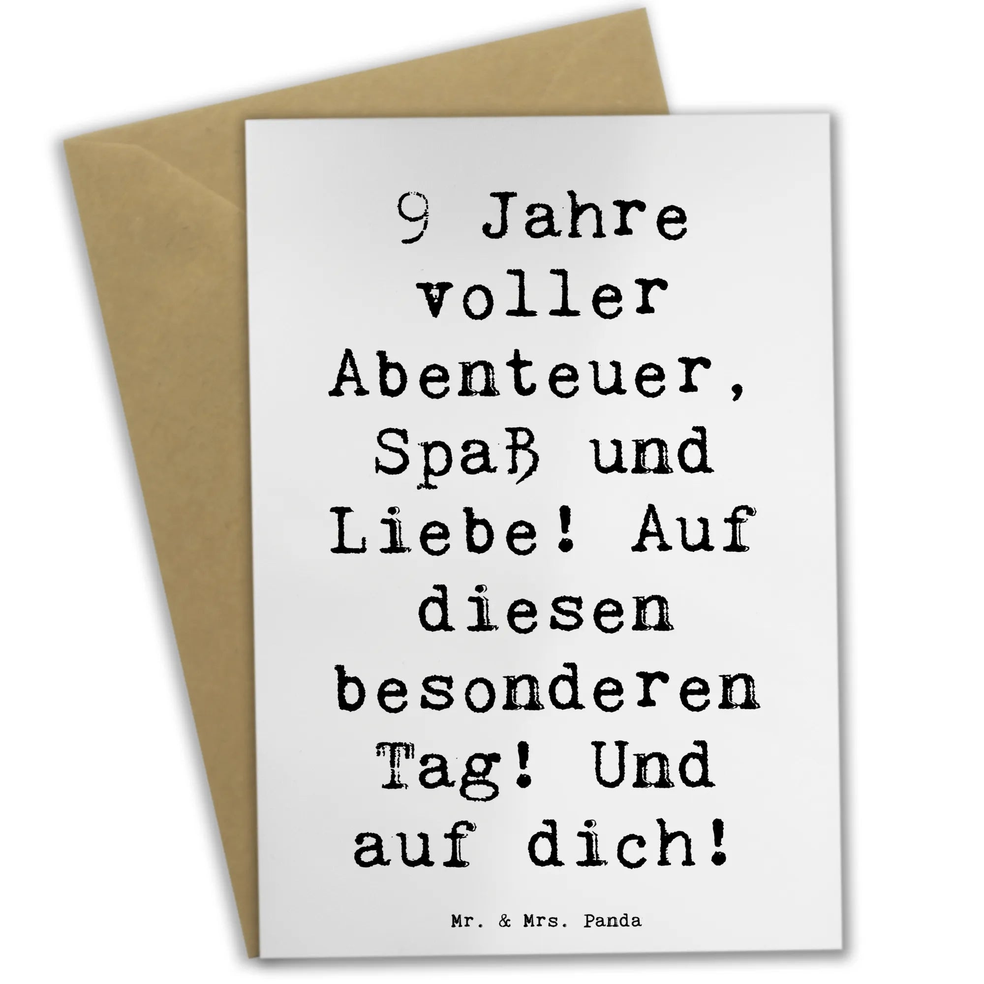 Erlebe die perfekte Grußkarte für den 9. Geburtstag mit unserem liebevollen Design von Mr. & Mrs. Panda! Diese zauberhafte Grußkarte, die im Hochformat mit dem herzlichen Spruch "9 Jahre voller Abenteuer, Spaß und Liebe! Auf diesen besonderen Tag! Und auf dich!" bedruckt ist, eignet sich hervorragend, um deinem Geburtstagskind eine ganz besondere Freude zu machen.