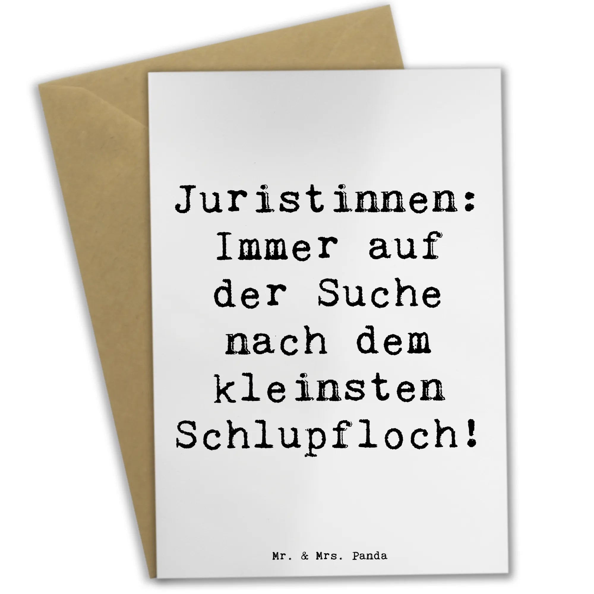 Die Grußkarte "Juristin" aus der Kollektion Berufe von Mr. & Mrs. Panda ist das perfekte Geschenk für alle Juristinnen, egal ob zur Berufseinstieg, zur Beförderung oder einfach nur als nette Geste. Diese wunderschöne und einzigartige Grußkarte ist aus hochwertigem, 300 Gramm schwerem Karton gefertigt und besticht durch ihre edel glänzende Oberfläche. Die Vorderseite zeigt den liebevoll gestalteten Spruch "Juristinnen: Immer auf der Suche nach dem kleinsten Schlupfloch!" – ein Lächeln garantiert!