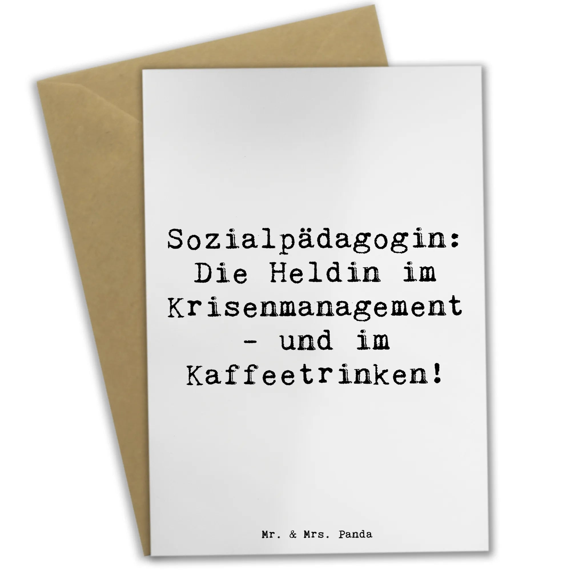 Bist du auf der Suche nach der perfekten Grußkarte für eine Sozialpädagogin? Dann ist unsere Grußkarte "Sozialpädagogin: Die Heldin im Krisenmanagement - und im Kaffeetrinken!" von Mr. & Mrs. Panda genau das Richtige für dich!