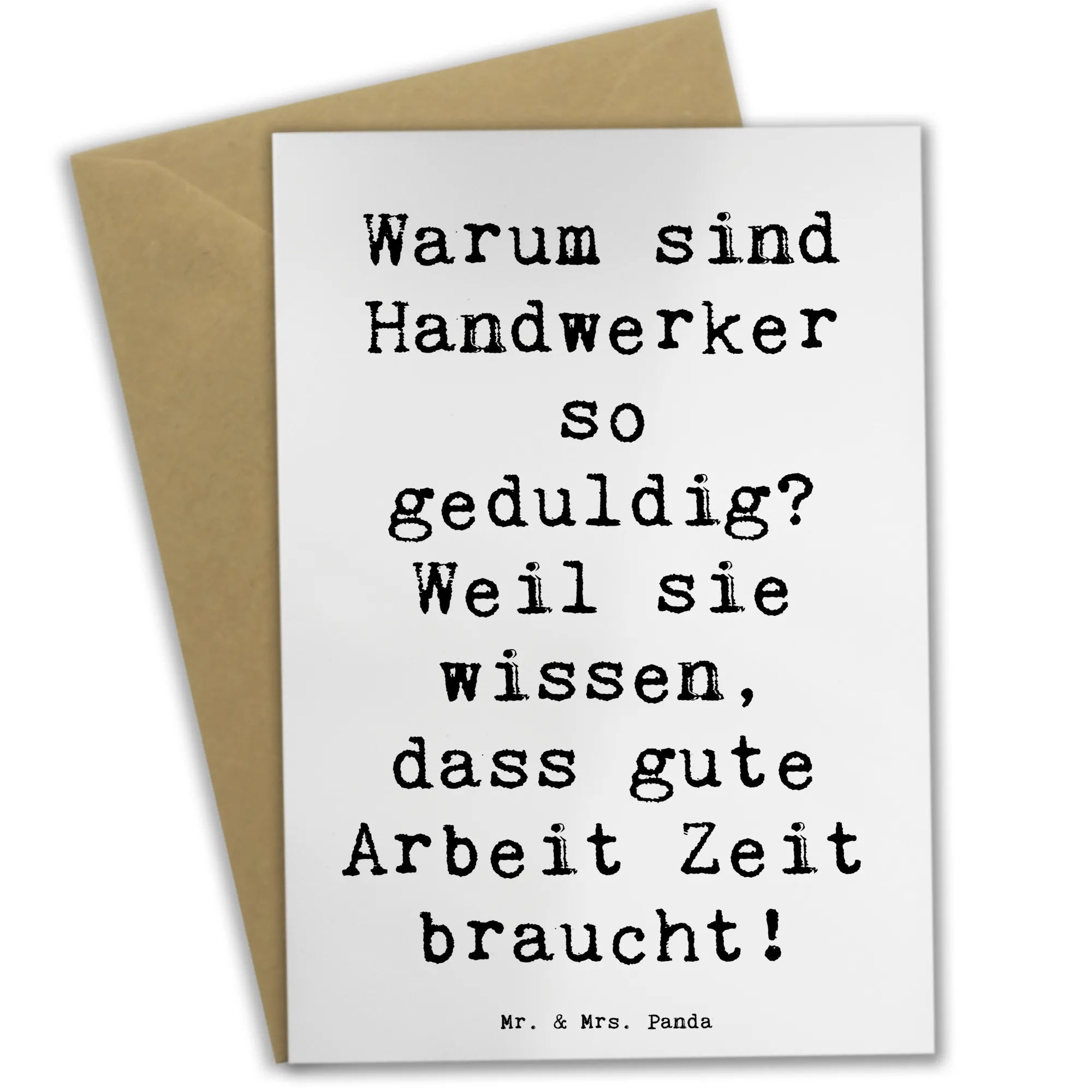 Entdecke die wunderschöne Grußkarte aus der Berufe-Kollektion von Mr. & Mrs. Panda! Diese liebevoll gestaltete Karte mit dem Spruch "Warum sind Handwerker so geduldig? Weil sie wissen, dass gute Arbeit Zeit braucht!" ist das perfekte Geschenk für jeden Handwerker.