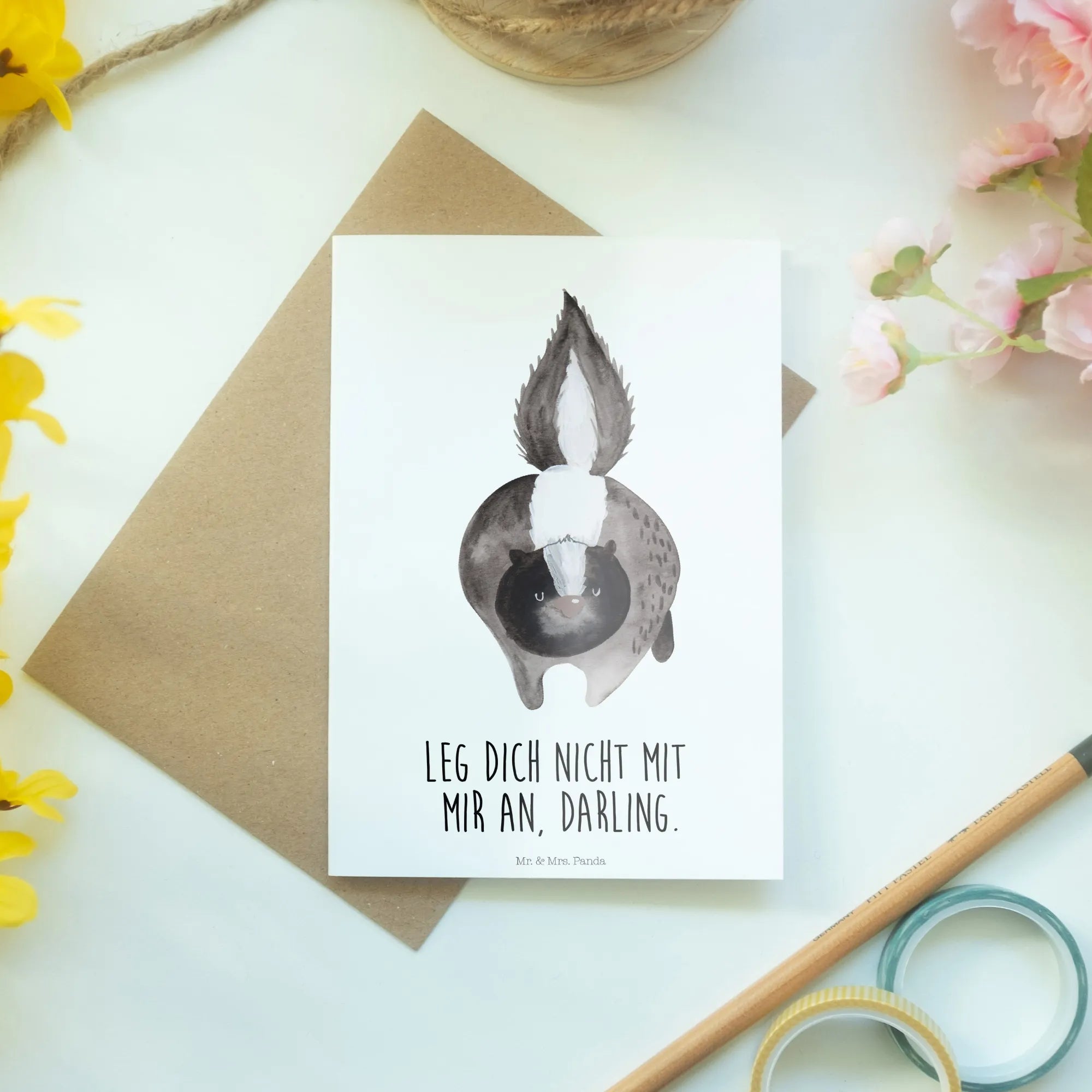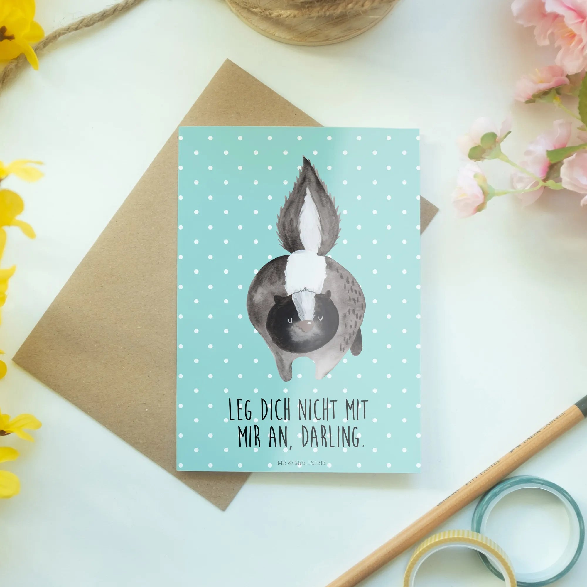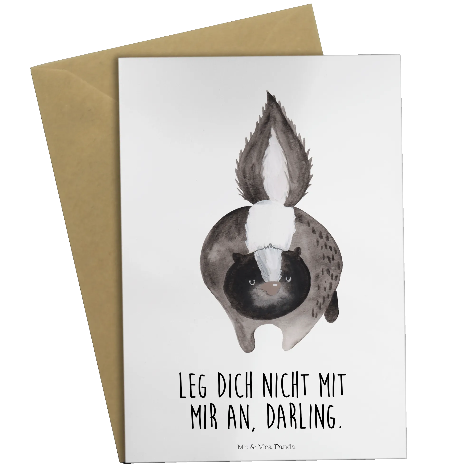 Mit Sprüchen und süßen Motiven von Mr. & Mrs. Panda ist diese Karte ein echter Hingucker. Sie verbindet den Charme der Stinktiere mit einer ganz besonderen Note und sorgt für einen schönen Ohrwurm: 'Leg dich nicht mit mir an, Darling.'