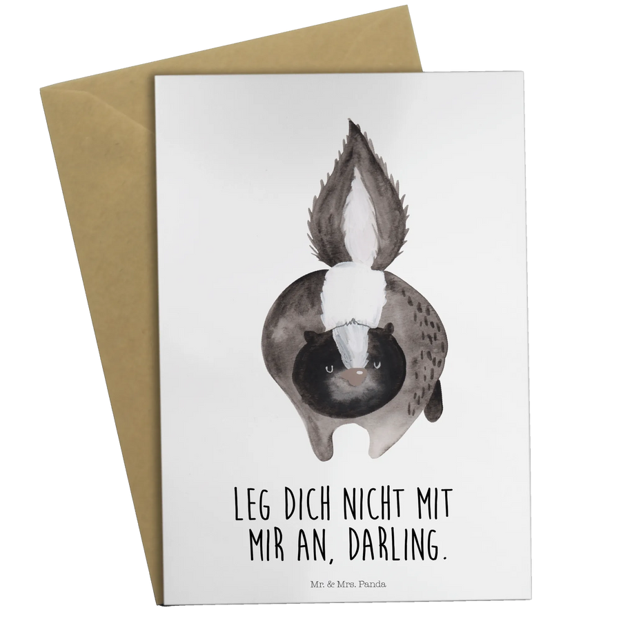 Die Grußkarte "Stinktier Angriff" aus der Stinktier-Kollektion von Mr. & Mrs. Panda ist das perfekte Geschenk, um Deine individuellen Grüße und Glückwünsche stilvoll zu übermitteln. Diese wunderschöne und einzigartige Grußkarte ist nicht nur ein einfacher schriftlicher Gruß, sondern ein kleines Kunstwerk, das mit viel Liebe gestaltet wurde.