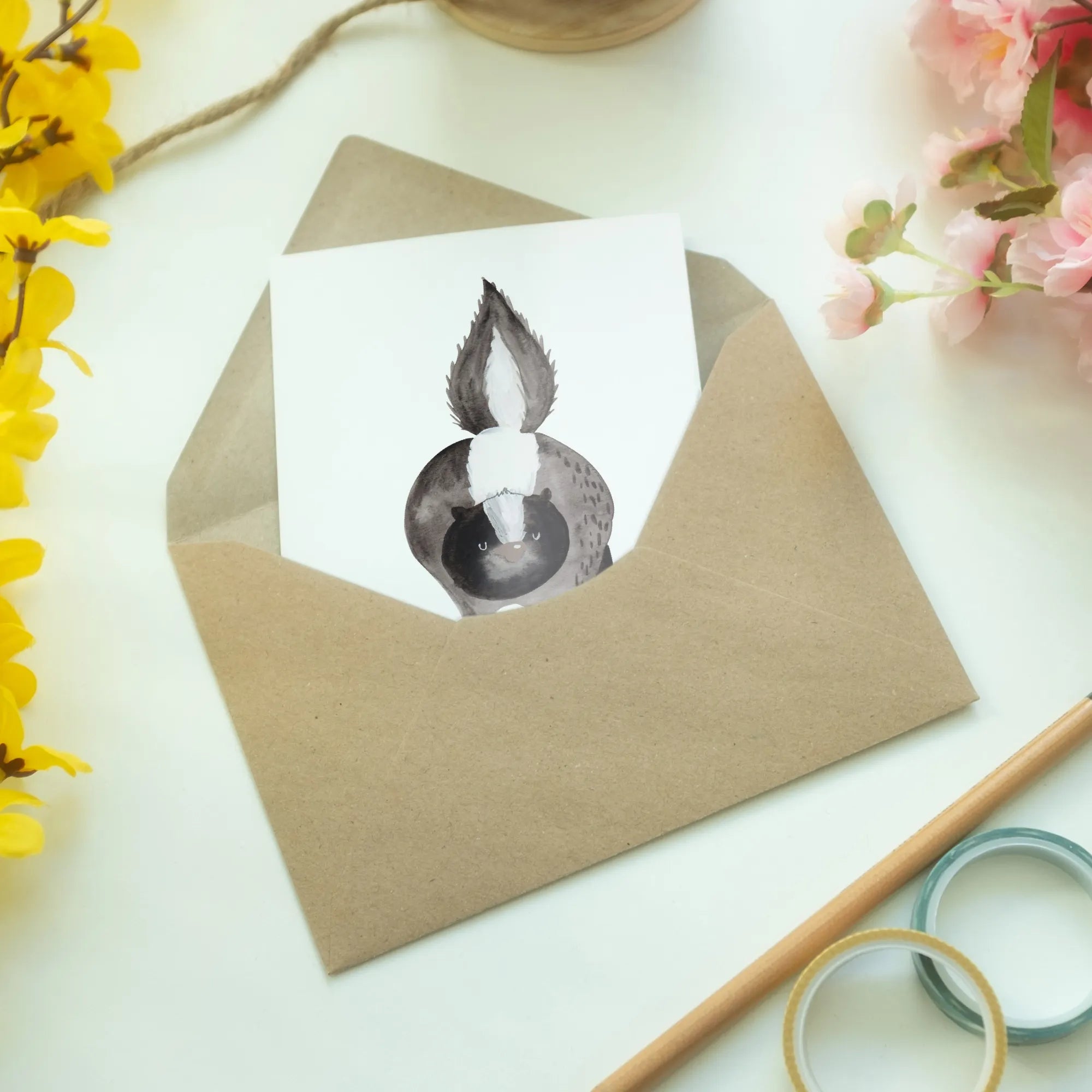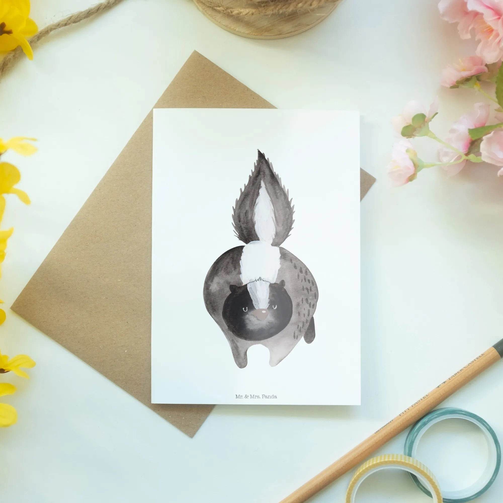 Die liebevollen Motive der Stinktier - Kollektion wurden von Mrs. Panda mit viel Herz und Aquarelltechnik handgezeichnet. Diese Kollektion ist eine Hommage an Herrn Blume, das treue Haustier von Mrs. Panda. Die Karte ist nicht nur ein Geschenk, sondern auch eine schöne Erinnerung an die gemeinsamen Momente.