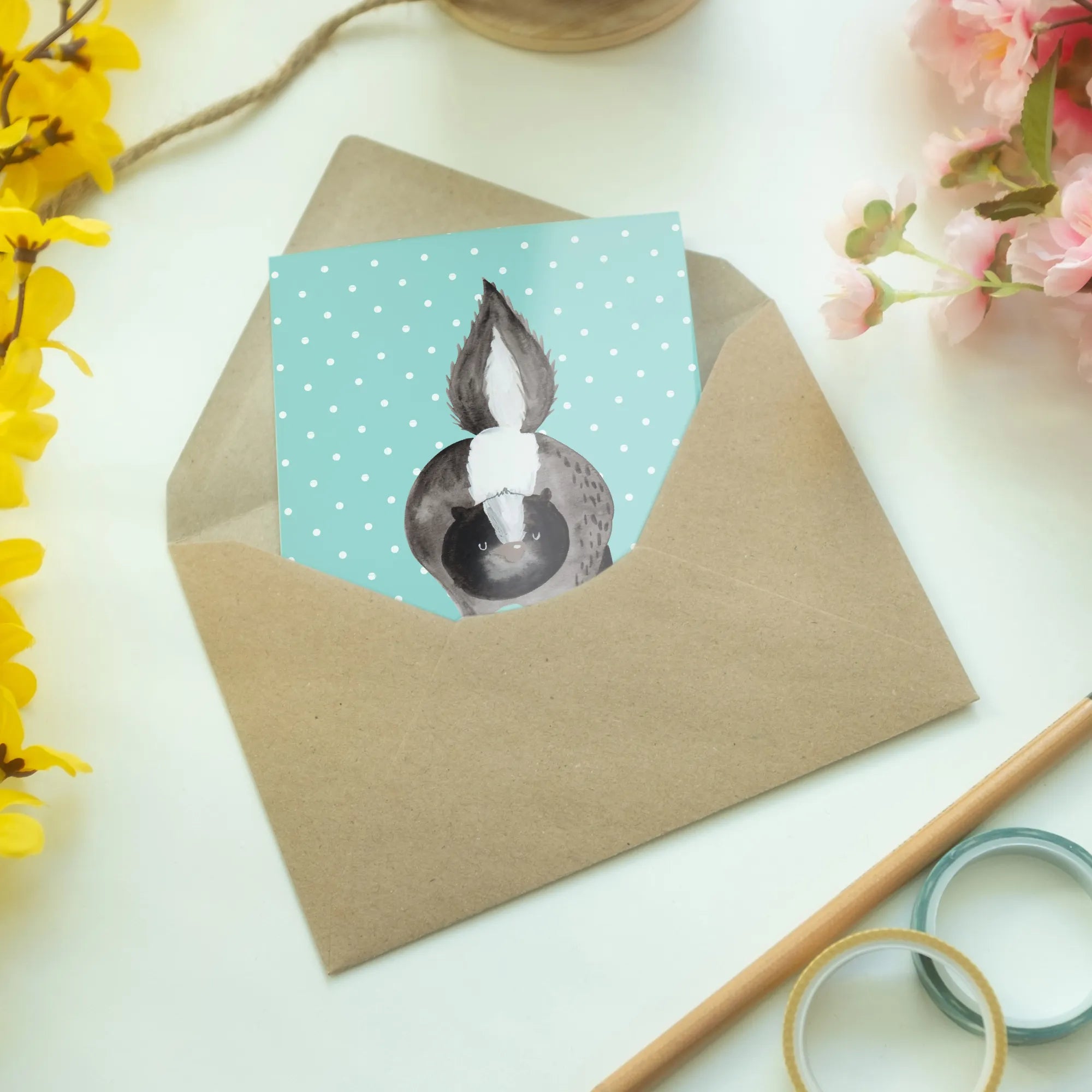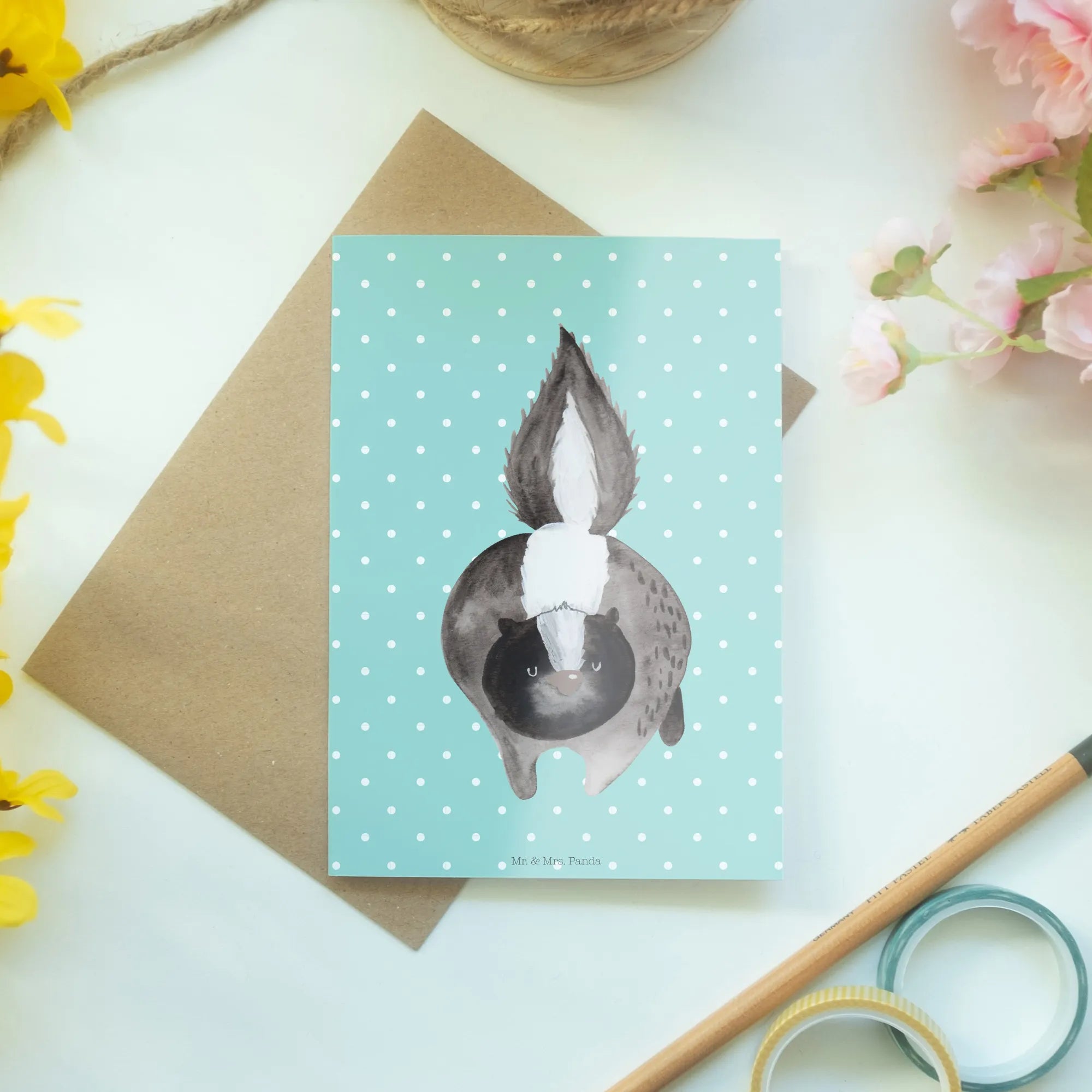 Ein weiteres Highlight dieser Kollektion ist die liebevolle Widmung an Herrn Blume, ein treues Stinktier und Freund von Mrs. Panda. Diese Karte und die gesamte Stinktier-Kollektion sind eine Hommage an die Lebensfreude, die dieser besondere Begleiter gebracht hat.