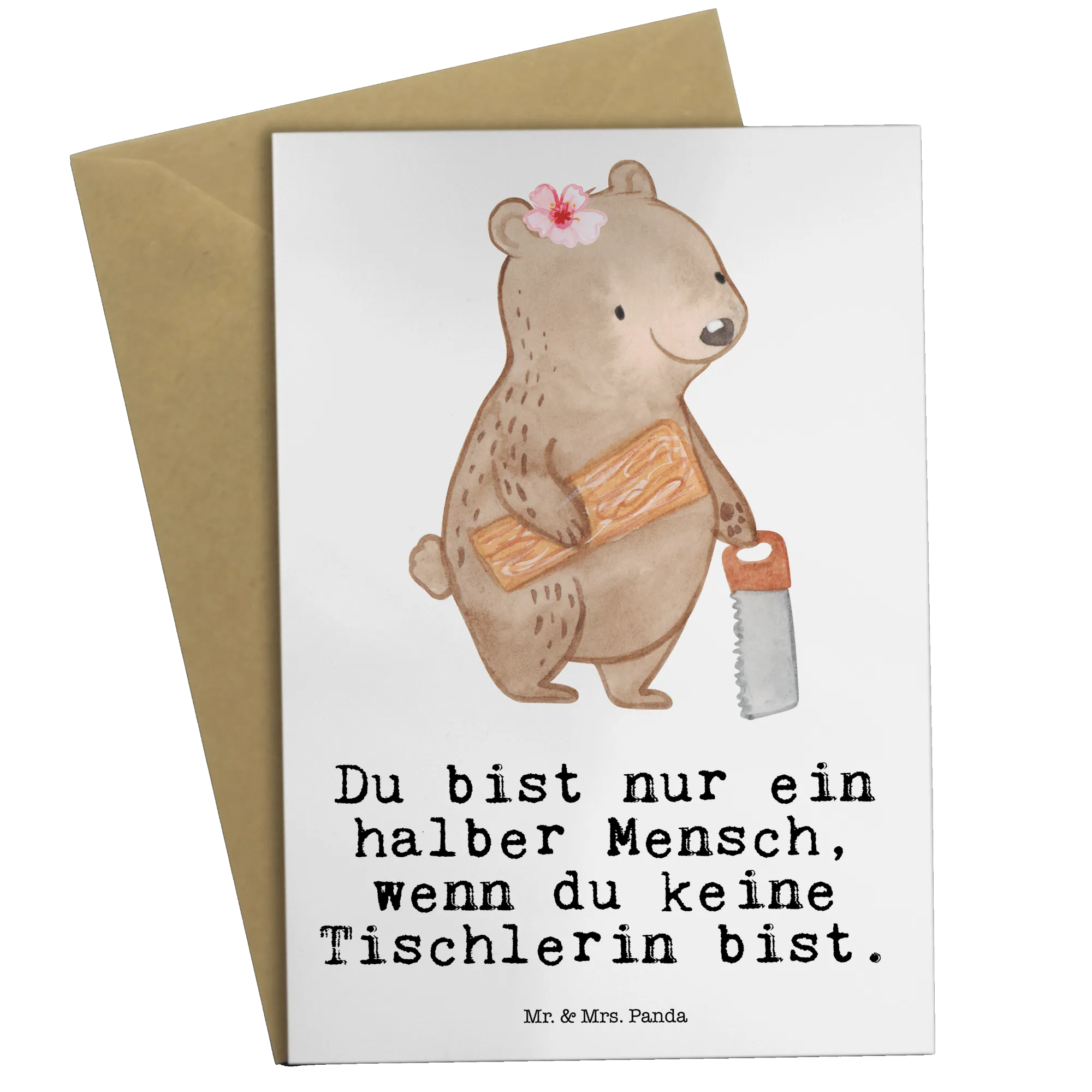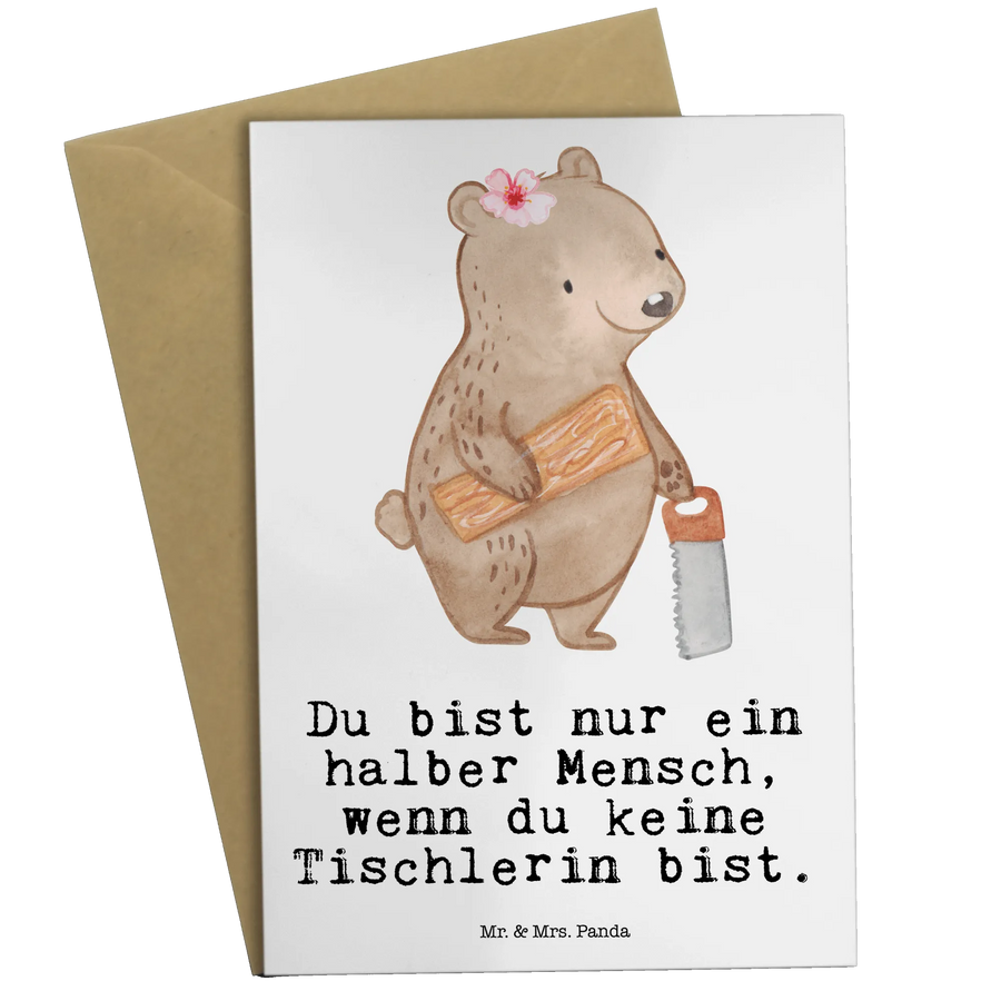 Die Grußkarte "Tischlerin mit Herz" aus der bezaubernden Berufe-Kollektion von Mr. & Mrs. Panda ist nicht nur ein einfacher Kartengruß, sondern ein besonderes Geschenk für jeden, der das Handwerk des Tischlers liebt. Egal, ob Du diese Karte an eine Kollegin, einen Freund oder ein Familienmitglied verschenkst, die herzlichen Motive und der liebevoll gestaltete Spruch "Du bist nur ein halber Mensch, wenn du keine Tischlerin bist" machen diese Karte zu einem unvergesslichen Erlebnis.