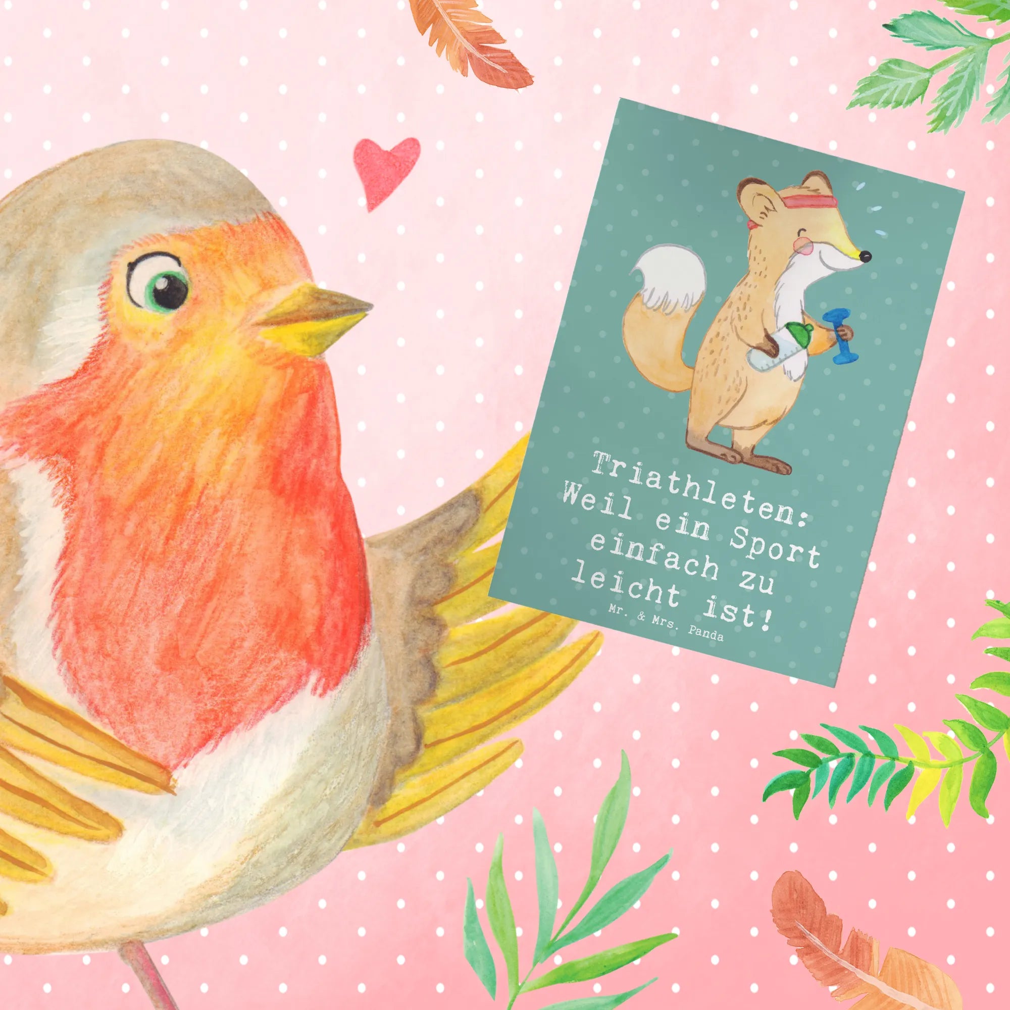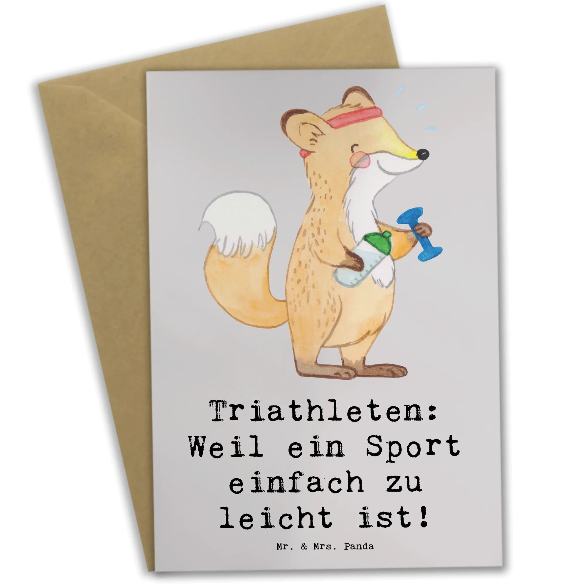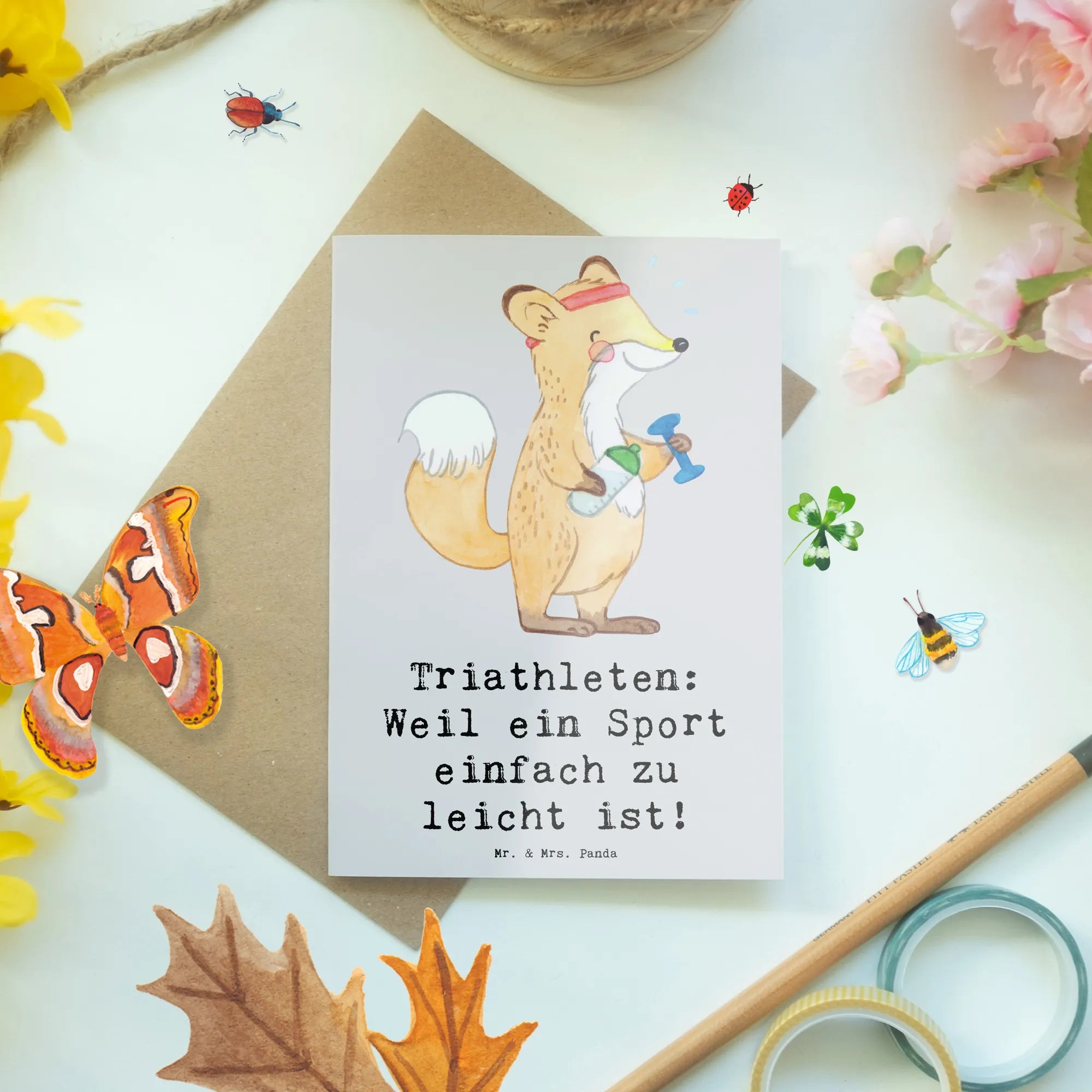 Das Design ist mit dem liebevollen Slogan "Triathleten: Weil ein Sport einfach zu leicht ist!" versehen, was es zu einem idealen Geschenk für jeden Athleten macht. Die Grußkarte hat die praktischen Maße von 148 mm x 105 mm und besteht aus hochwertigem, 300 Gramm schwerem Karton. Die Vorderseite ist hochglänzend veredelt und strahlt durch die handgezeichneten Motive von Mr. & Mrs. Panda eine besondere Eleganz aus. Die matte Innenseite ist perfekt zum individuellen Beschriften geeignet. So kannst du deiner kreativen Ader freien Lauf lassen und deine persönlichen Glückwünsche oder Grüße zu besonderen Anlässen festhalten – sei es für ein Geburtstagskind, einen Hochzeitstag oder als Einladung zu einem sportlichen Event.