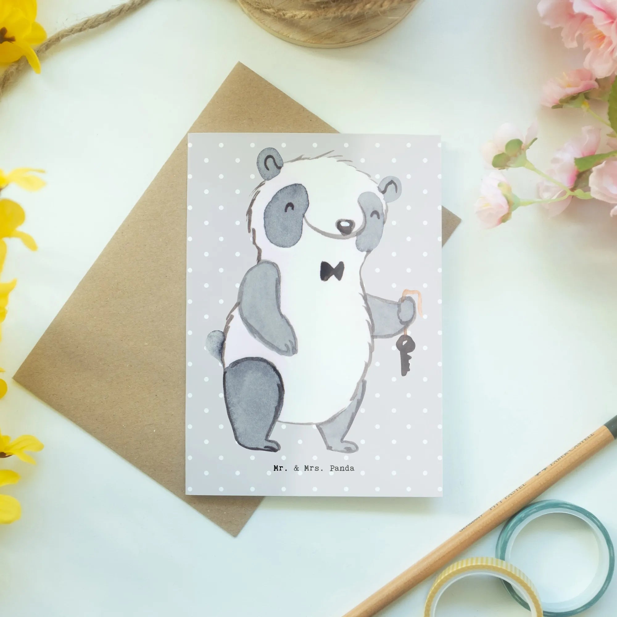 Die "Vermieter mit Herz" Karte gehört zur professionellen Kollektion von Mr. & Mrs. Panda, in der jede Karte mit viel Liebe und Kreativität gestaltet wurde, um die verschiedenen Berufe zu feiern. Überrasche jemanden, den du schätzt, mit dieser einzigartigen und zuckersüßen Grußkarte und mache ihren Tag etwas heller!