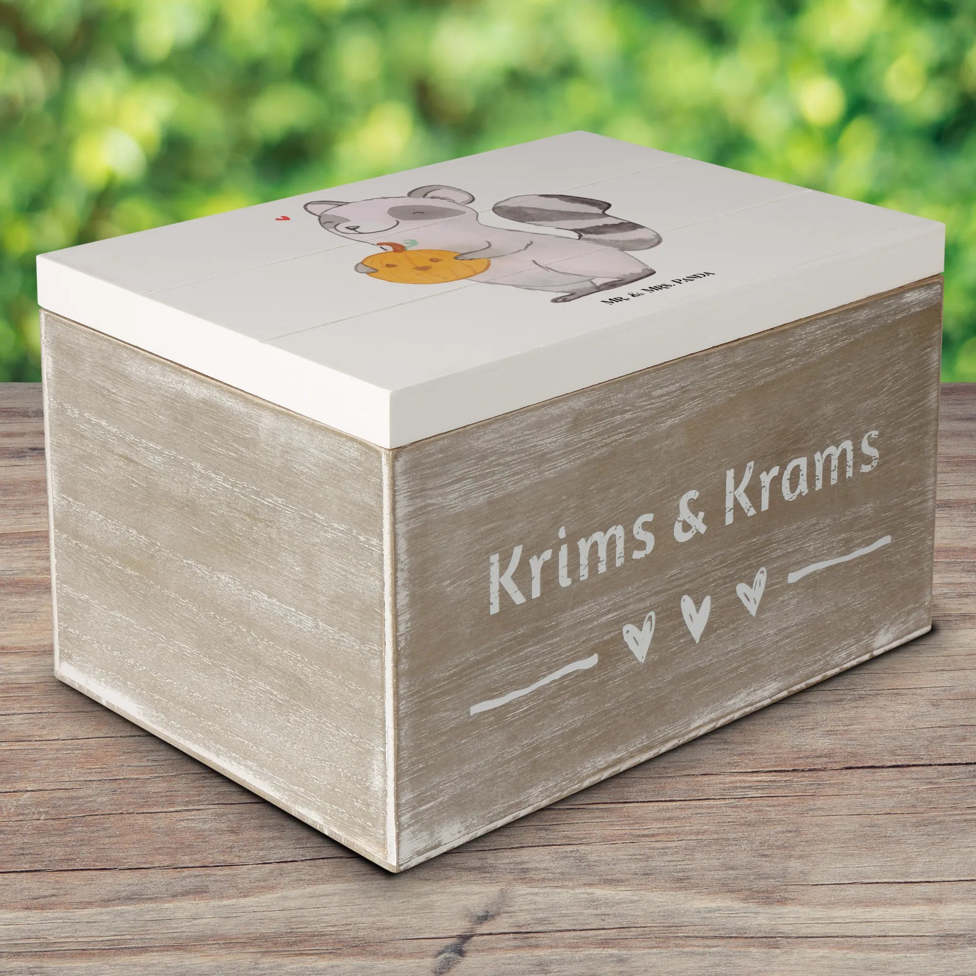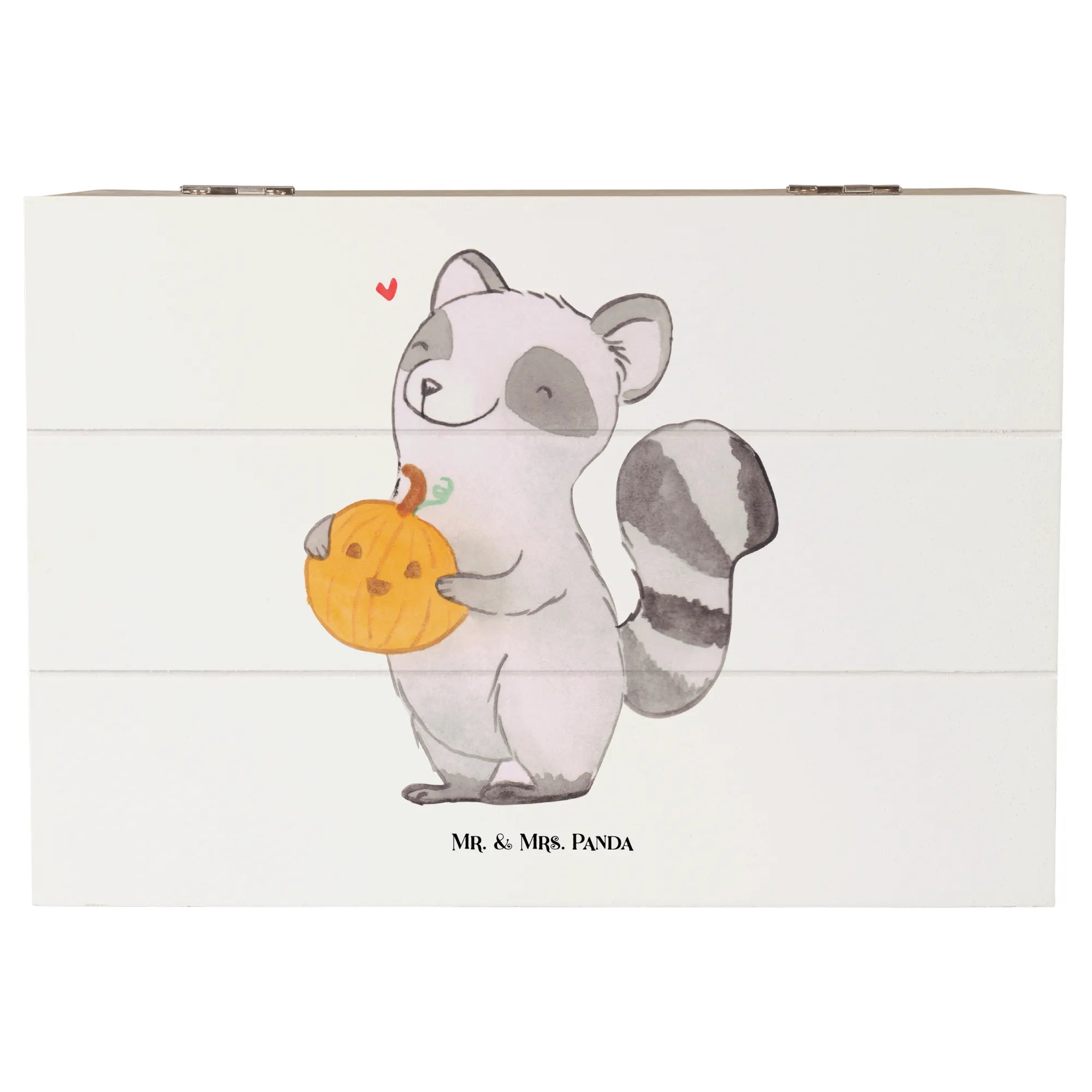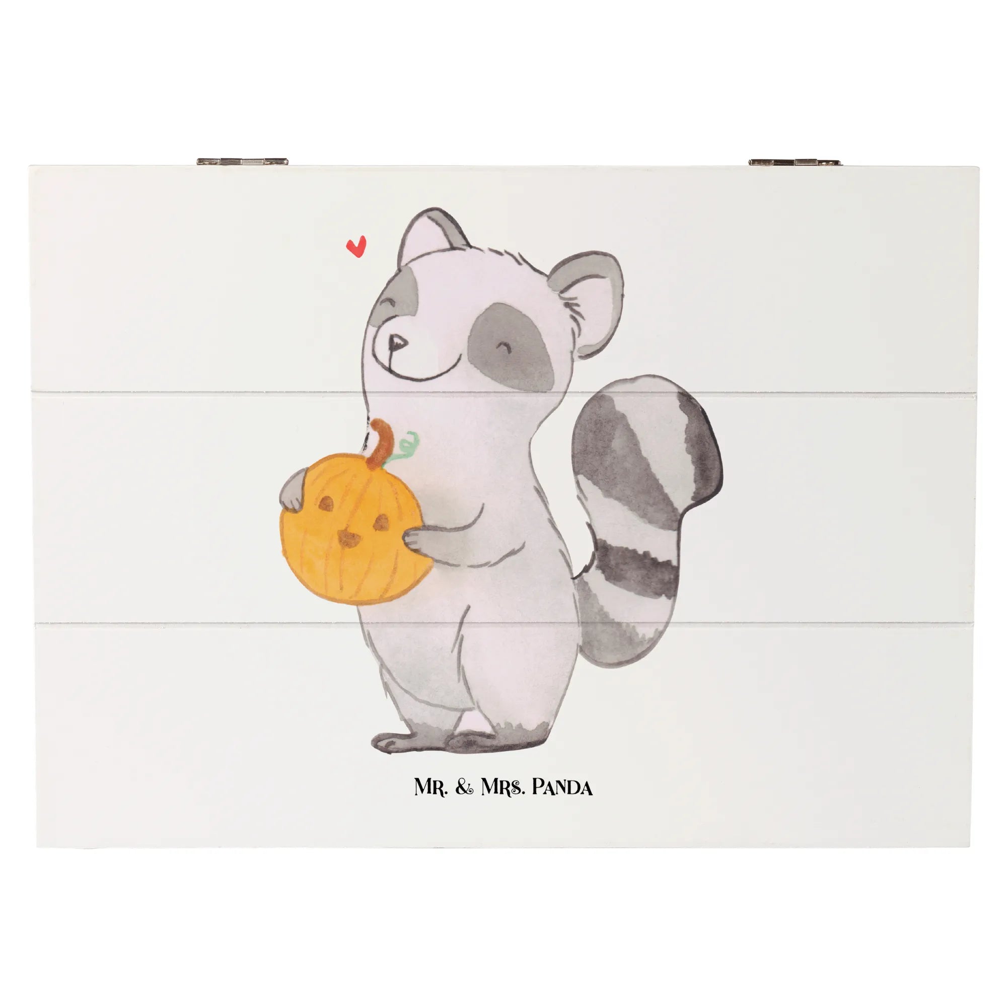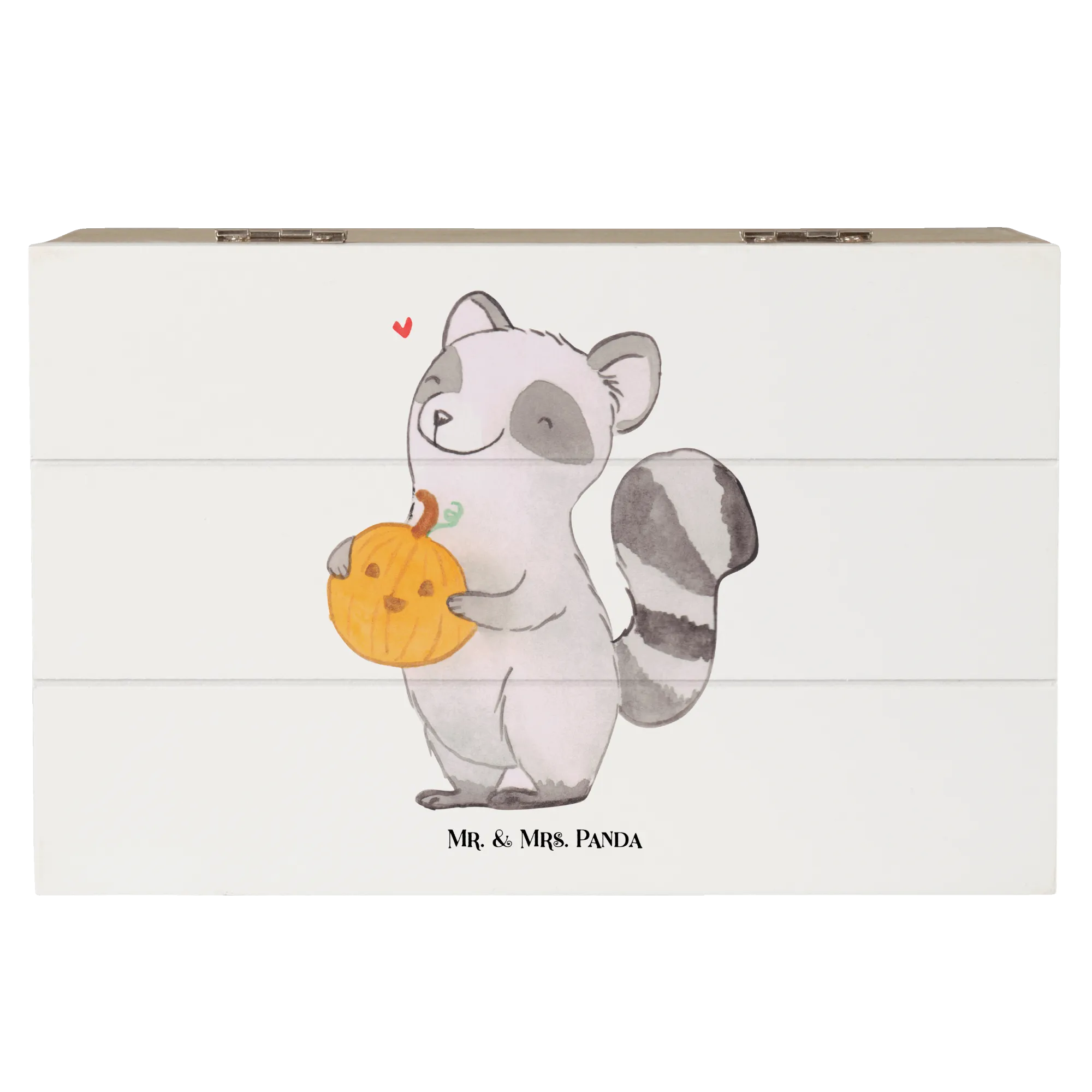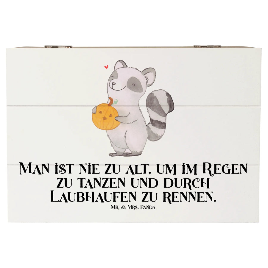 Die wunderschöne Holzkiste von Mr. & Mrs. Panda, bedruckt mit einem fröhlichen Waschbär und einem geschnitzten Kürbis, ist das perfekte Geschenk für alle, die den Herbst lieben!