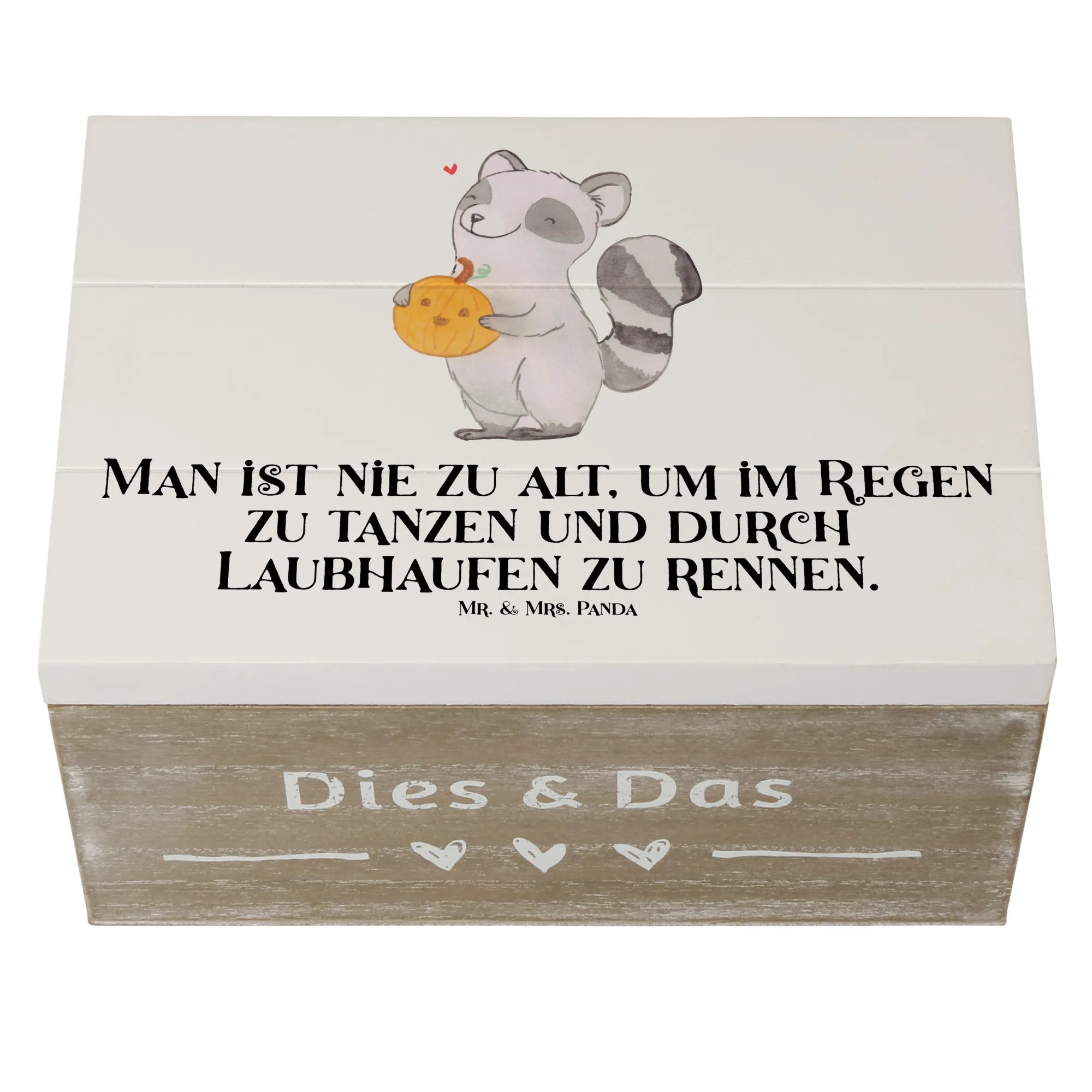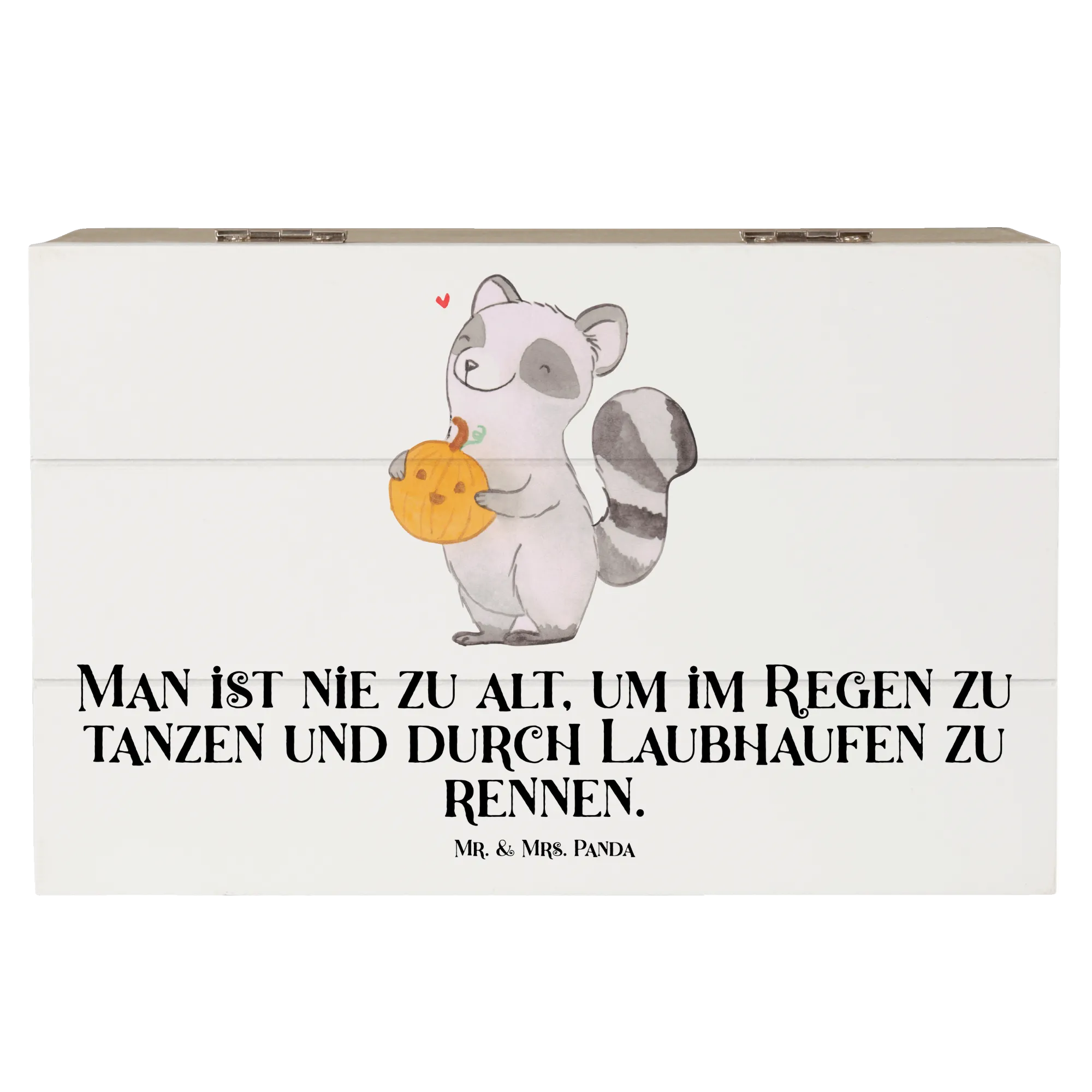 Du wirst die liebevollen Details lieben - der Waschbär hält seinen Kürbis voller Freude und strahlt mit seinem lächelnden Gesicht den Herbst aus. Warum das Ganze? Weil Mr. & Mrs. Panda es lieben, aufzuzeigen, dass „man nie zu alt ist, um im Regen zu tanzen und durch Laubhaufen zu rennen“. Schaffe farbenfrohe Erinnerungen und lass diese Kiste Teil deiner herbstlichen Deko werden! Ob als Geschenk für eine liebe Freundin, eine herzliche Überraschung für die Familie oder einfach für dich selbst – sie wird jedem ein Lächeln ins Gesicht zaubern!