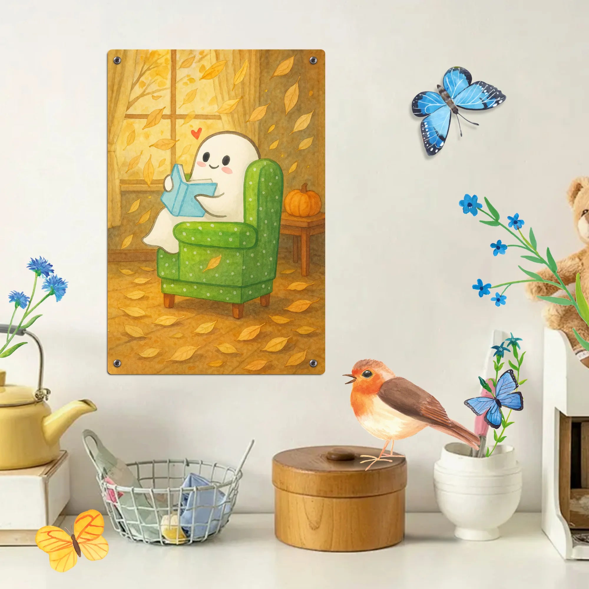 Begrüße dein neues Lieblingsgespenst, das sich in einem stilvollen, grünen Sessel niedergelassen hat, um in ein blaues Buch einzutauchen. Mit einem potpourri aus herbstlichen Blättern, die fröhlich umherwirbeln, und einem kleinen roten Herz, das schwebt, vermittelt das Bild ein Gefühl von Zufriedenheit und Gemütlichkeit. Schau dir das fröhliche Lächeln des Gespenstes an, das mit seinen rosigen Wangen noch mehr Leben in die Szenerie bringt. Es ist der perfekte Moment, um die kühleren Tage zu umarmen und einen ruhigen Abend mit einem guten Buch zu verbringen. In dieser wohligen Atmosphäre spürt man wie die Lesezeit zur besten Auszeit wird. Das Gespenst erinnert uns daran, dass es in jedem von uns auch Platz für eine freundliche Spukgeschichte gibt und dass die kleinen Freuden des Lebens uns oft am meisten erfüllen.