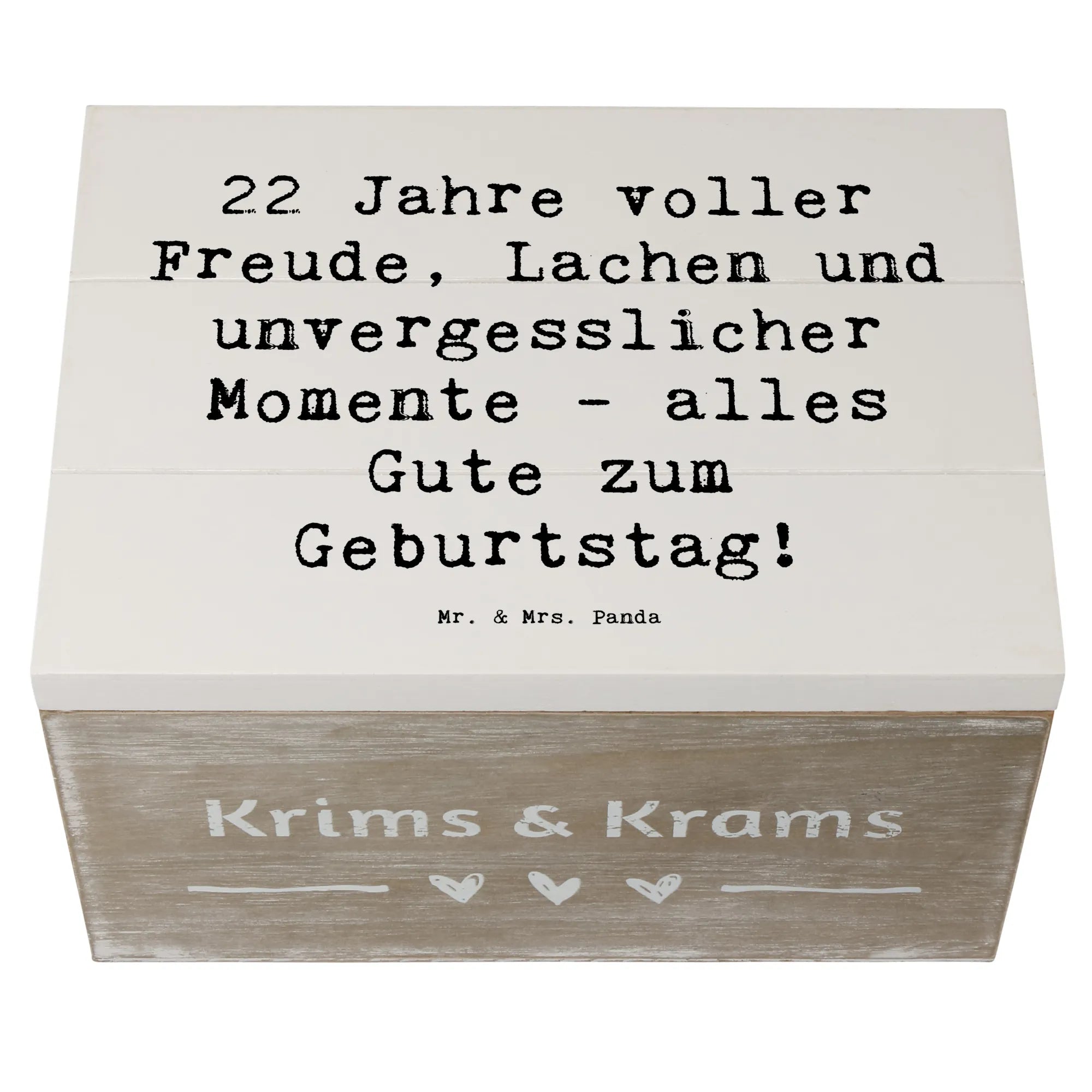 Die Kiste misst 19 x 12 cm und bietet genug Platz, um alltägliche Schätze oder besondere Erinnerungsstücke wie Fotos und persönliche Geschenke zu verstauen. Mit dem Motiv '22 Jahre voller Freude, Lachen und unvergesslicher Momente - alles Gute zum Geburtstag!' wird sie sicher zum Highlight jeder Geburtstagsfeier.