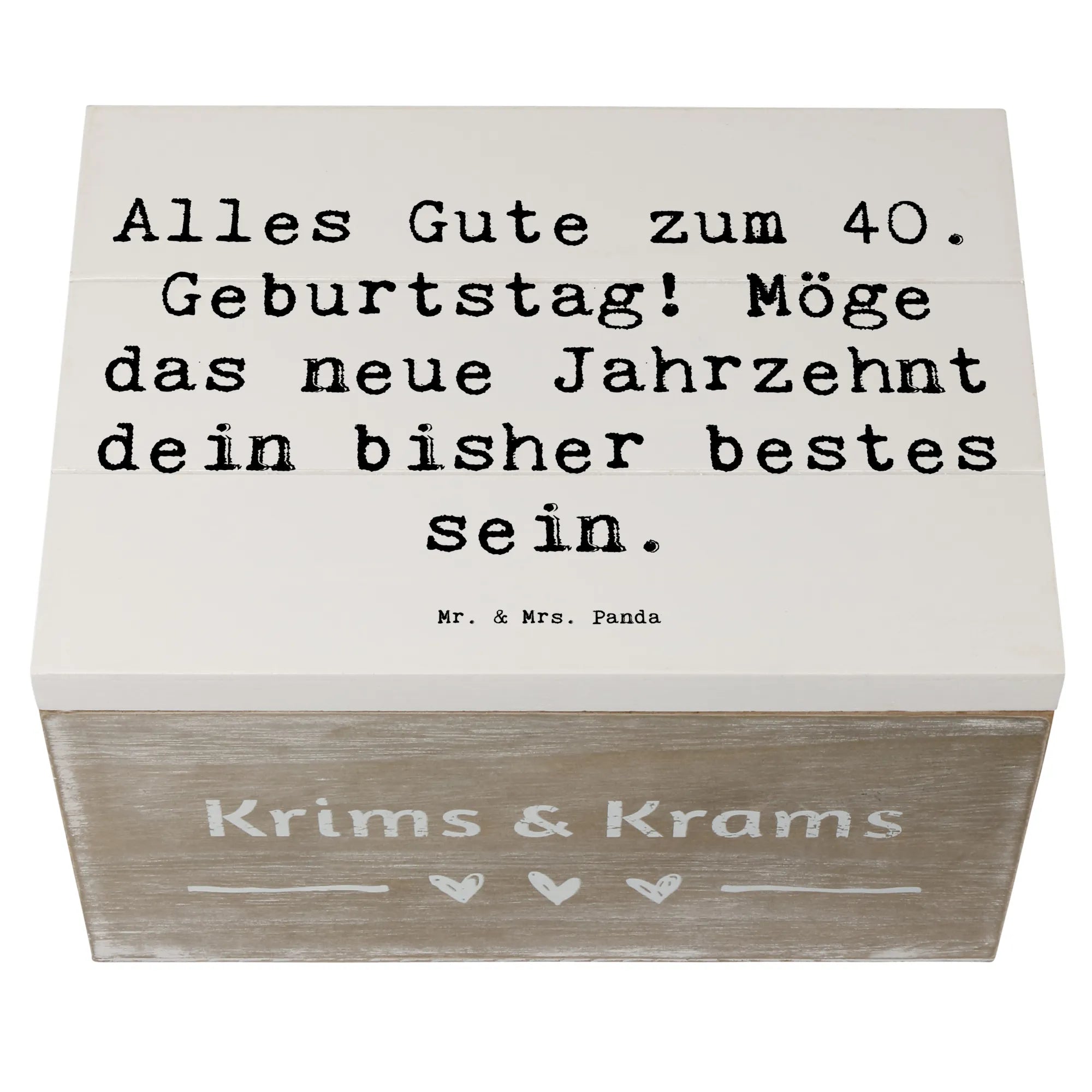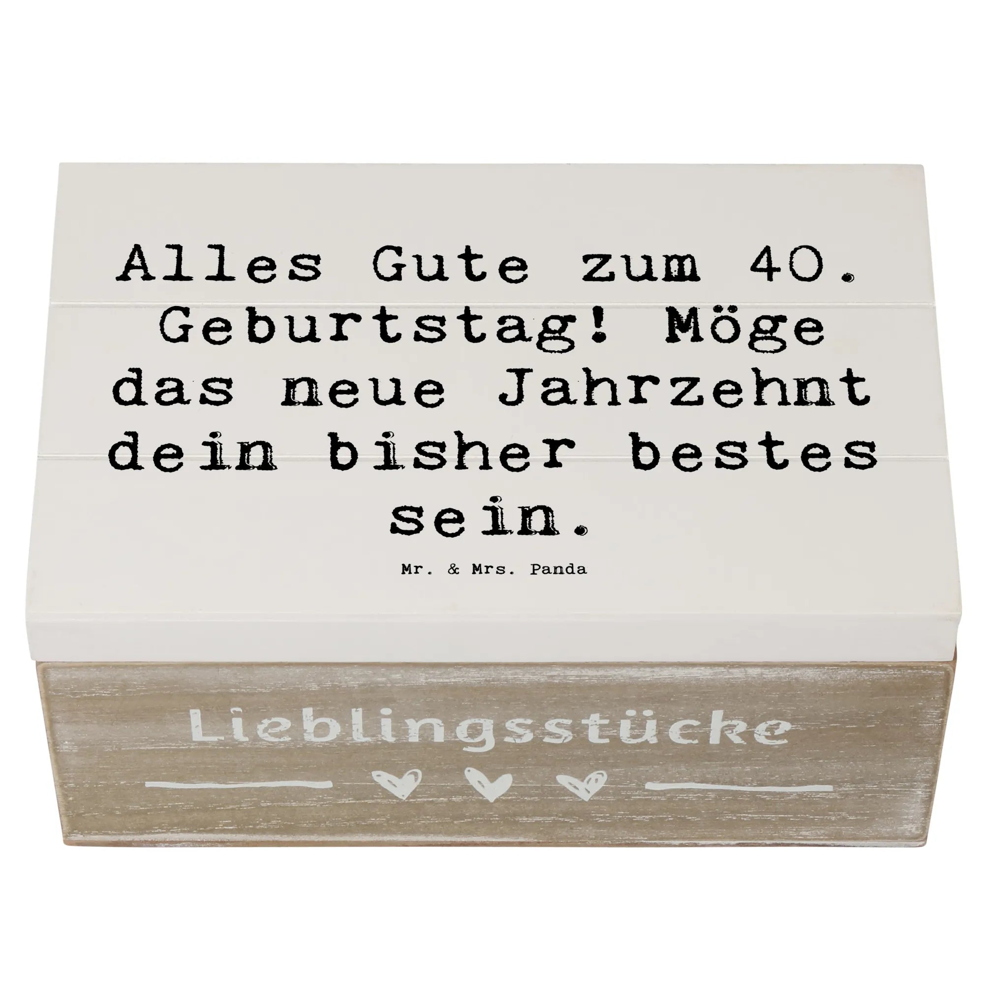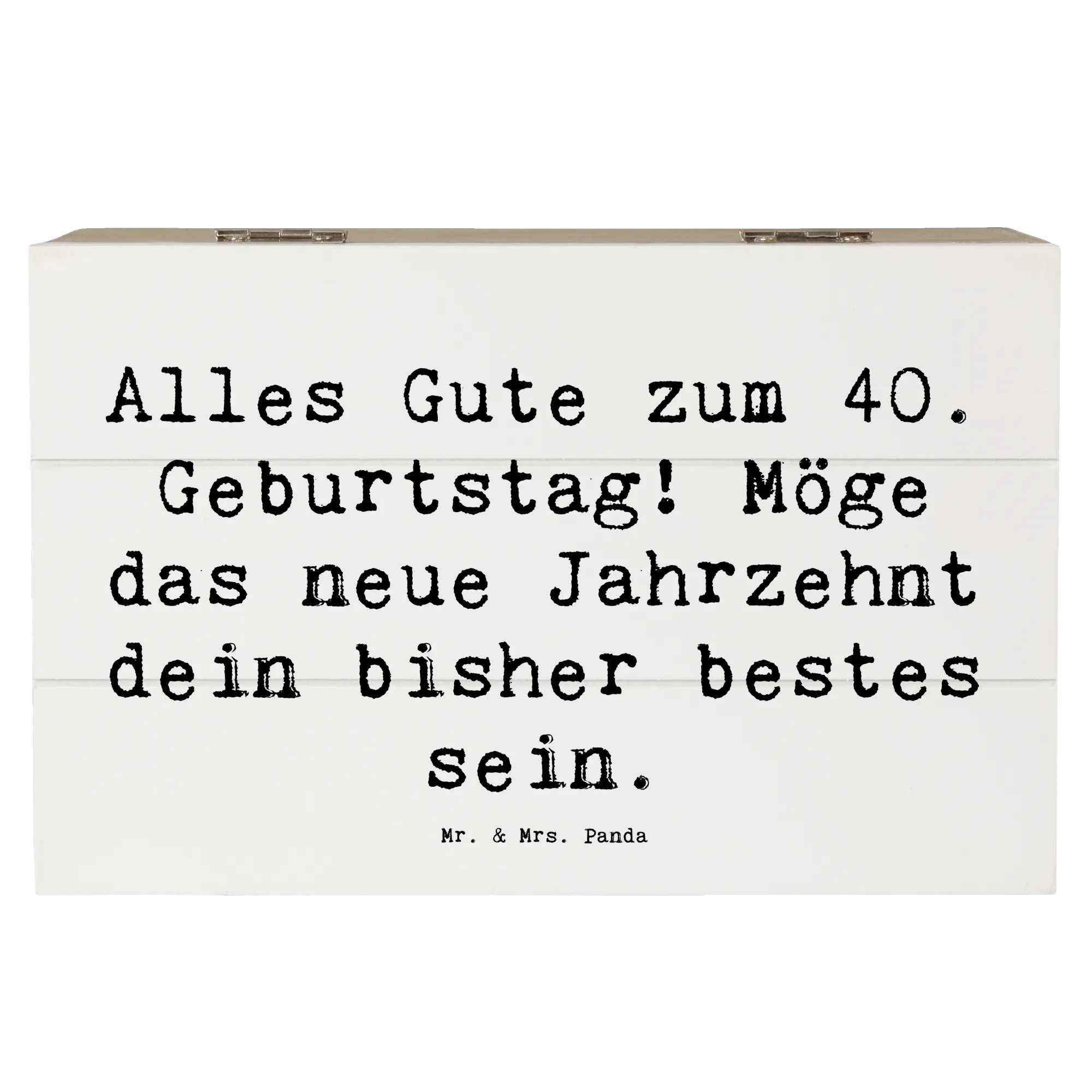 Suchst du das perfekte Geschenk zum 40. Geburtstag? Dann ist unsere wunderschöne Holzkiste von Mr. & Mrs. Panda genau das richtige für dich! Diese Erinnerungskiste, bedruckt mit dem herzlichen Spruch "Alles Gute zum 40. Geburtstag! Möge das neue Jahrzehnt dein bisher bestes sein." ist eine echte Schatztruhe für alle wichtigen Momente und Erinnerungen des Lebens.