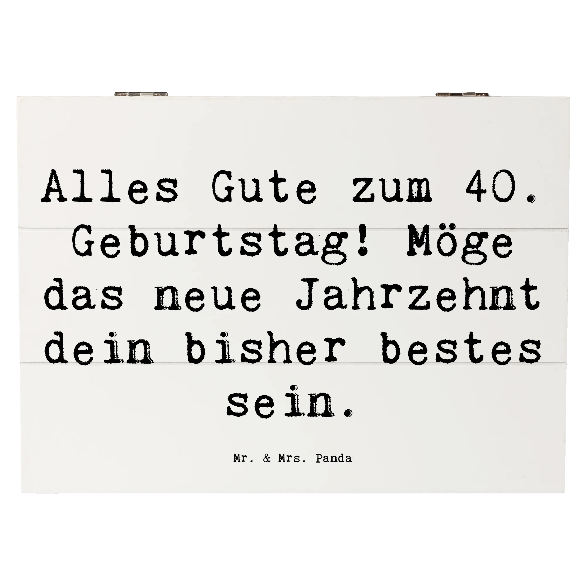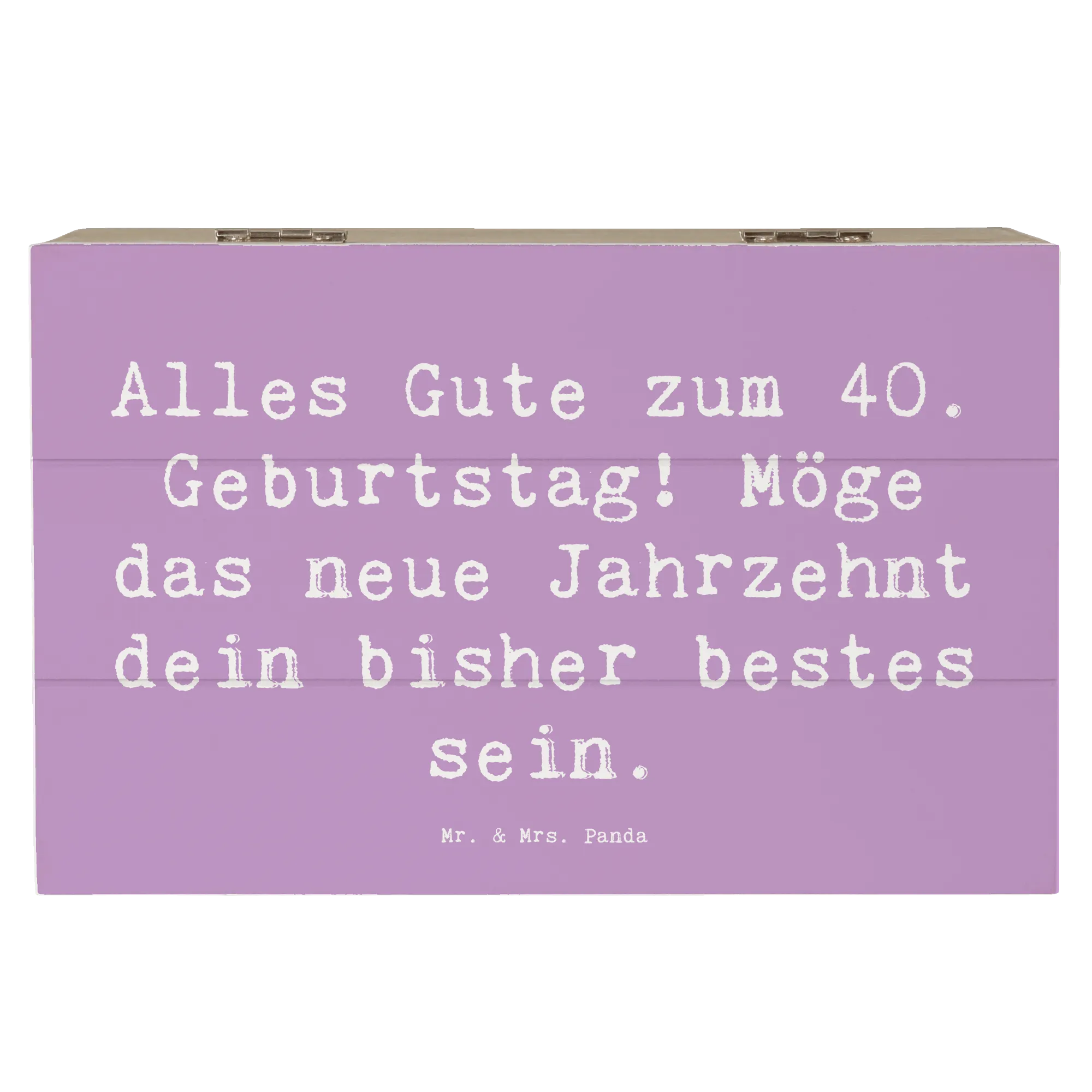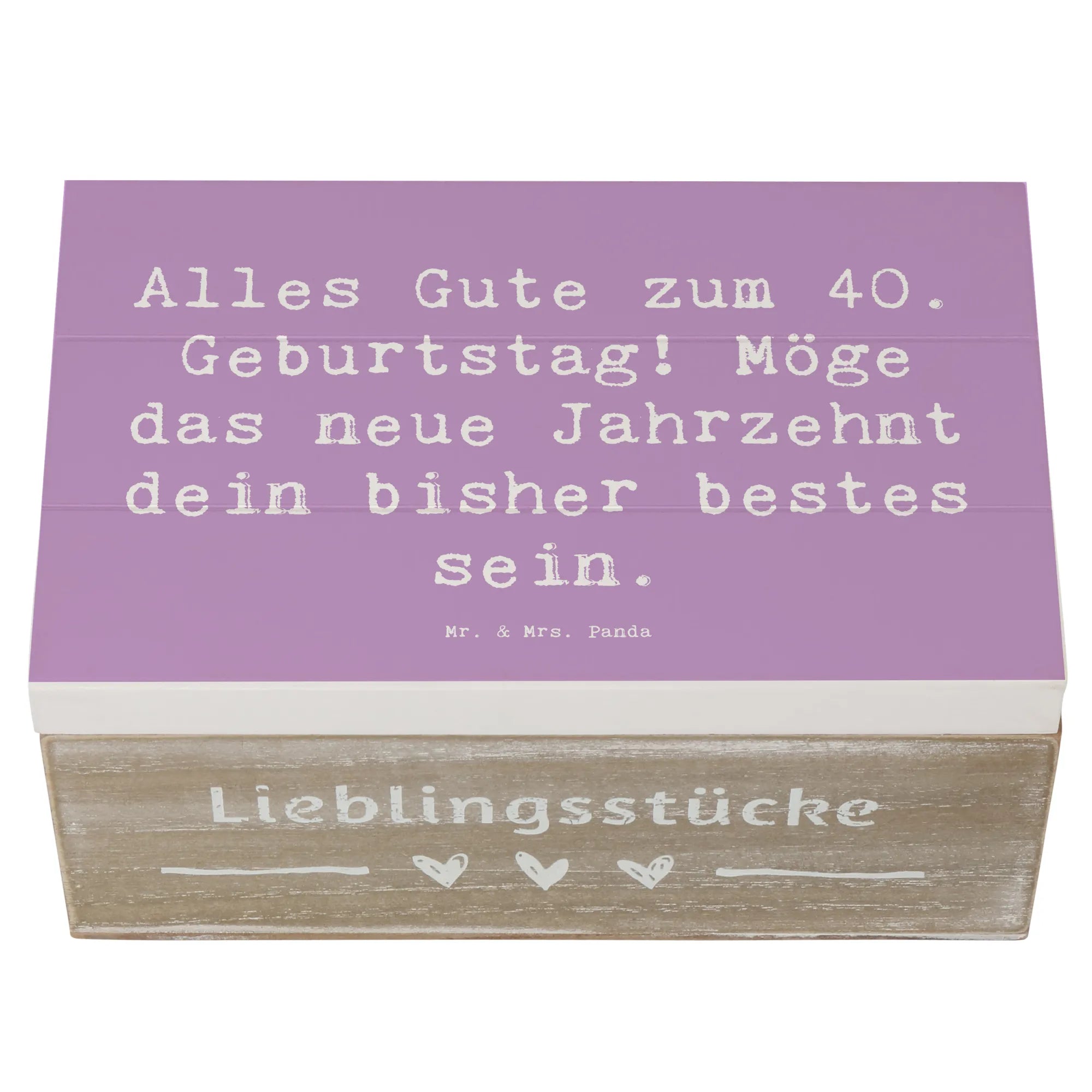 Suchst du das perfekte Geschenk zum 40. Geburtstag? Dann ist unsere wunderschöne Holzkiste von Mr. & Mrs. Panda genau das richtige für dich! Diese Erinnerungskiste, bedruckt mit dem herzlichen Spruch "Alles Gute zum 40. Geburtstag! Möge das neue Jahrzehnt dein bisher bestes sein." ist eine echte Schatztruhe für alle wichtigen Momente und Erinnerungen des Lebens.