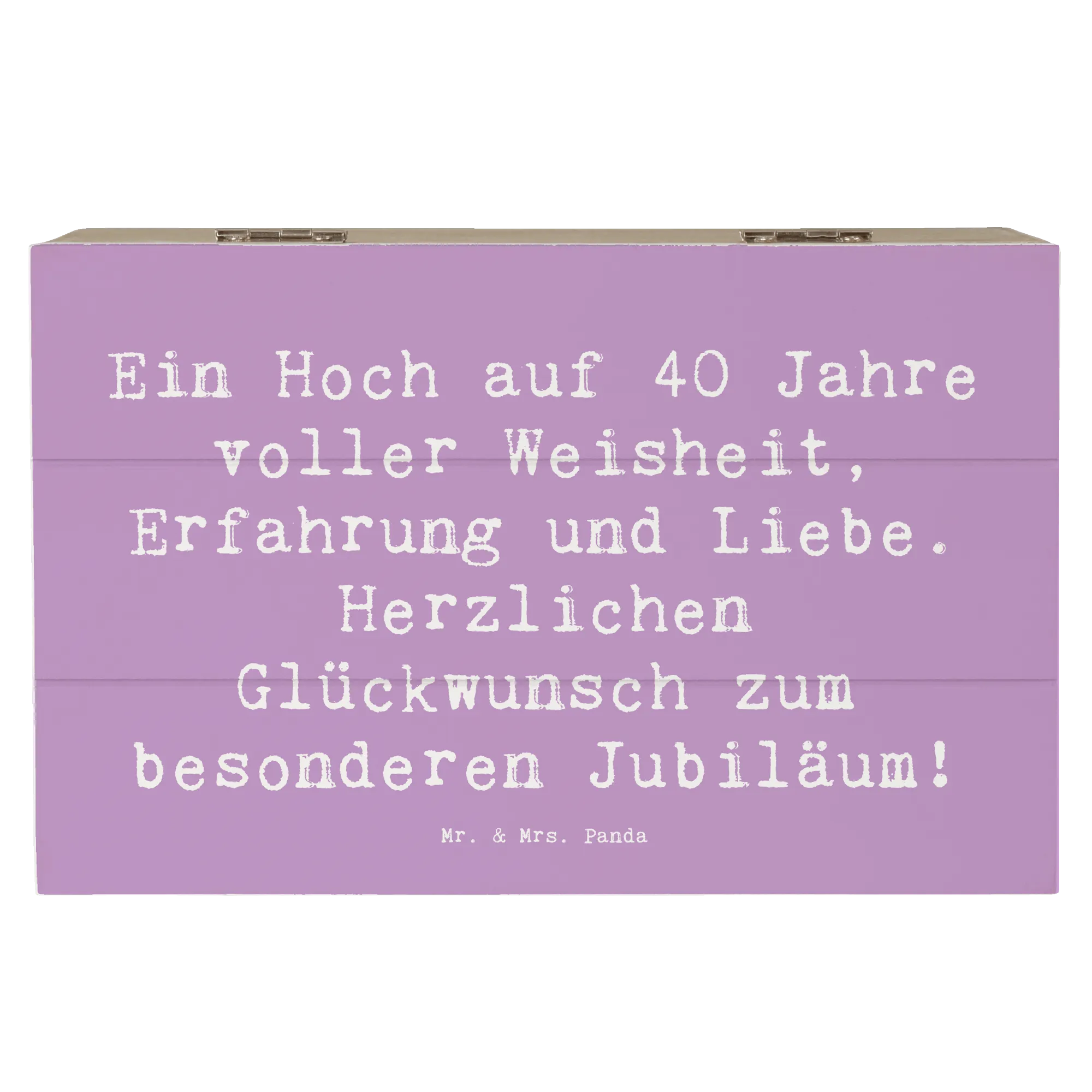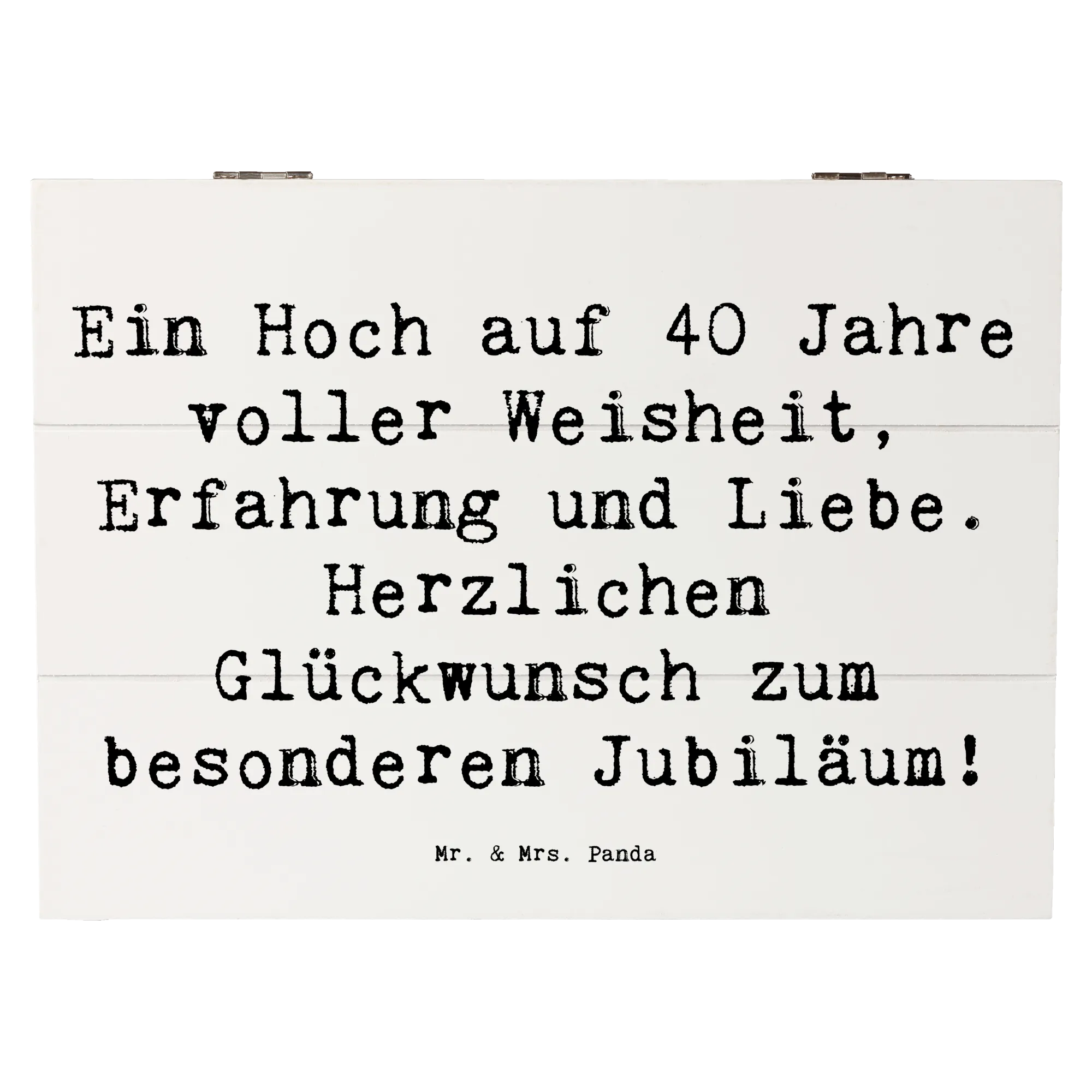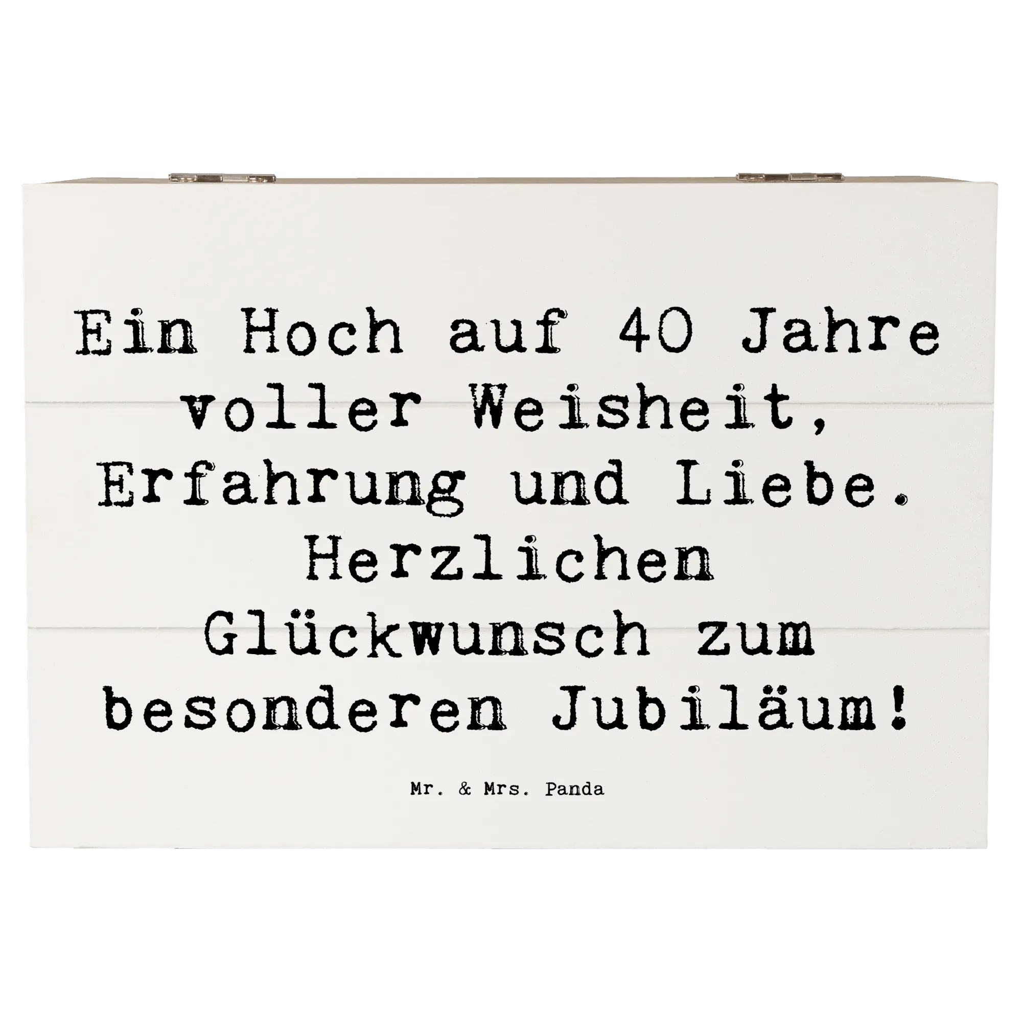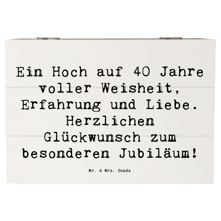 Die wunderschöne Holzkiste von Mr. & Mrs. Panda ist das ideale Geschenk für den 40. Geburtstag. Bedruckt mit dem liebevollen Spruch: "Ein Hoch auf 40 Jahre voller Weisheit, Erfahrung und Liebe. Herzlichen Glückwunsch zum besonderen Jubiläum!" ist diese Erinnerungskiste ein perfekter Aufbewahrungsort für die wertvollen Schätze des Lebens.