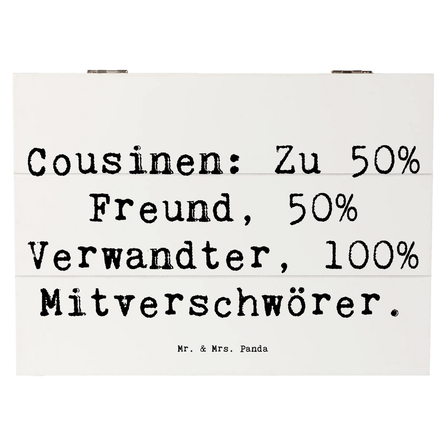 Die wunderschöne Holzkiste von Mr. & Mrs. Panda ist das perfekte Geschenk für Deine Cousine oder Deinen Cousin! Diese liebevoll gestaltete Erinnerungskiste bringt nicht nur Ordnung in das Chaos der Schatzkiste, sondern bewahrt auch die schönsten Momente und Erinnerungen. Mit einem charmanten Spruch – "Cousinen: Zu 50% Freund, 50% Verwandter, 100% Mitverschwörer" – strahlt sie Wärme und Verbundenheit aus. Diese Holzschatulle eignet sich hervorragend als Aufbewahrungsort für Deine wertvollsten Schätze, sei es für Fotos aus der Kindheit, Erinnerungen an gemeinsame Abenteuer oder kleine Überraschungen, die das Leben schöner machen.