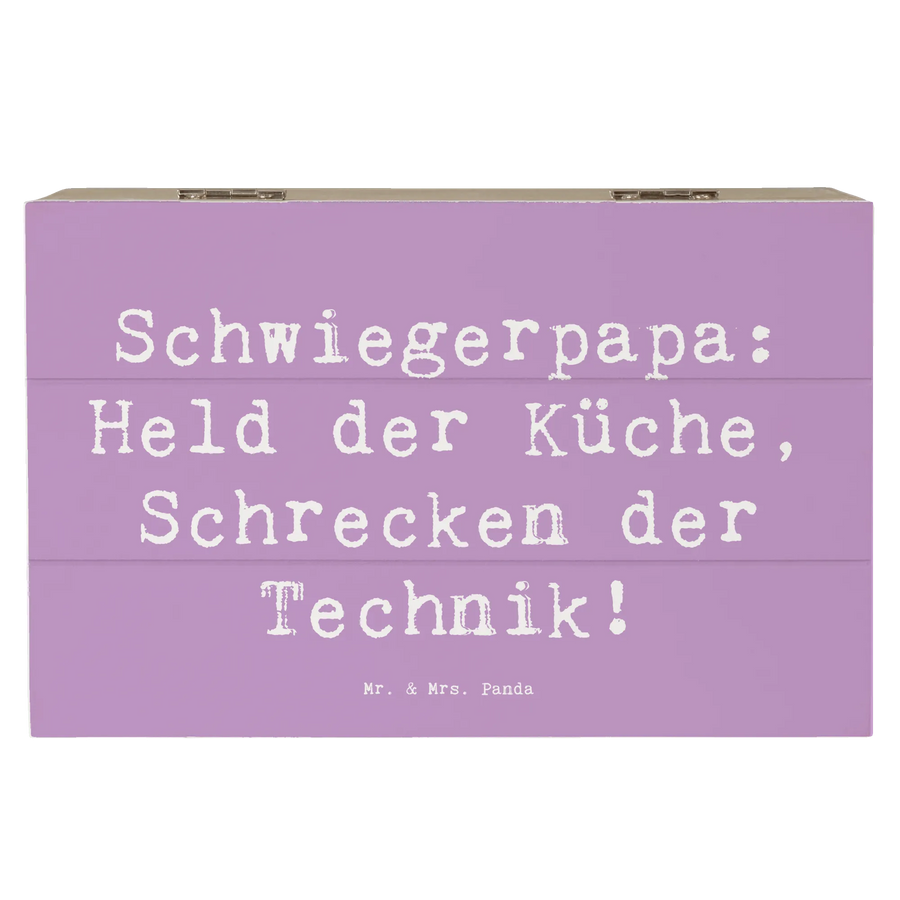 Die wunderschöne Holzkiste von Mr. & Mrs. Panda mit dem Motiv "Schwiegerpapa: Held der Küche, Schrecken der Technik!" ist das perfekte Geschenk für deinen Schwiegervater und alle, die ihm nahe stehen.
