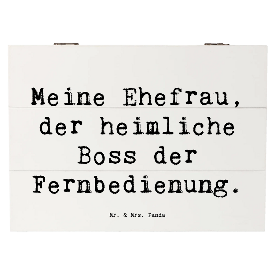 Die wunderschöne Holzkiste von Mr. & Mrs. Panda mit dem Aufdruck 'Meine Ehefrau, der heimliche Boss der Fernbedienung' ist das perfekte Geschenk für die besondere Frau in Deinem Leben. Diese Erinnerungskiste ist nicht nur ein stilvolles Accessoire, sondern auch ein lebenslanges Zuhause für kostbare Erinnerungen.