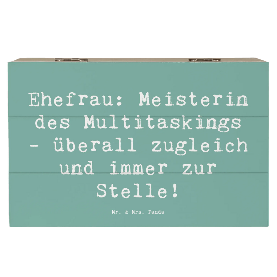 Die wunderschöne Holzkiste für die Ehefrau von Mr. & Mrs. Panda ist nicht nur ein Aufbewahrungsort für all deine kostbaren Schätze, sondern auch eine liebevolle Erinnerung an die besondere Rolle, die deine Frau in deinem Leben spielt. Mit dem spritzigen Slogan 'Ehefrau: Meisterin des Multitaskings - überall zugleich und immer zur Stelle!' bringt diese bezaubernde Kiste die Wertschätzung zum Ausdruck, die jede Ehefrau verdient.
