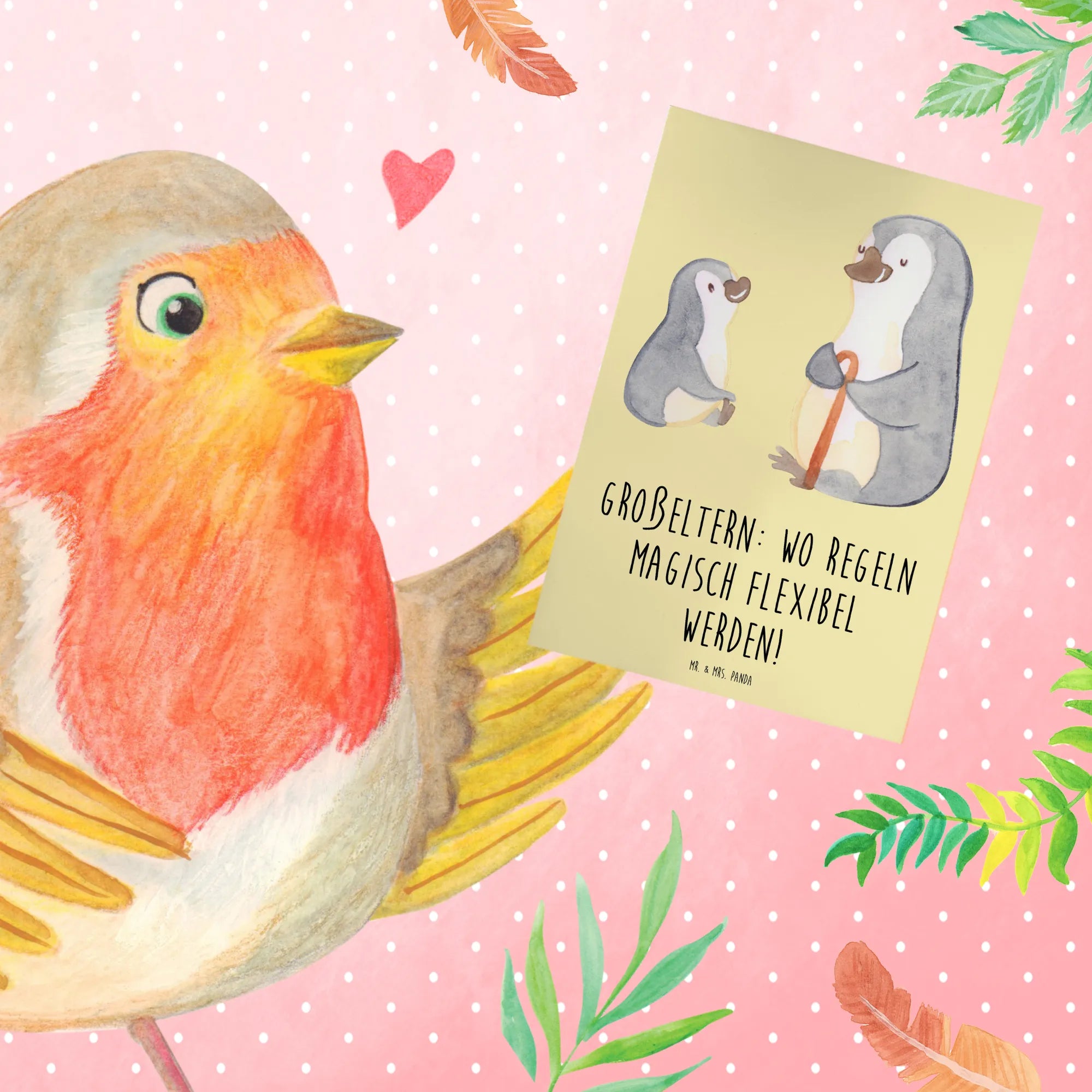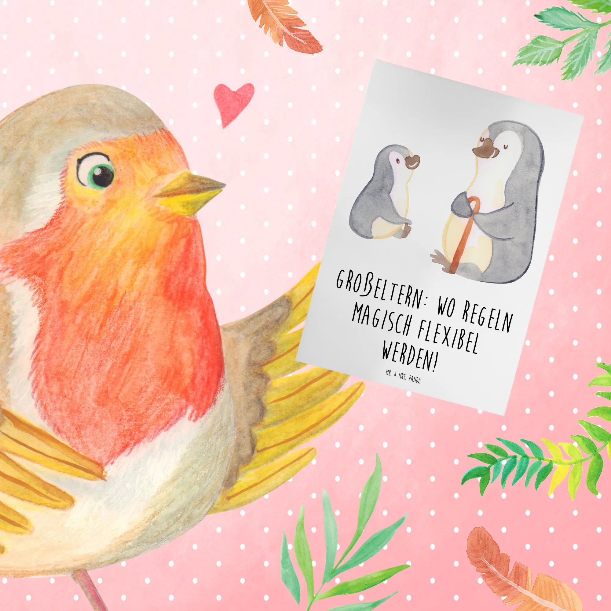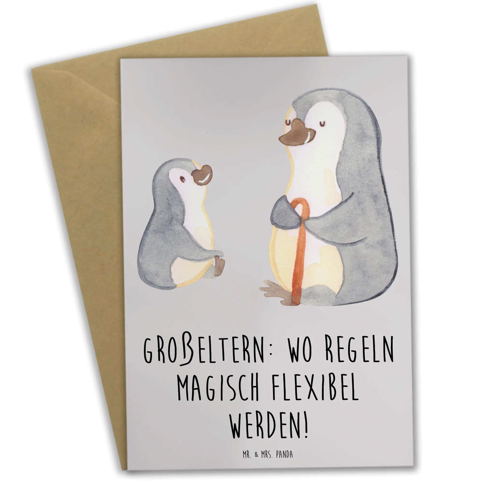 Die wunderschöne Grußkarte von Mr. & Mrs. Panda mit dem liebevollen Motiv "Großeltern: wo Regeln magisch flexibel werden!" ist das perfekte Geschenk für Großeltern und ermöglicht es dir, zusammen mit deinen Enkelkindern herzliche Grüße zu übermitteln.