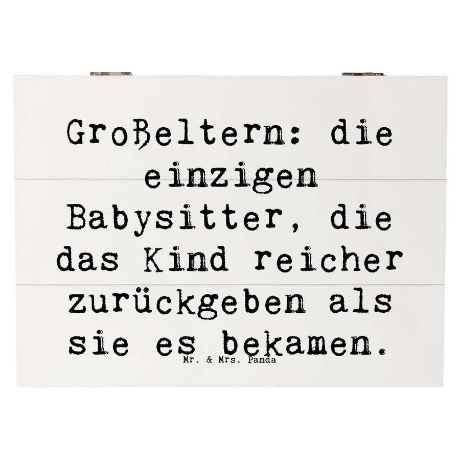 Mit dem liebevollen Spruch "Großeltern: die einzigen Babysitter, die das Kind reicher zurückgeben als sie es bekamen" wird die Bedeutung von Großeltern gestärkt, die oft die Träger wichtiger Familientraditionen und Werte sind. Diese Schatzkiste ist ideal als Aufbewahrungsort für die vielen kleinen Schätze des Lebens – sei es als Erinnerungskiste für Kindheitserinnerungen, Fotos von besonderen Anlässen oder auch als ganz persönliche Geschenkbox zu Feierlichkeiten wie Kommunion oder Konfirmation.