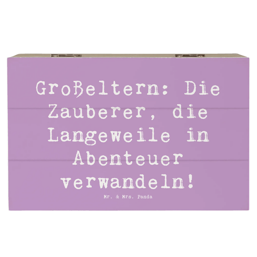 Die wunderschöne Holzkiste von Mr. & Mrs. Panda ist das perfekte Geschenk für Großeltern! Ob zu besonderen Anlässen wie Geburtstagen, Feiertagen oder einfach nur als kleine Aufmerksamkeit zwischendurch – diese liebevoll gestaltete Kiste bringt Freude in jedes Zuhause. Mit dem charmanten Spruch "Großeltern: Die Zauberer, die Langeweile in Abenteuer verwandeln!" zollst Du den wundervollen Großeltern unserer Zeit Anerkennung und schaffst einen bleibenden Schatz, der Erinnerungen und Geschichten bewahrt.