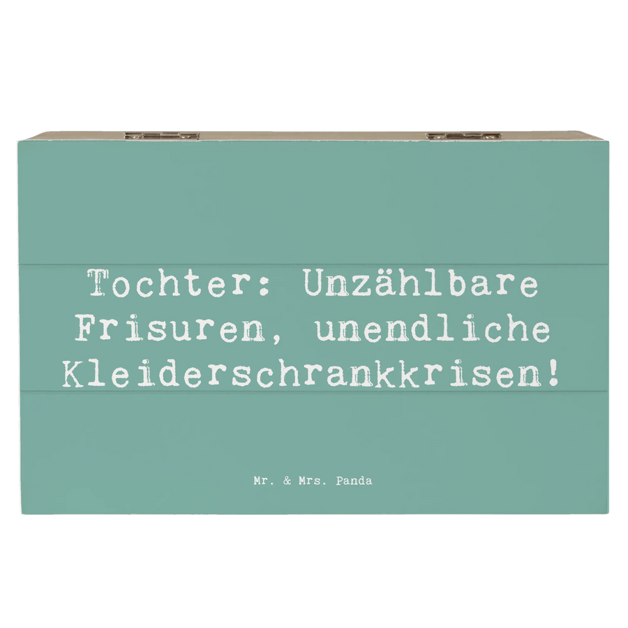 Die wunderschöne Holzkiste von Mr. & Mrs. Panda ist das perfekte Geschenk für Deine Tochter! Diese zauberhafte Erinnerungskiste, bedruckt mit dem liebevollen Spruch "Tochter: Unzählbare Frisuren, unendliche Kleiderschrankkrisen!", bringt nicht nur Freude, sondern ist auch ein stilvoller Aufbewahrungsort für all Deine Schätze.