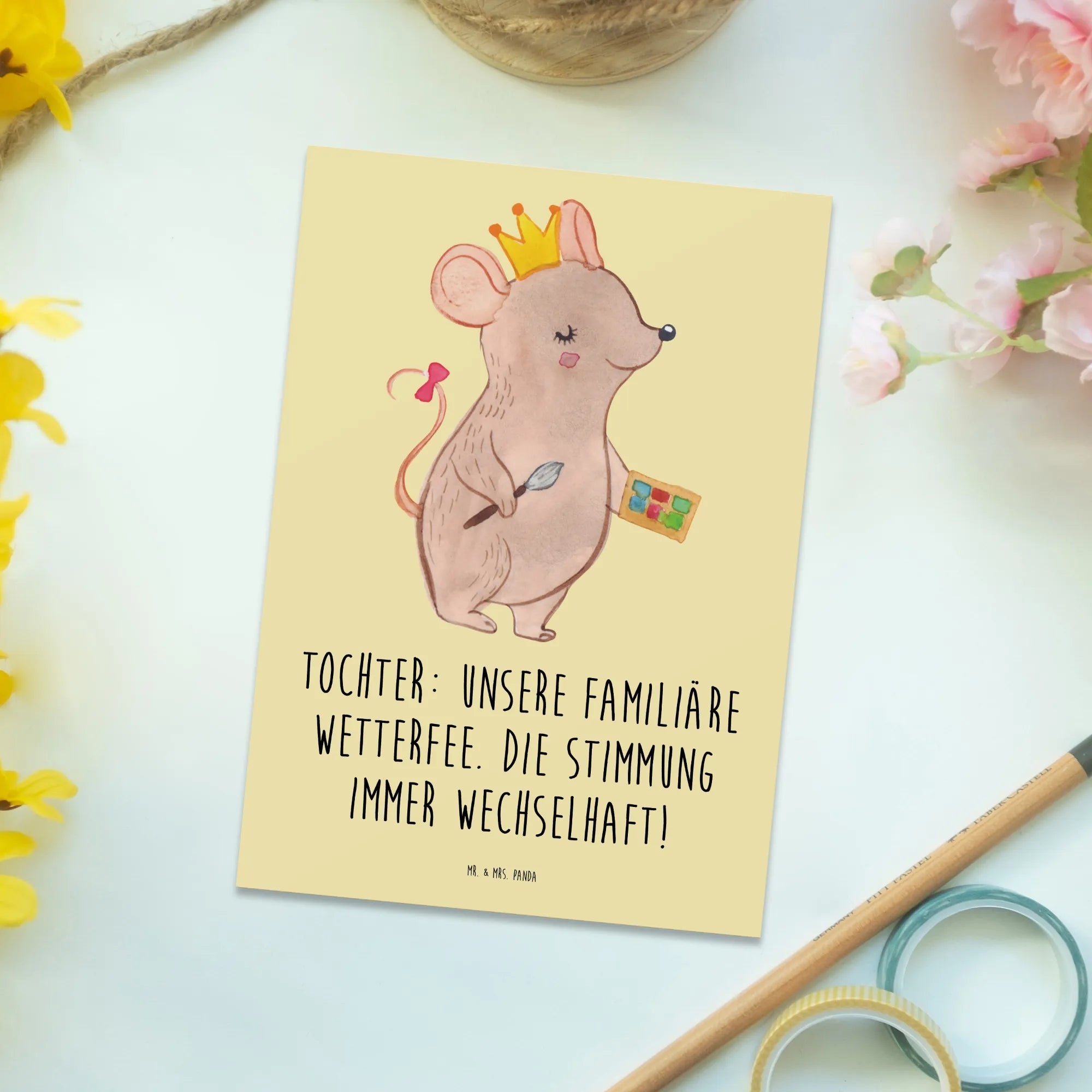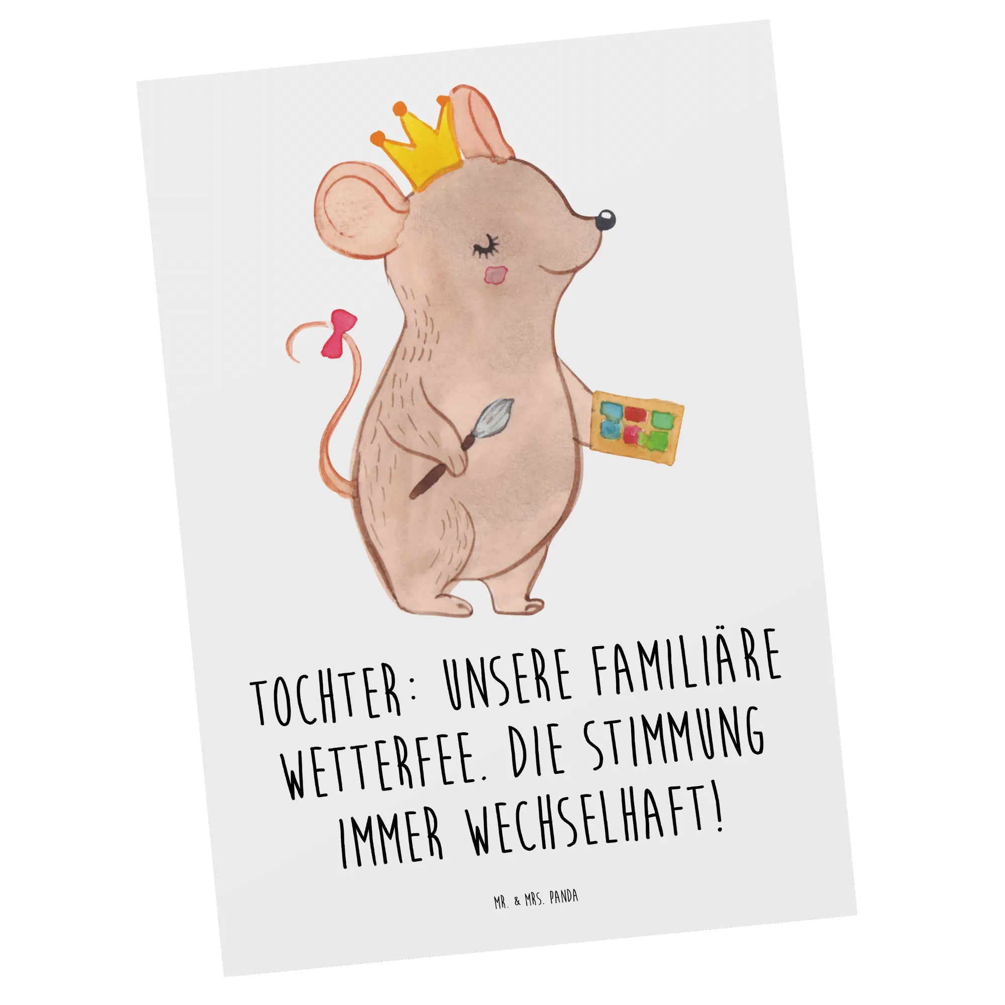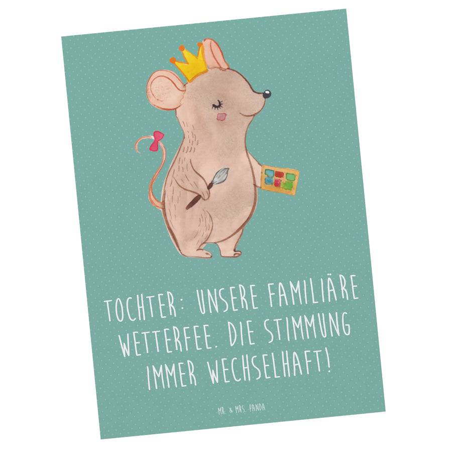 Die Postkarte 'Tochter: Unsere familiäre Wetterfee. Die Stimmung immer wechselhaft!' aus der liebevollen Kollektion von Mr. & Mrs. Panda ist das perfekte Geschenk für alle, die das Besondere in ihrem Familienleben schätzen. Diese einzigartige Postkarte, die in einem charmanten Design daherkommt, ist nicht nur ein einfacher Gruß, sondern ein Ausdruck der Liebe und des Stolzes, den wir für unsere Töchter empfinden. Ideal für zahlreiche Anlässe, sei es zum Geburtstag, als Dankeskarte oder einfach als kleine Aufmunterung zwischendurch. Diese Karte ist genau das richtige, um deiner Tochter zu zeigen, wie sehr sie geschätzt wird und wie wichtig sie in deinem Leben ist. Die kreative Botschaft 'Unsere familiäre Wetterfee' zusammen mit den witzigen Illustrationen bringt garantiert ein Lächeln ins Gesicht deiner Tochter!