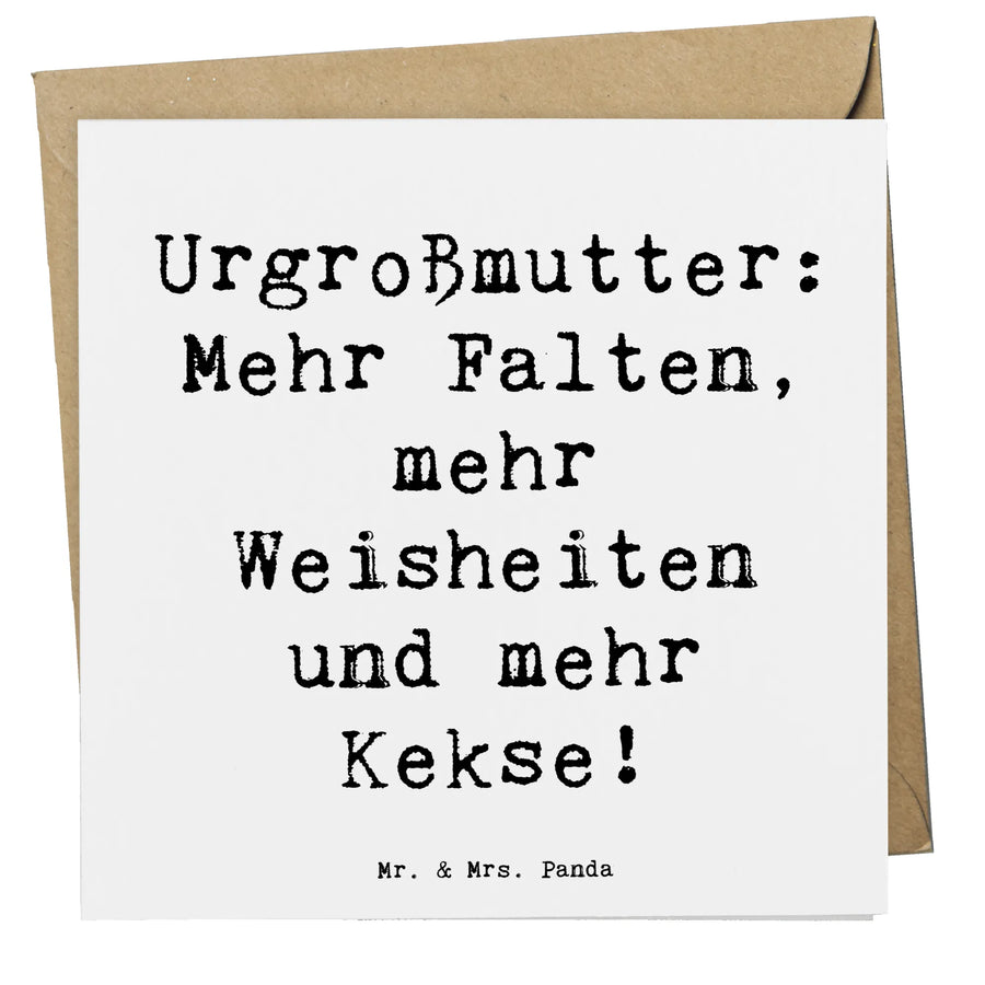 Die Deluxe Karte "Urgroßmutter" von Mr. & Mrs. Panda ist das perfekte Geschenk für all jene, die Familientraditionen und die Geschichten ihrer Vorfahren schätzen. Mit ihrem charmanten Spruch "Urgoßmutter: Mehr Falten, mehr Weisheiten und mehr Kekse!" zaubert diese Grußkarte ein Lächeln auf das Gesicht jedes Empfängers.