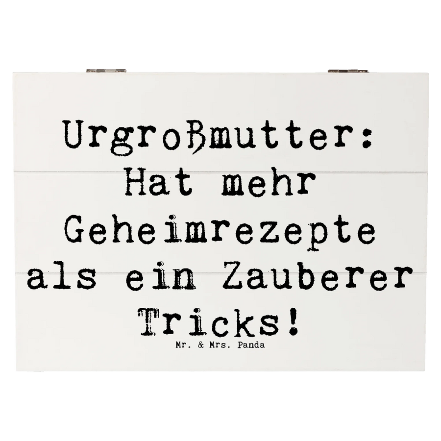 Entdecke die liebevoll gestaltete Holzkiste von Mr. & Mrs. Panda mit dem zauberhaften Motiv "Urgroßmutter: Hat mehr Geheimrezepte als ein Zauberer Tricks!" Diese wunderschöne Holzkiste ist nicht nur ein einzigartiges Deko-Element, sondern auch ein praktischer Aufbewahrungsort für all Deine wertvollen Schätze und Erinnerungen.