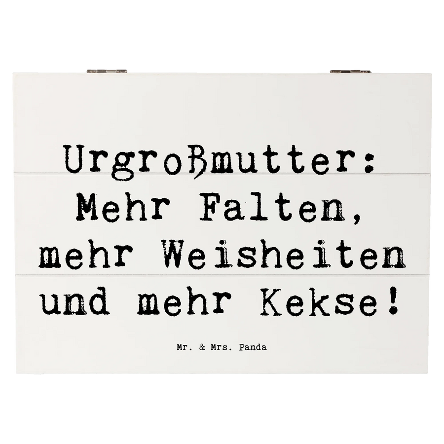 Die Holzkiste "Urgroßmutter: Mehr Falten, mehr Weisheiten und mehr Kekse!" von Mr. & Mrs. Panda ist das perfekte Geschenk für alle, die ihre Wurzeln ehren und die kostbaren Erinnerungen an die Urgroßmutter lebendig halten möchten. Diese wunderschöne Holzkiste ist nicht nur ein Blickfang, sondern auch ein idealer Aufbewahrungsort für Schätze, Erinnerungen und Traditionen, die von Generation zu Generation weitergegeben werden. Mit einem charmanten Design und einem liebevollen Spruch, der das Herz erwärmt, ist sie ein wunderbares Familienerbstück.