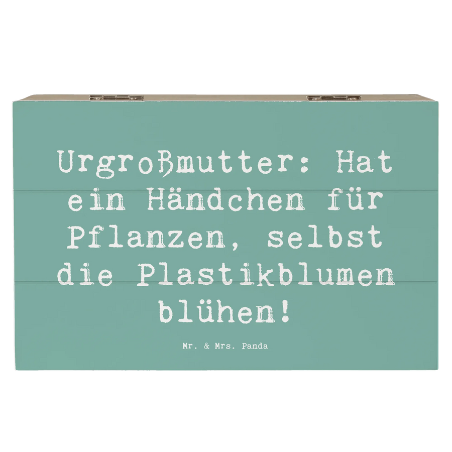 Mit dem charmanten Spruch "Urgroßmutter: Hat ein Händchen für Pflanzen, selbst die Plastikblumen blühen!" wird deine Kiste zu einem einzigartigen Stück, das Geschichten erzählt und Generationen überdauert. Familie und Urgroßmutter – das sind zwei Begriffe, die untrennbar miteinander verbunden sind.