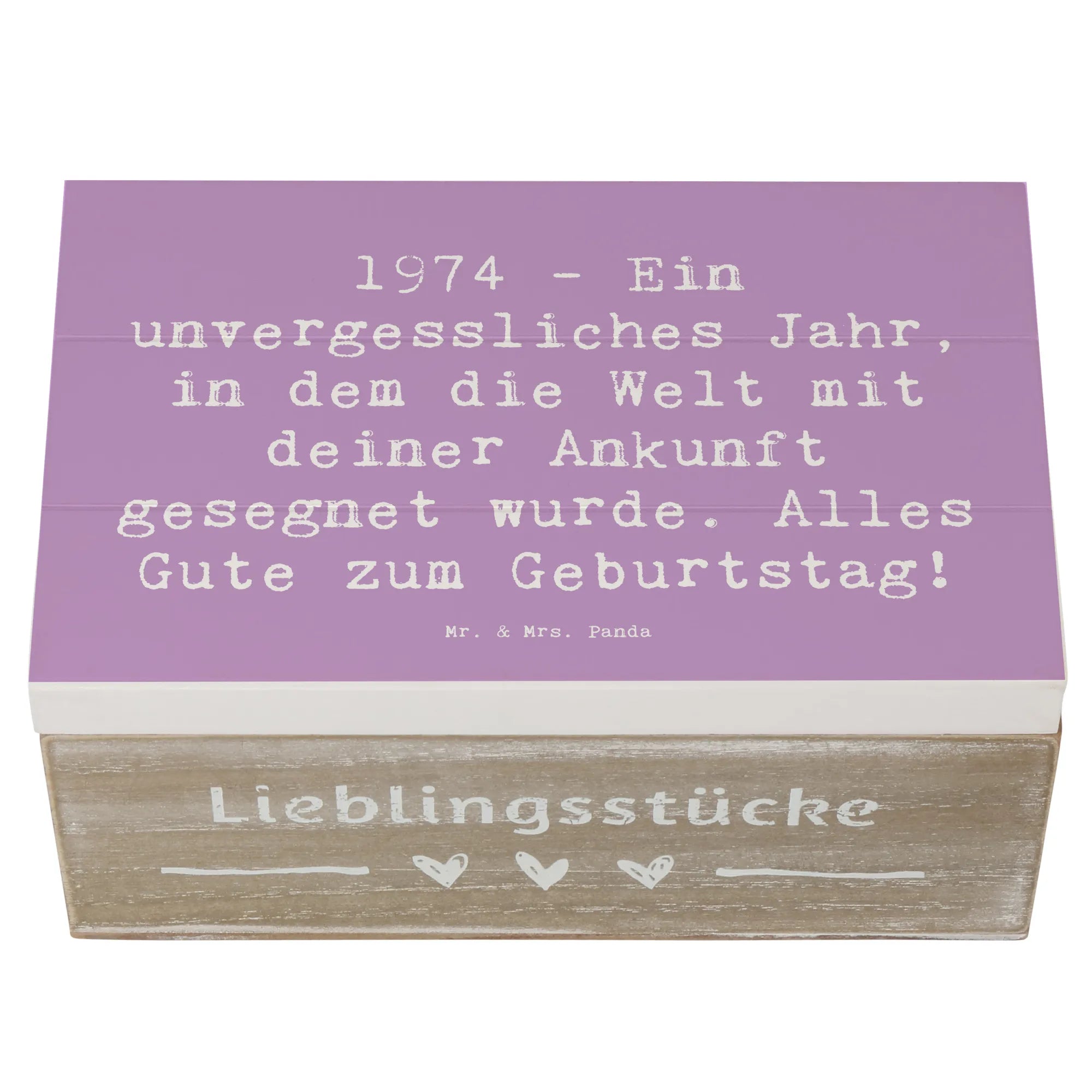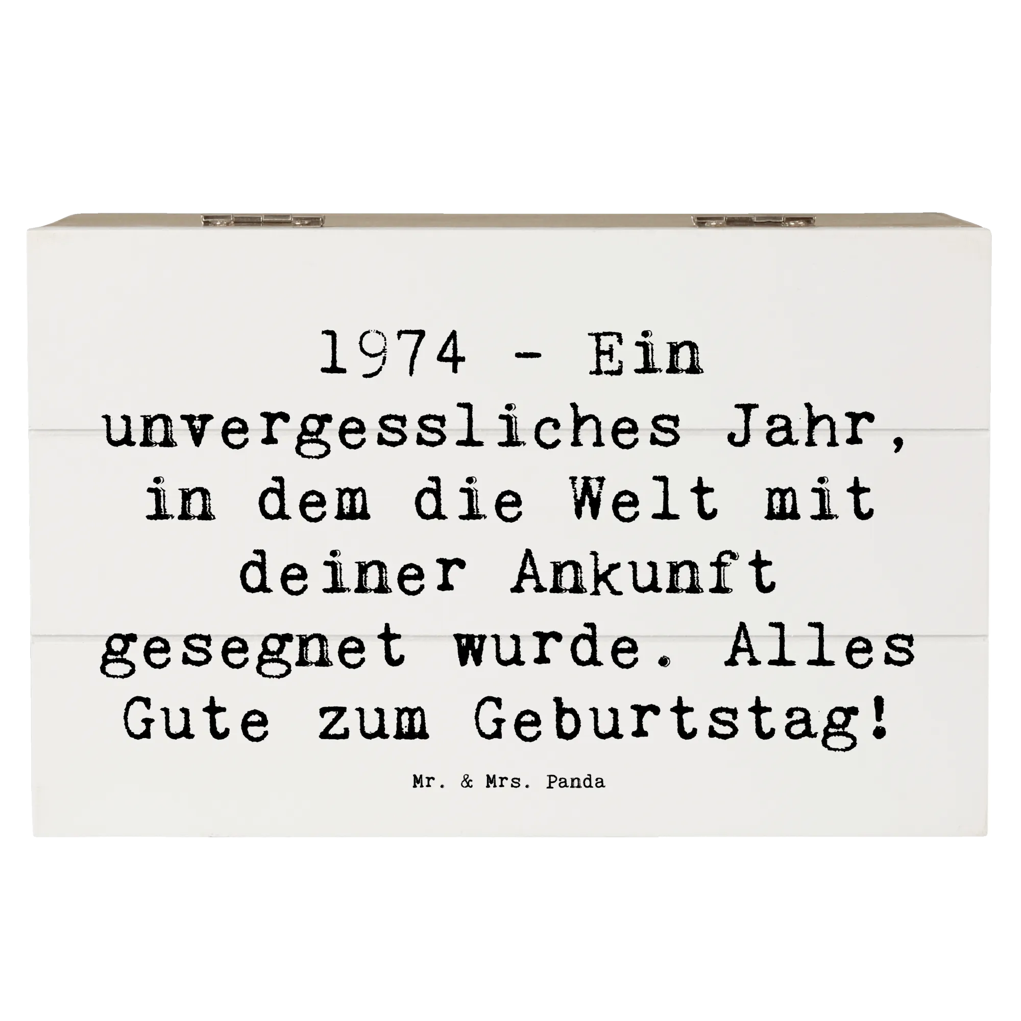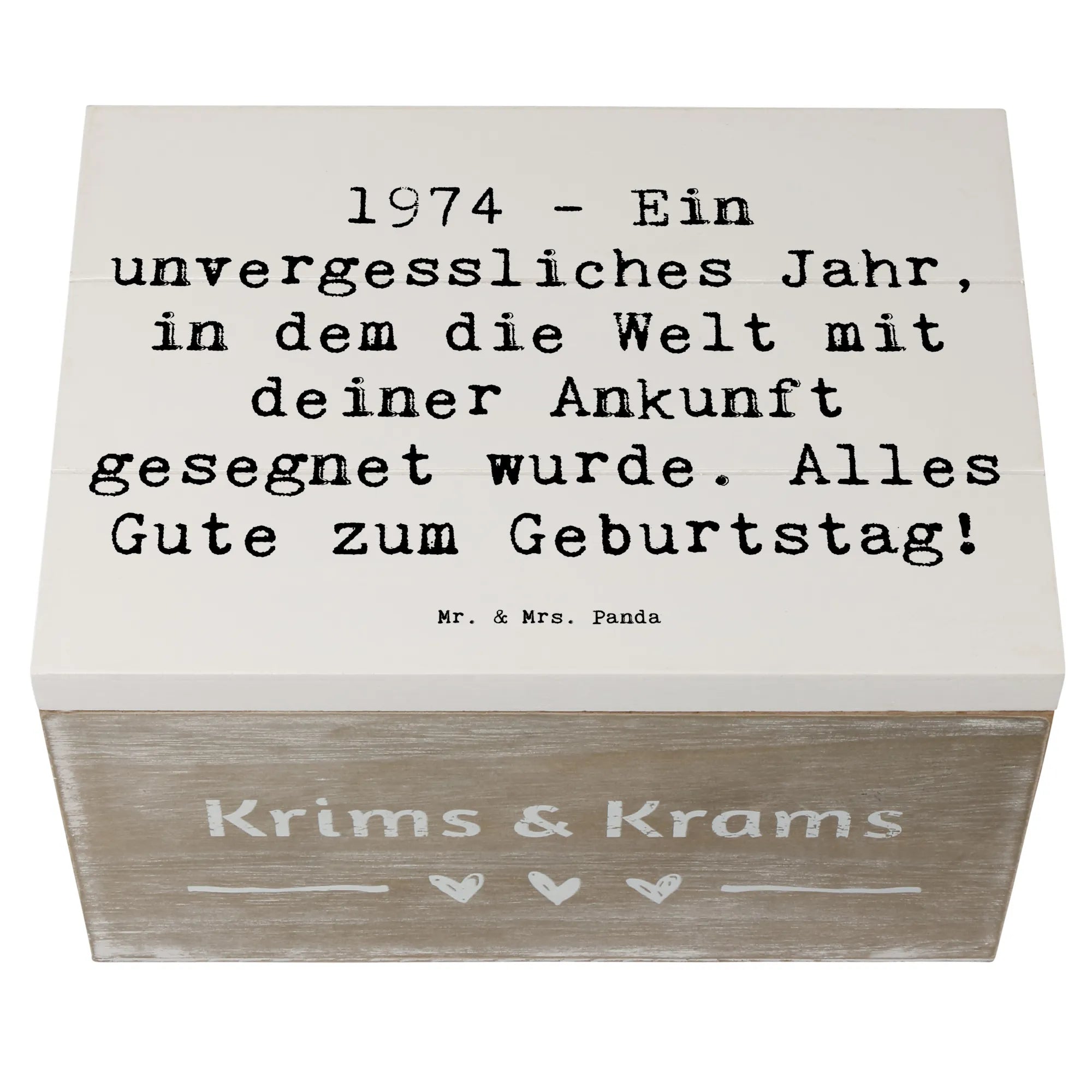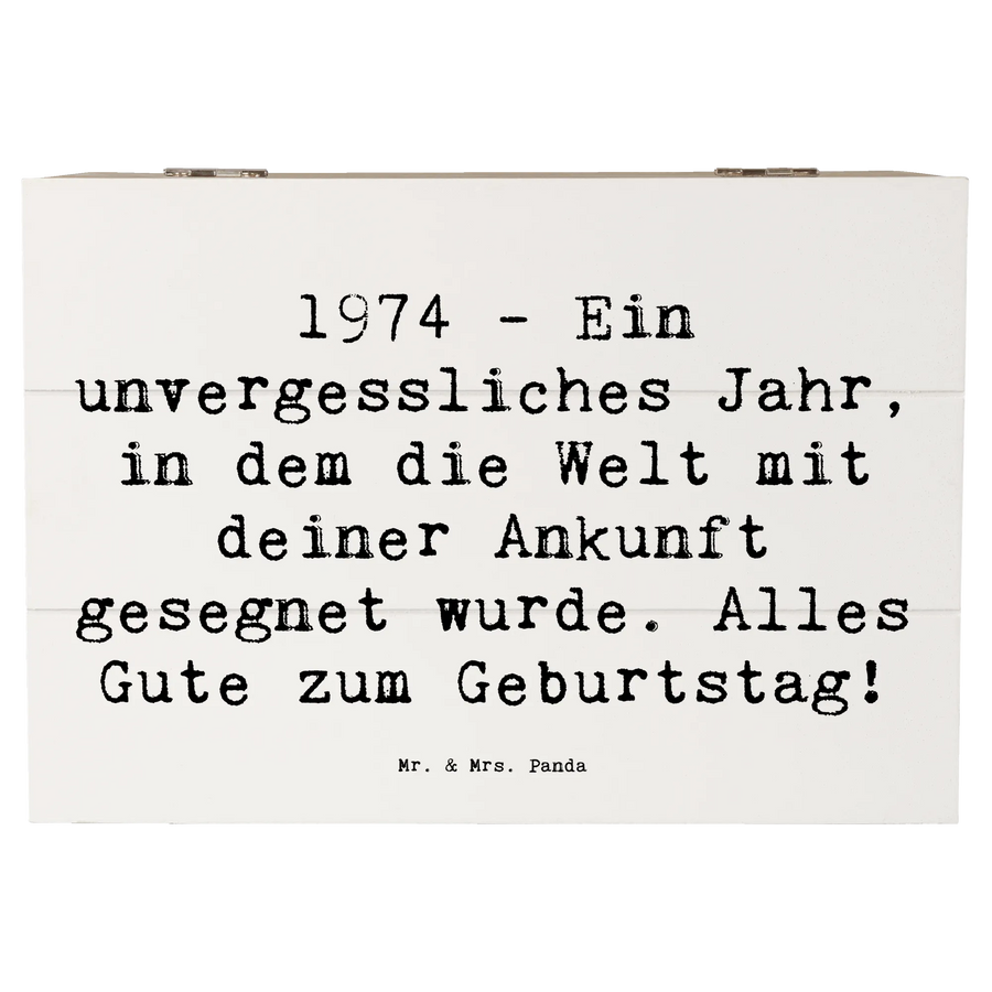 Entdecke die liebevolle Holzkiste "1974 Geburtstag" von Mr. & Mrs. Panda! Diese wunderschöne Kiste ist nicht nur ein Aufbewahrungsort für all deine wertvollen Schätze, sondern auch ein einzigartiges Geschenk, das mit viel Liebe zum Detail gestaltet wurde.