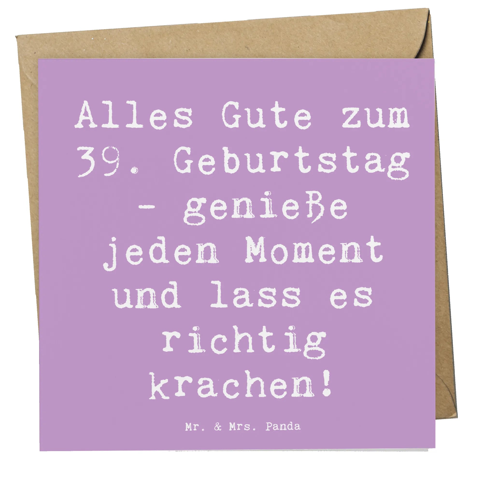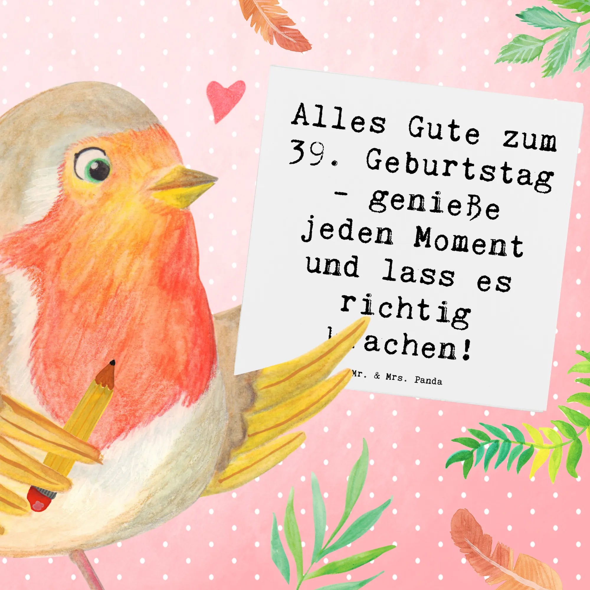 Entdecke die perfekte Grußkarte für den 39. Geburtstag von Mr. & Mrs. Panda! Unsere Deluxe Karte aus hochwertigem 300 Gramm Karton hat eine edel matt glänzende Vorderseite. Mit dem freudigen Spruch 'Alles Gute zum 39. Geburtstag - genieße jeden Moment und lass es richtig krachen!' machst du jedem Geburtstagskind eine Freude.